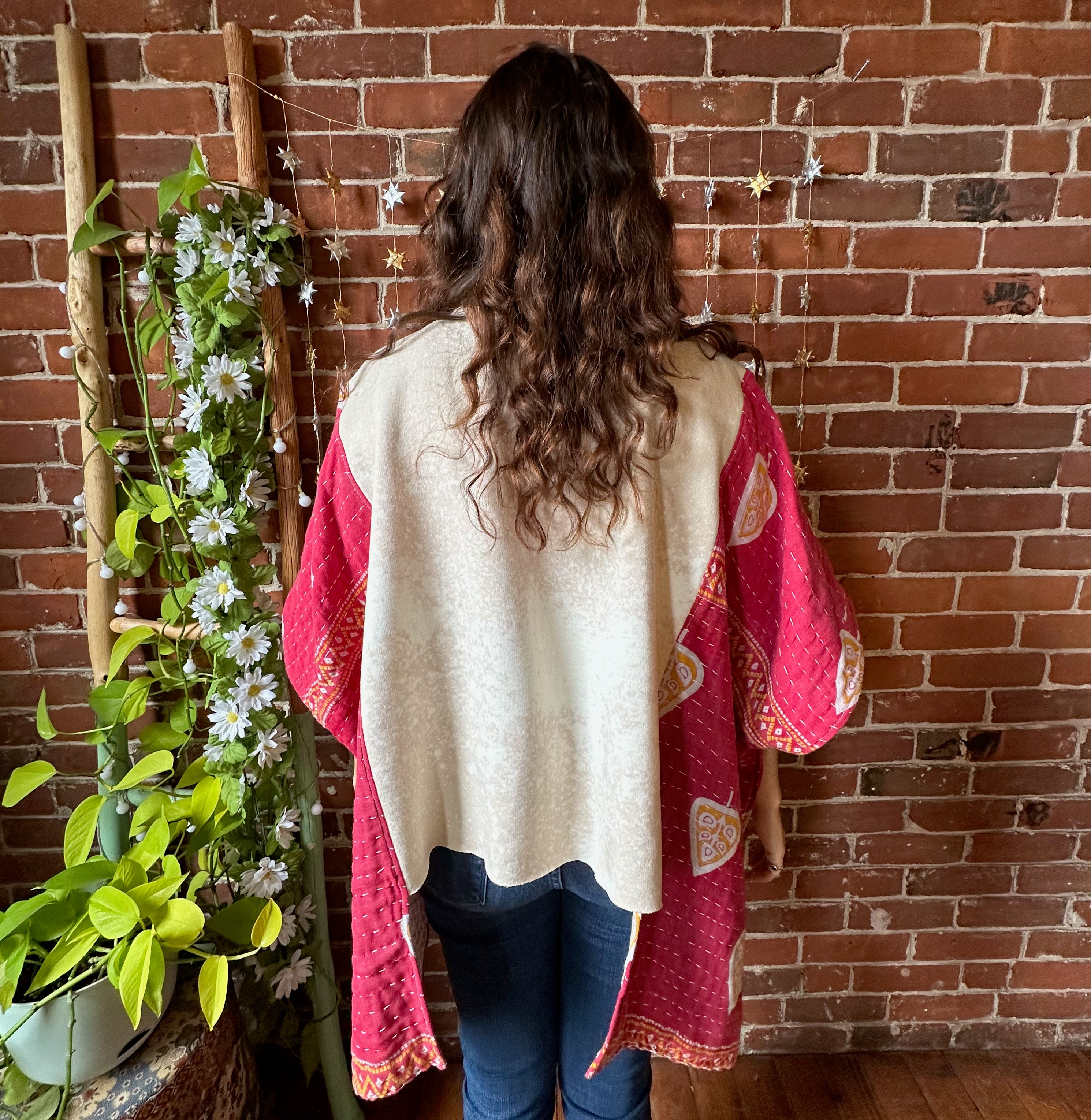 Upcycled cropped length raw hem sweatshirt and finished edge kantha.