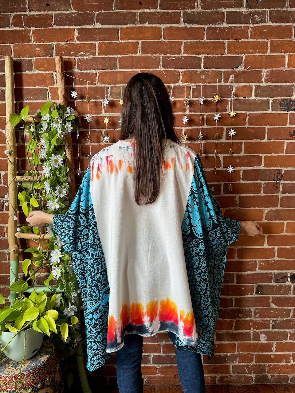 Say Hello to Boho in this unique flowy tshirt top. Made from an upcycled tshirt and featuring soft, flowy fabric sides in a botanical print. Perfect for concerts or everyday wear.