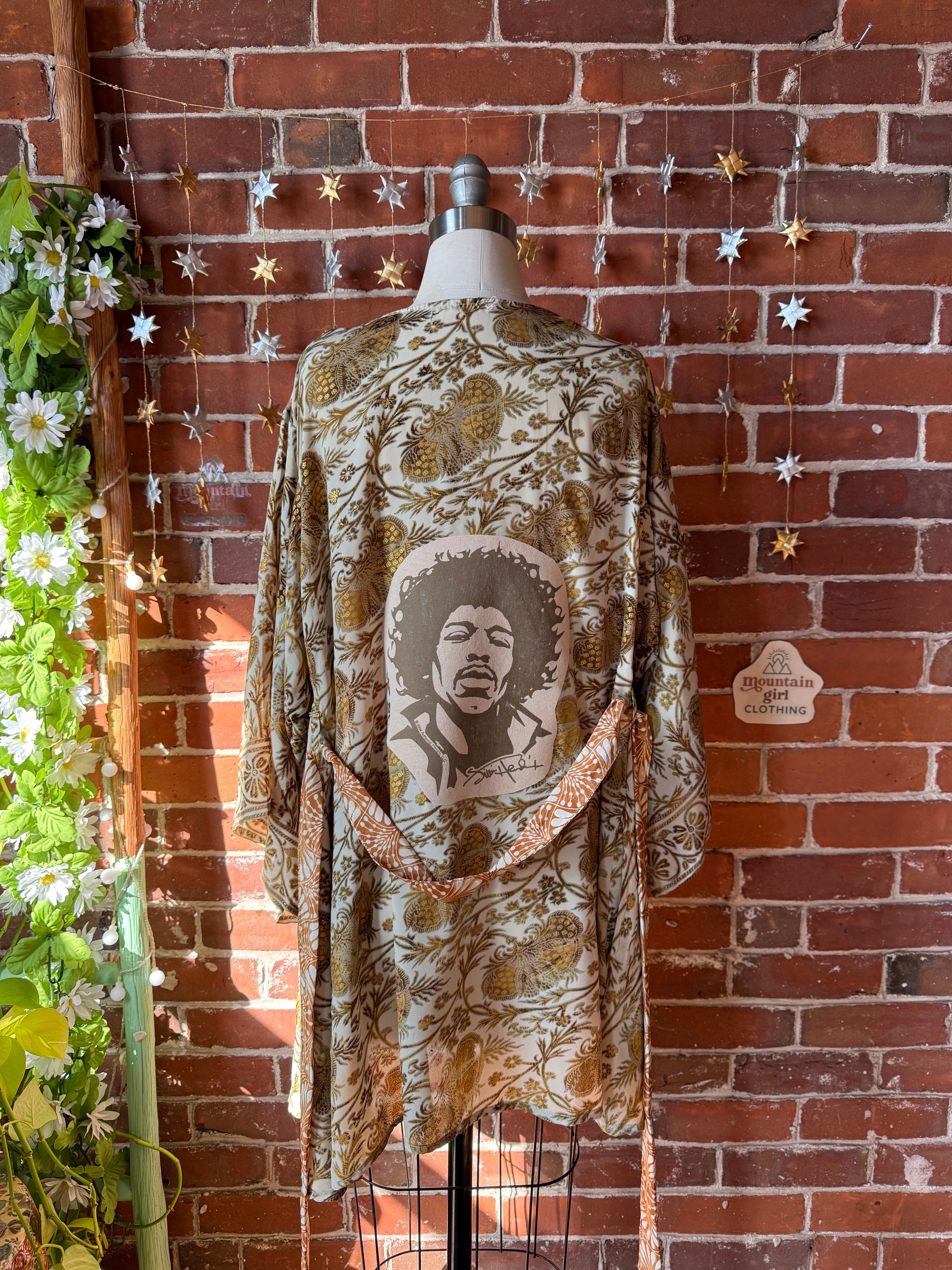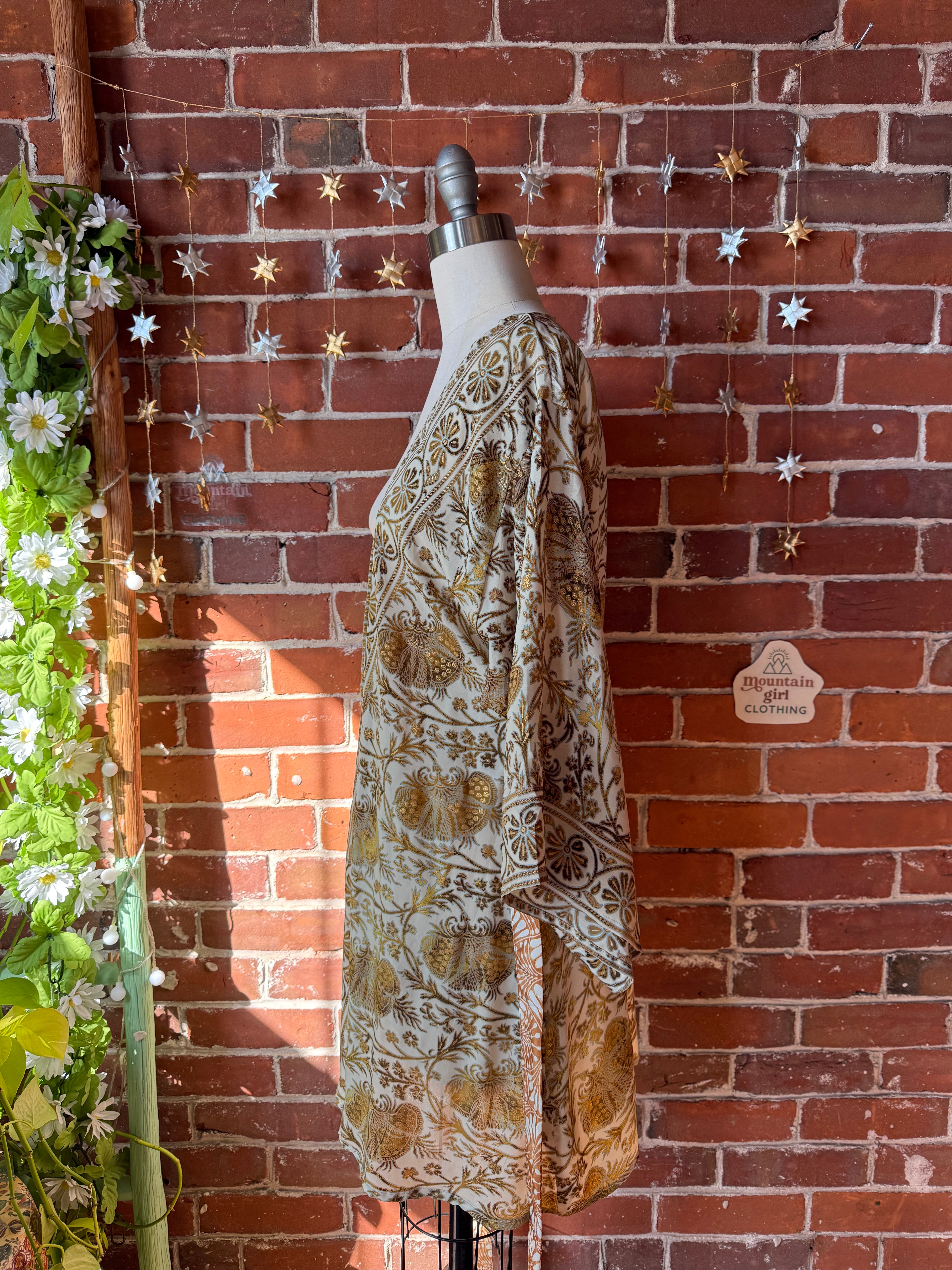 Experience the ultimate in comfort and style with this luxuriously soft handmade earthy kimono. Made with upcycled silk and designed in a lightweight boho cardigan silhouette, this versatile cover-up is perfect for any season. With a botanical-inspired aesthetic that goes with everything! Belt at the waist and It has pockets!