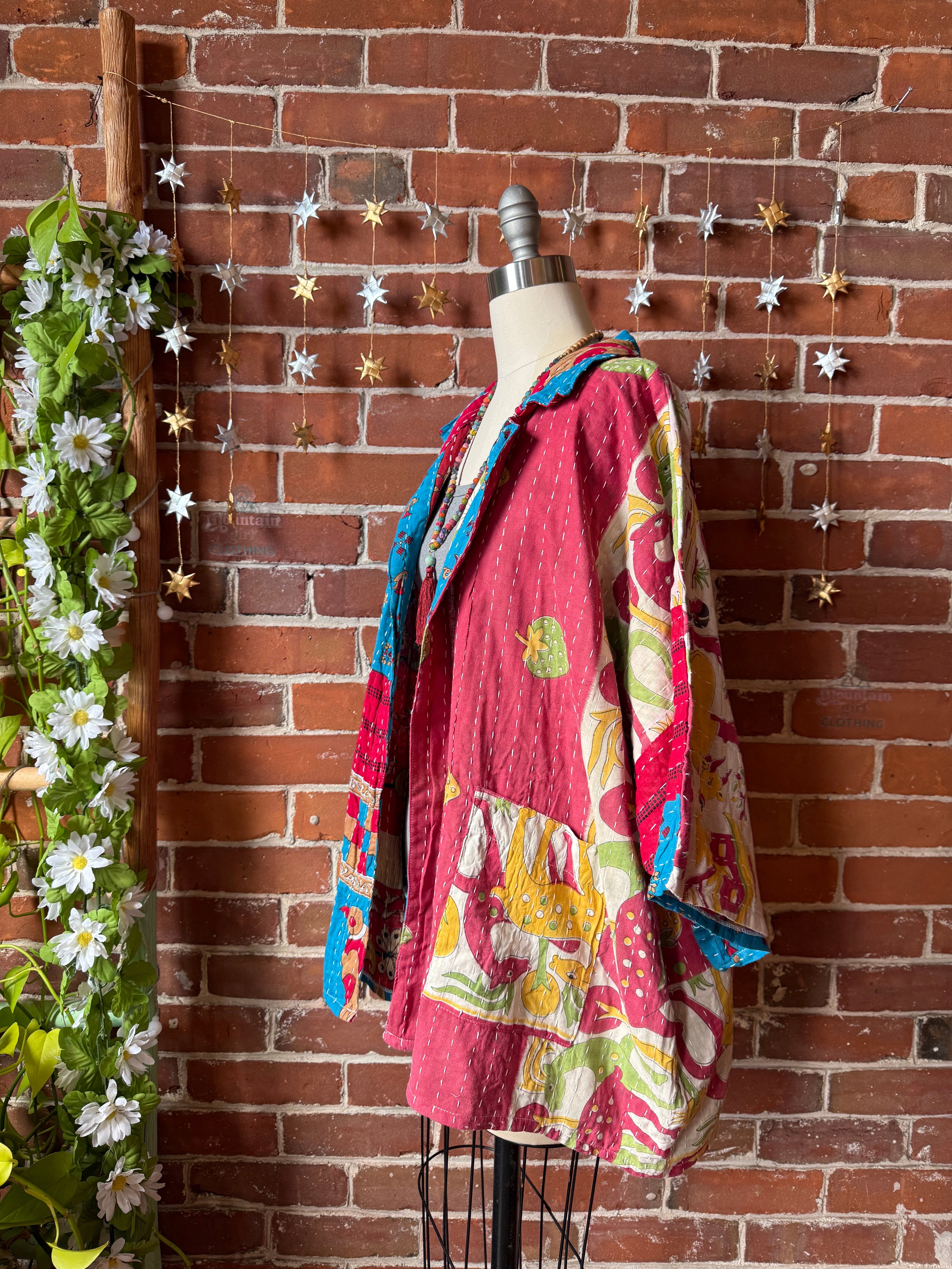 Soft lightweight Kantha jacket with collar and pockets at each side.