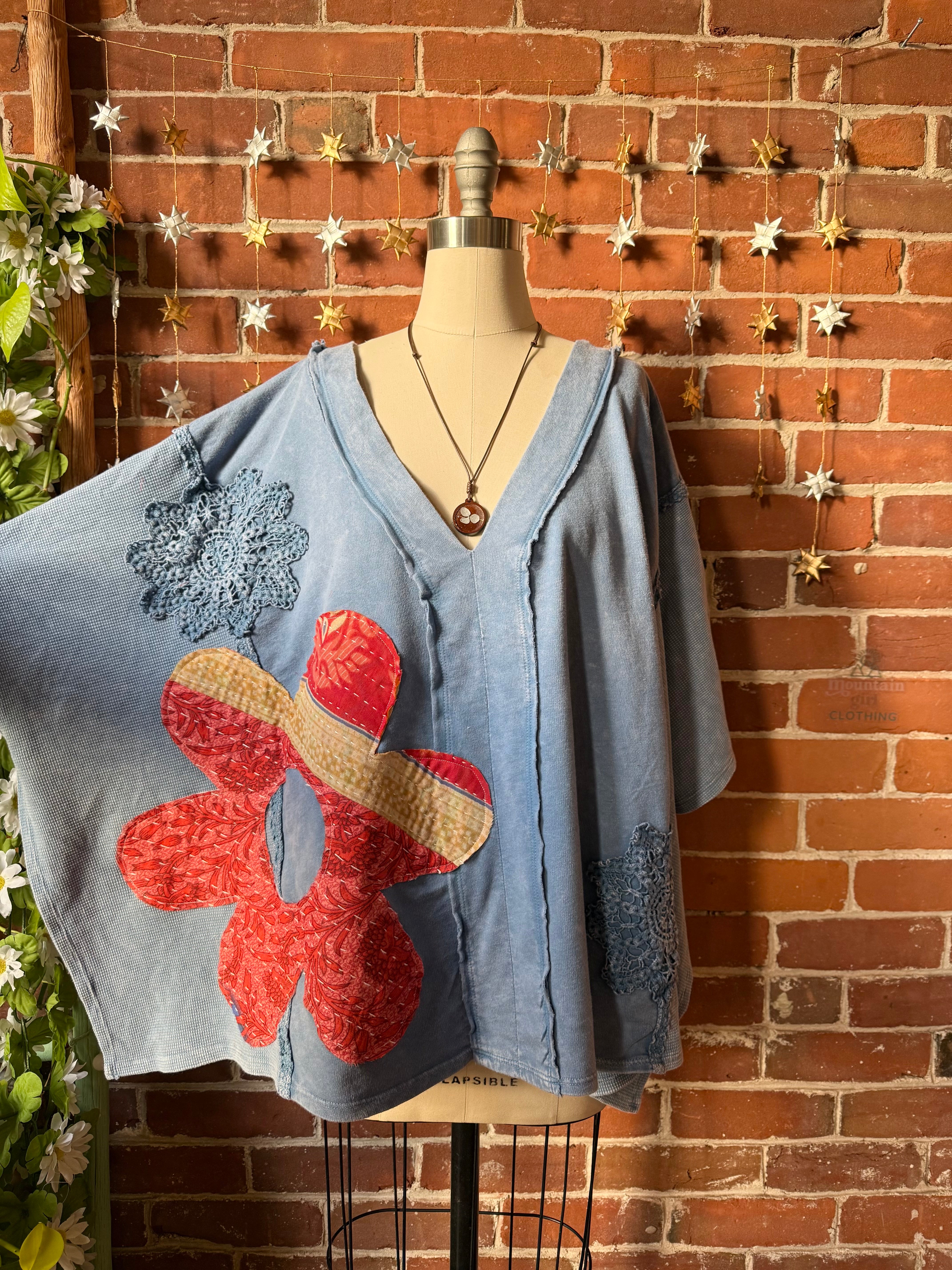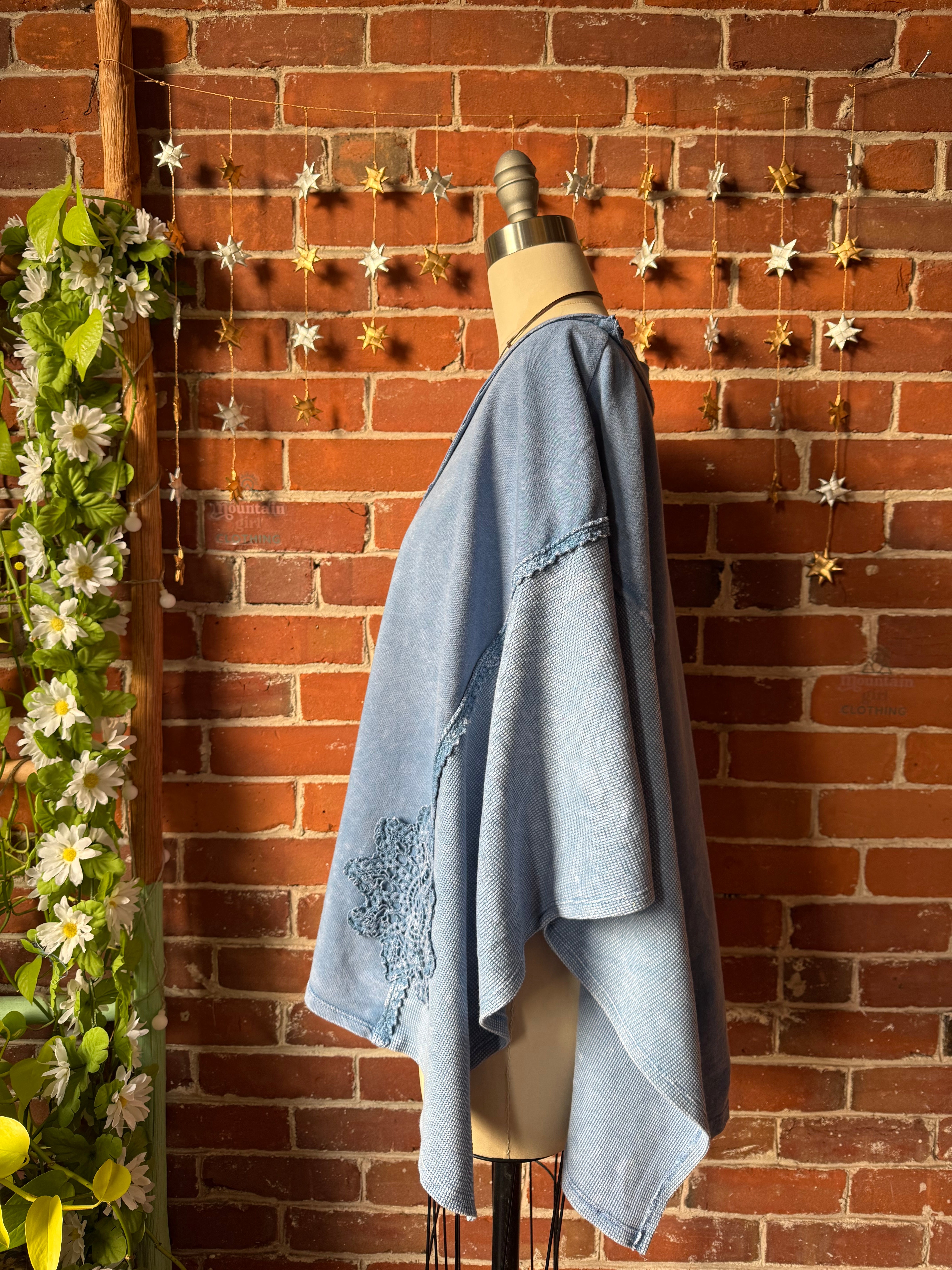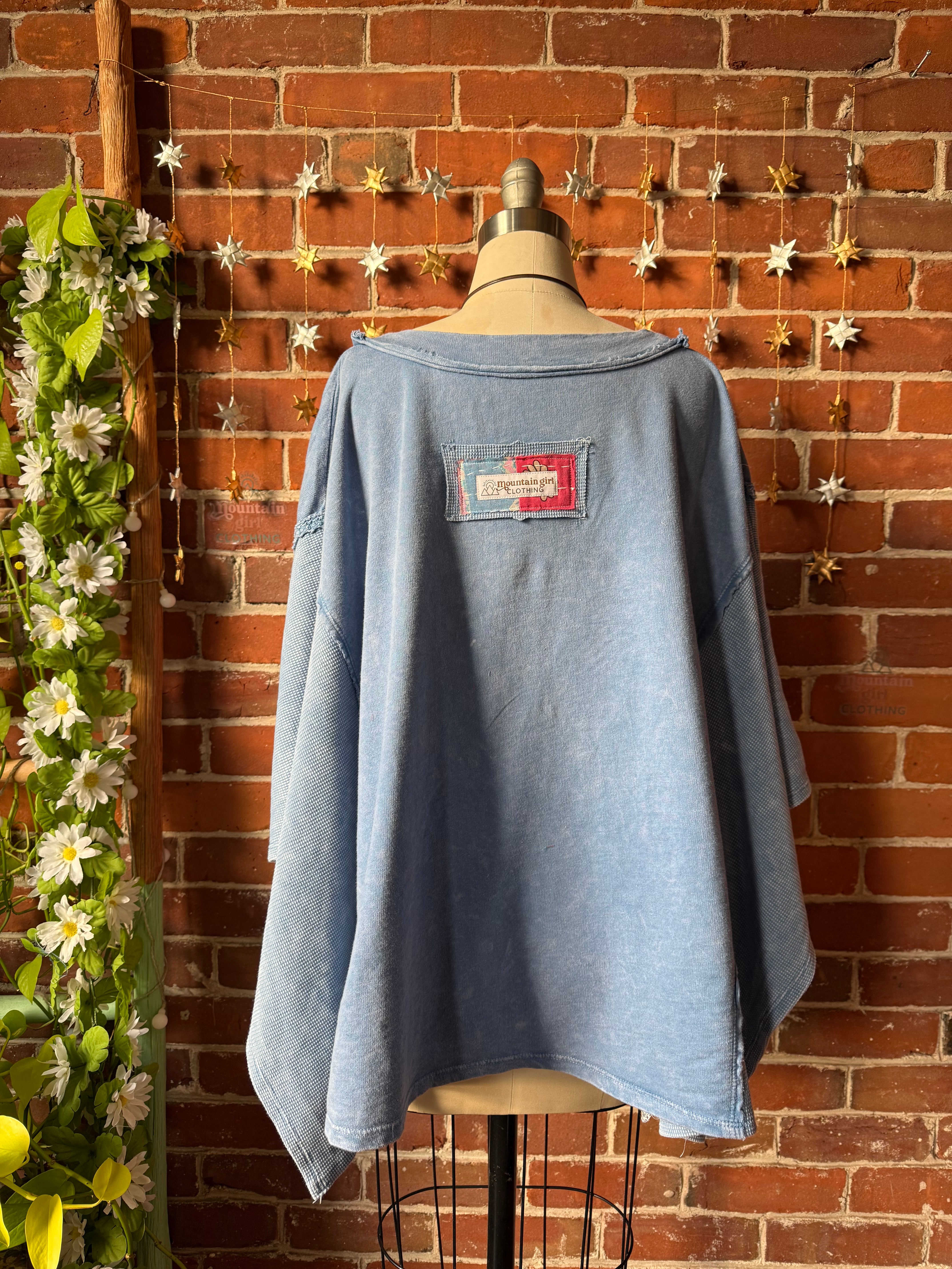 Upcycled flowy lightweight sweatshirt top and poncho sides with armholes.