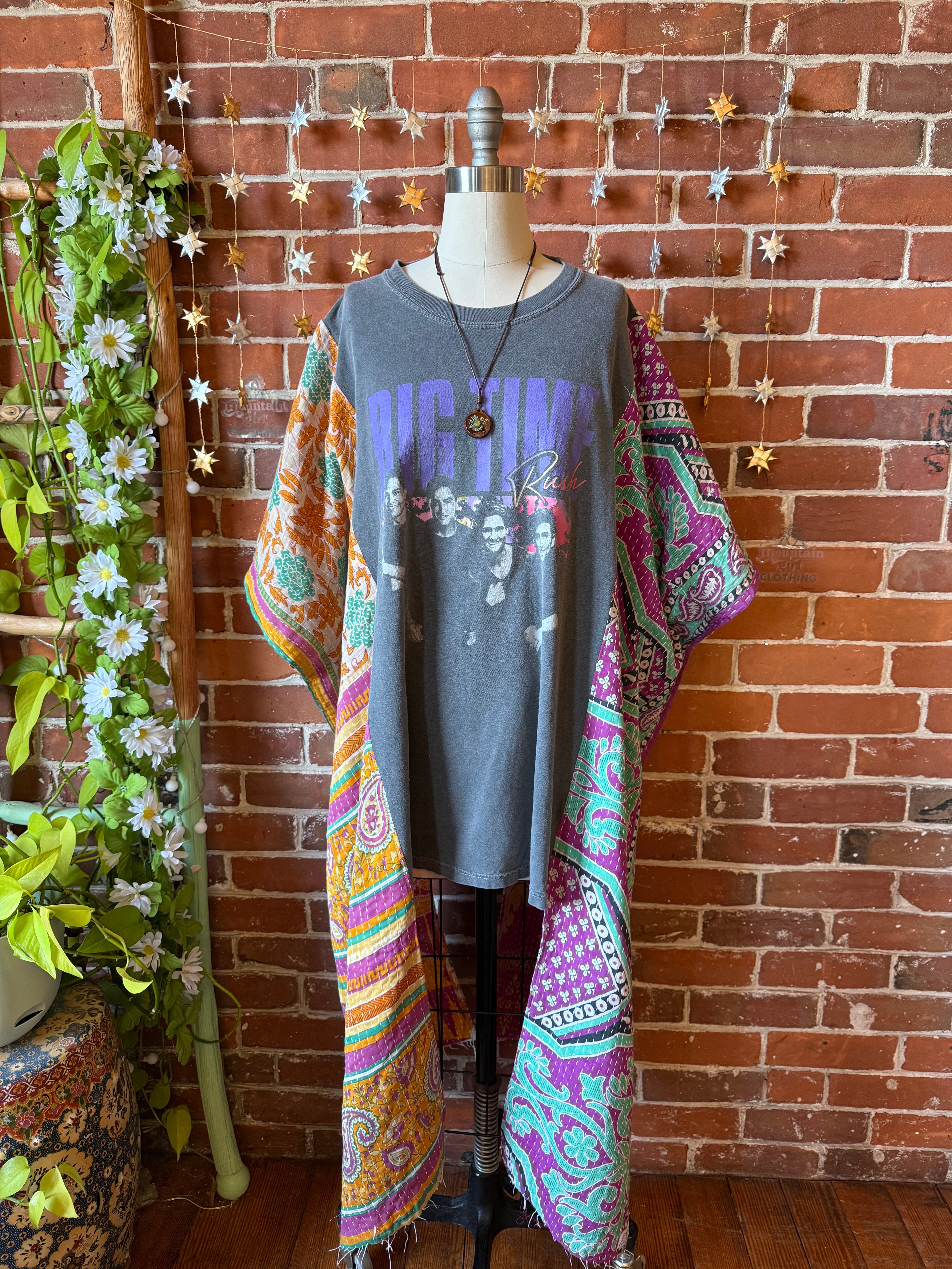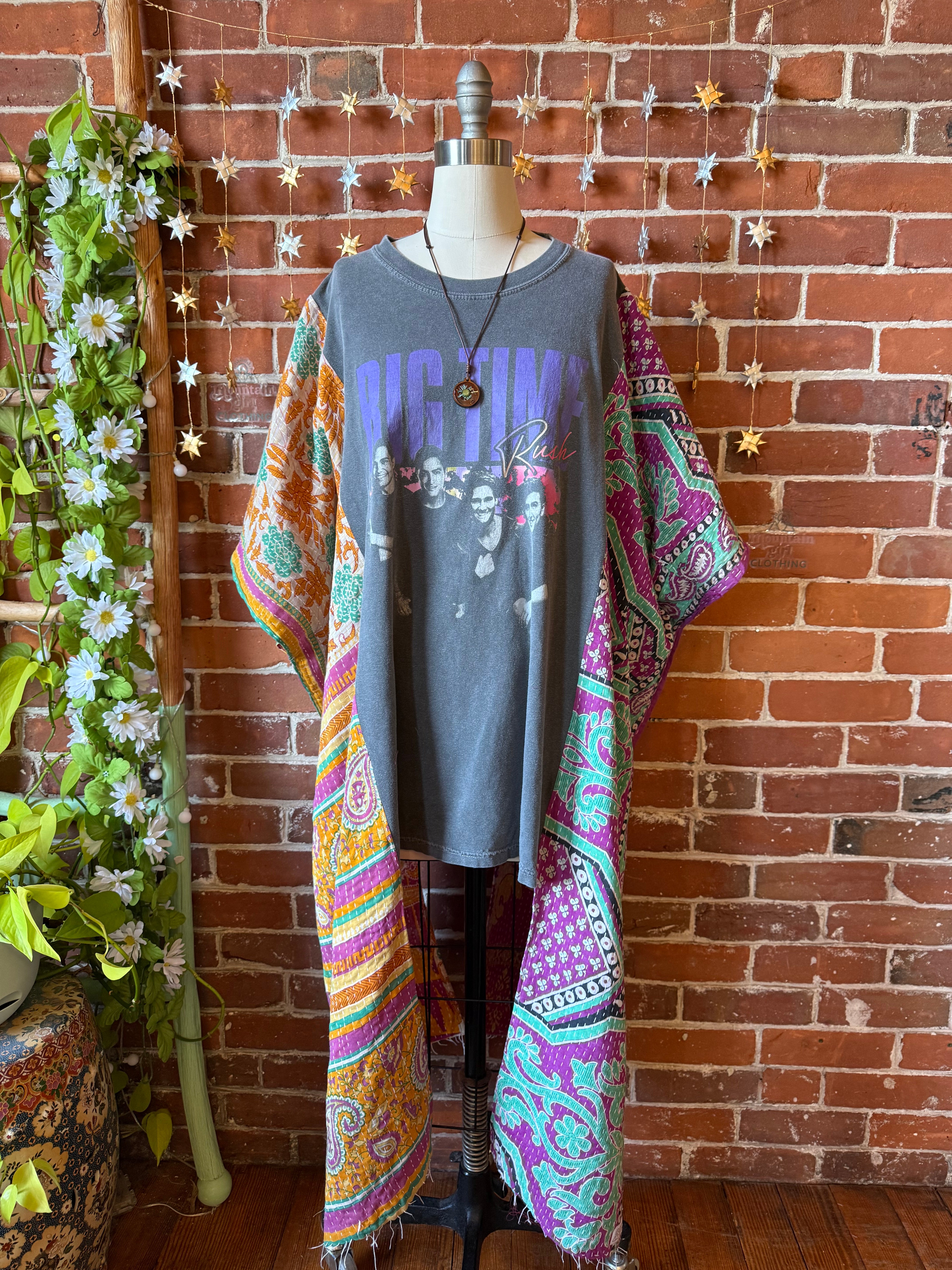 Upcycled poncho tee and kantha fabric at the sides, flowy fit with armholes at the sides.