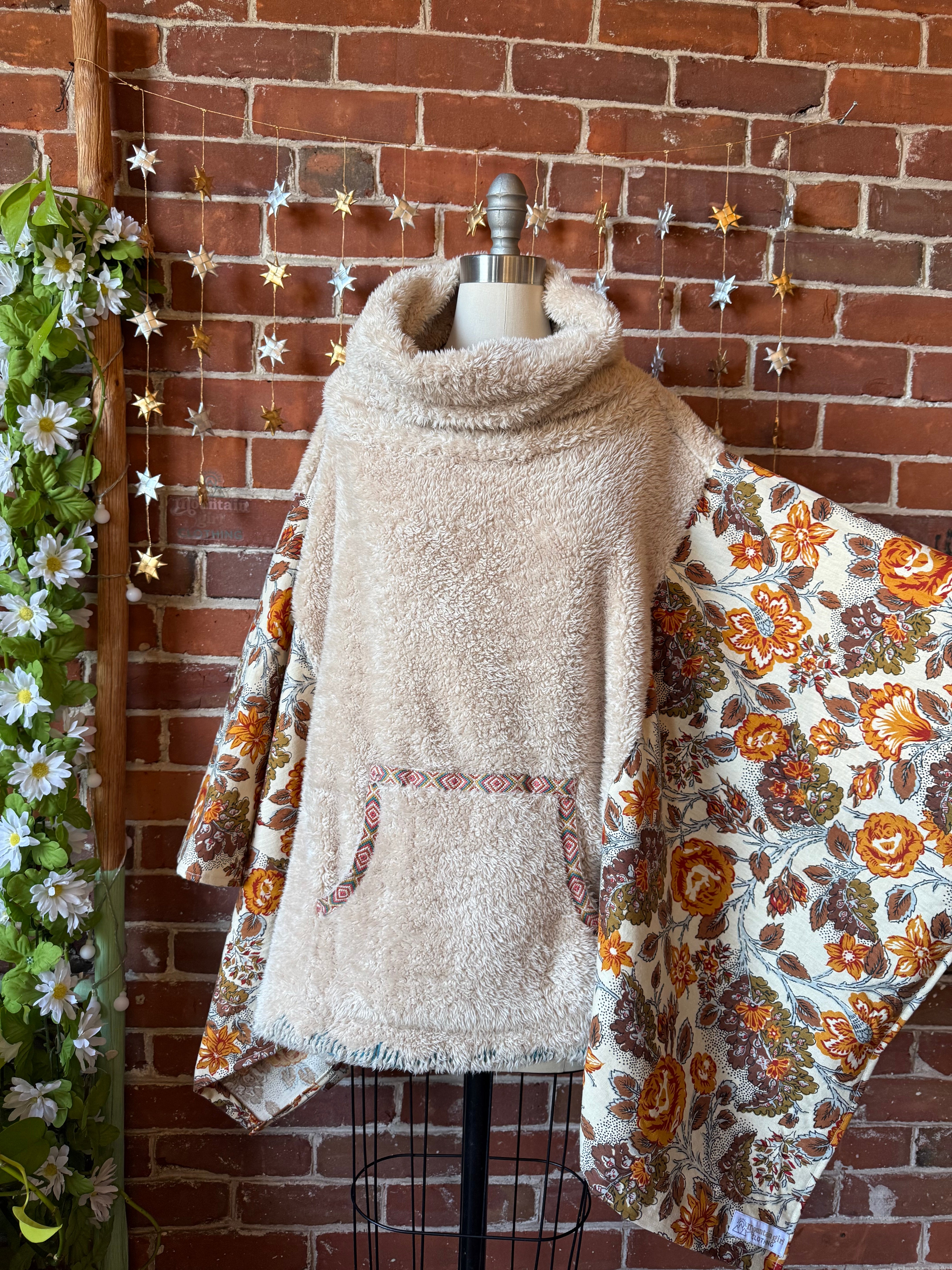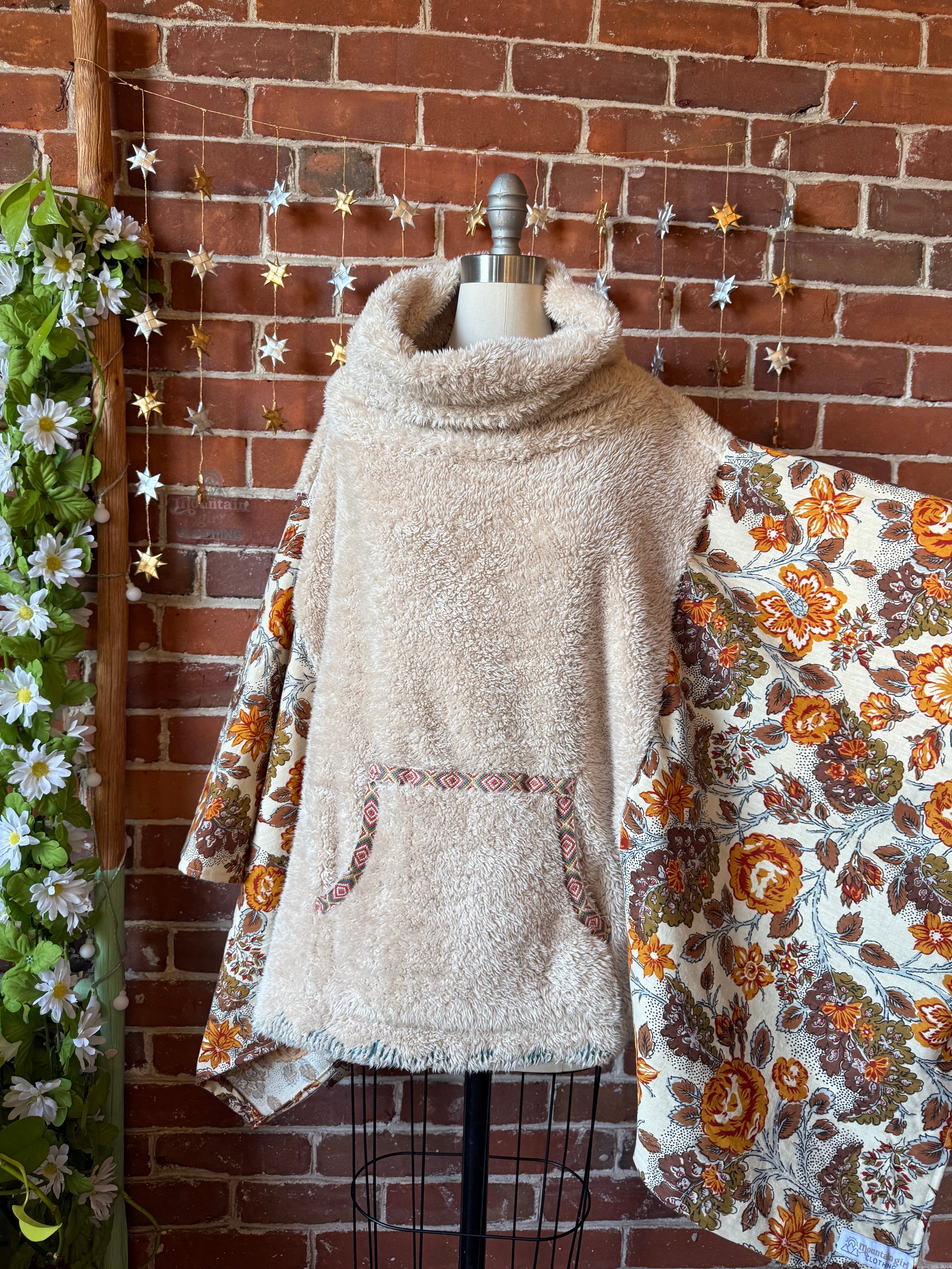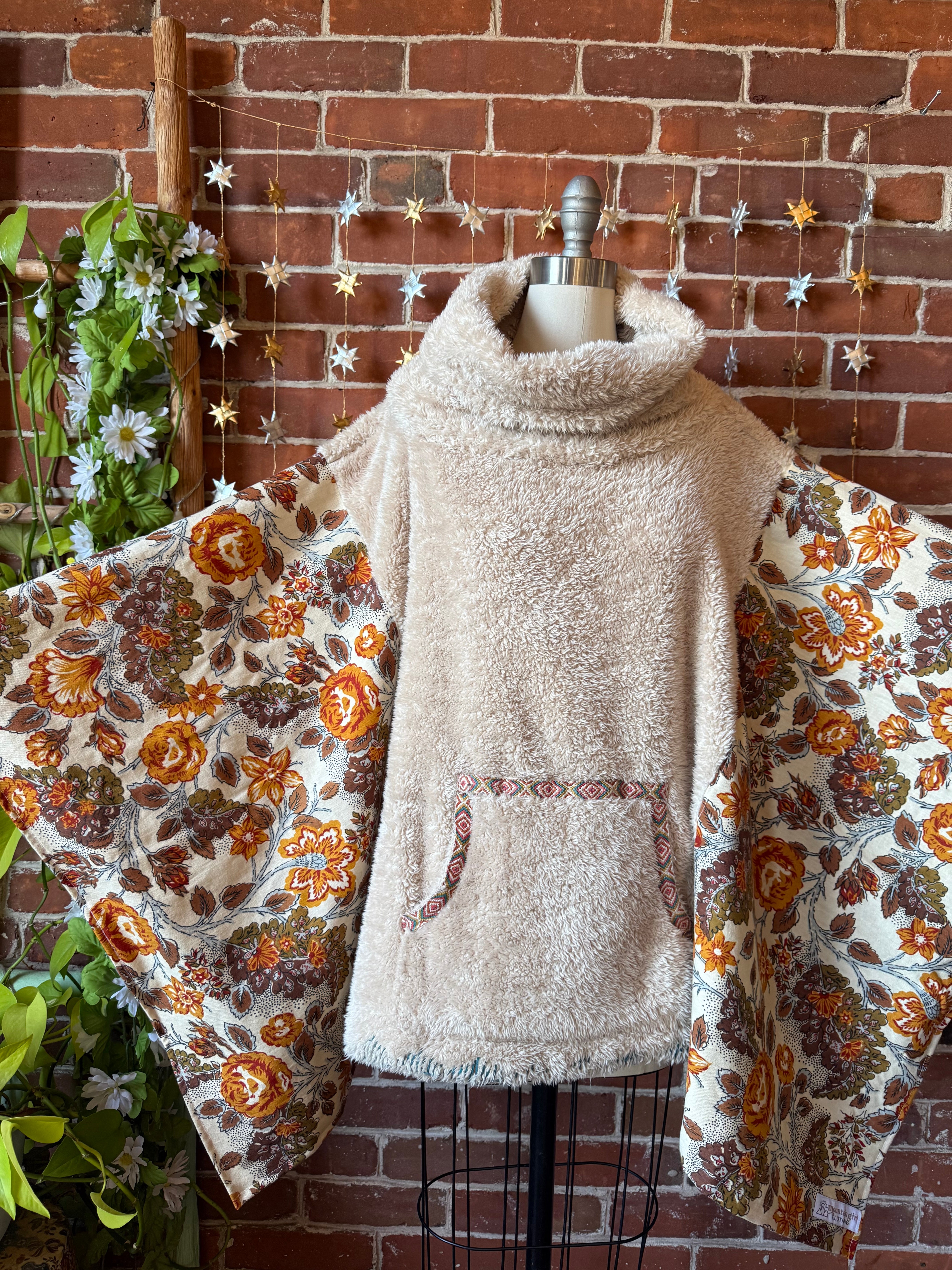 Upcycled oh so soft sherpa fleece with oversized collar and vintage fabric sides, With Armholes at the sides. Pocket in the front