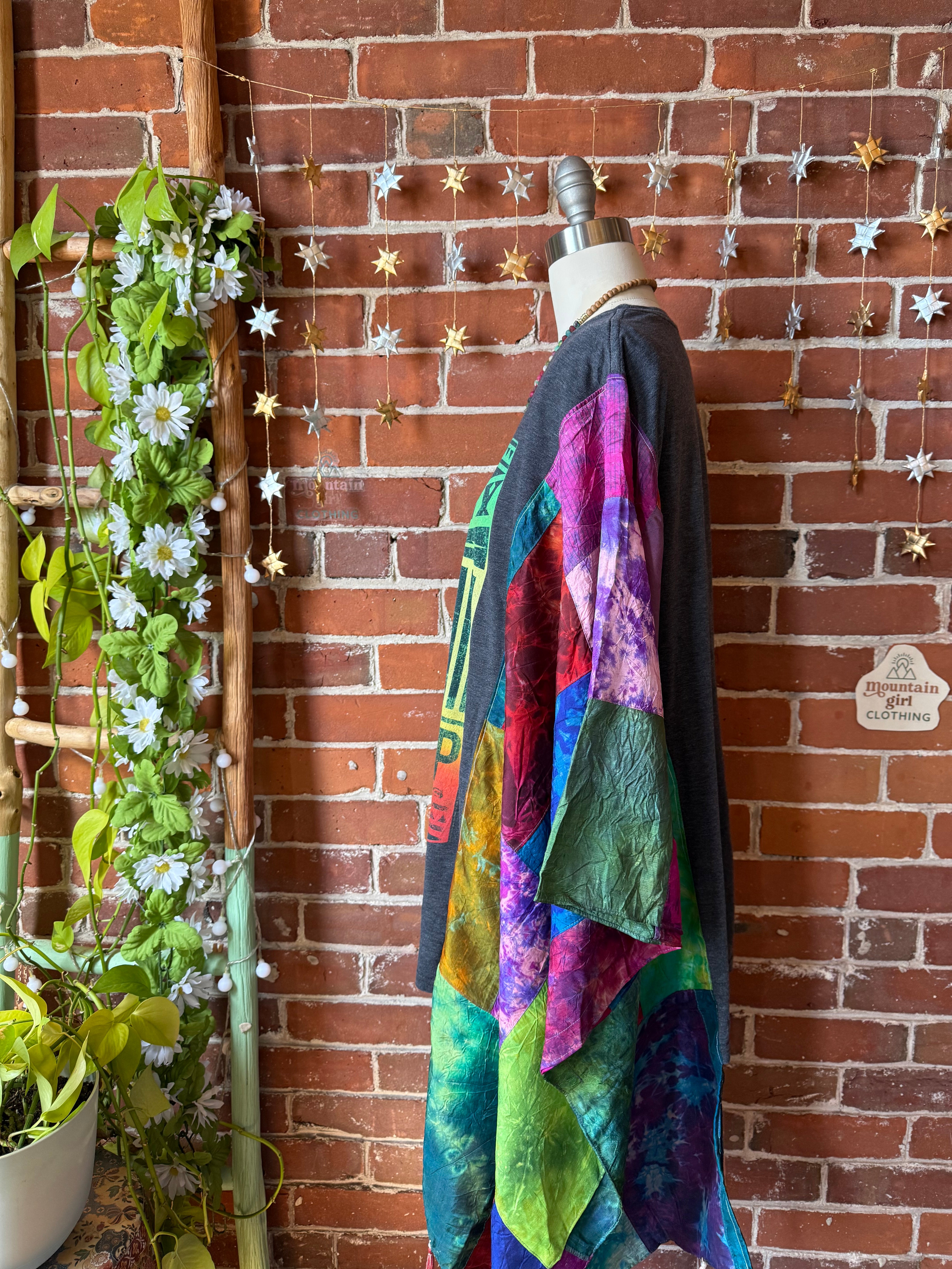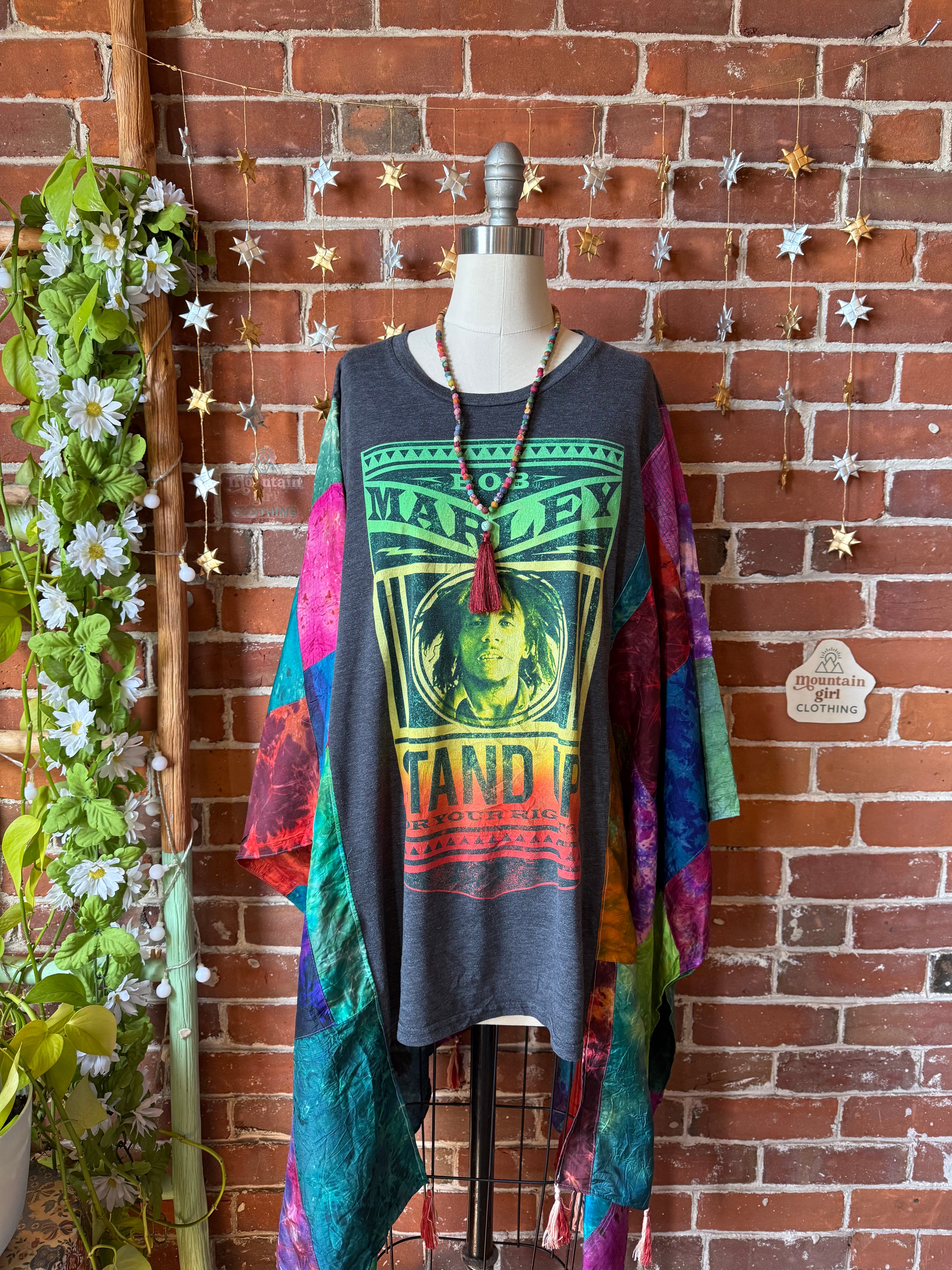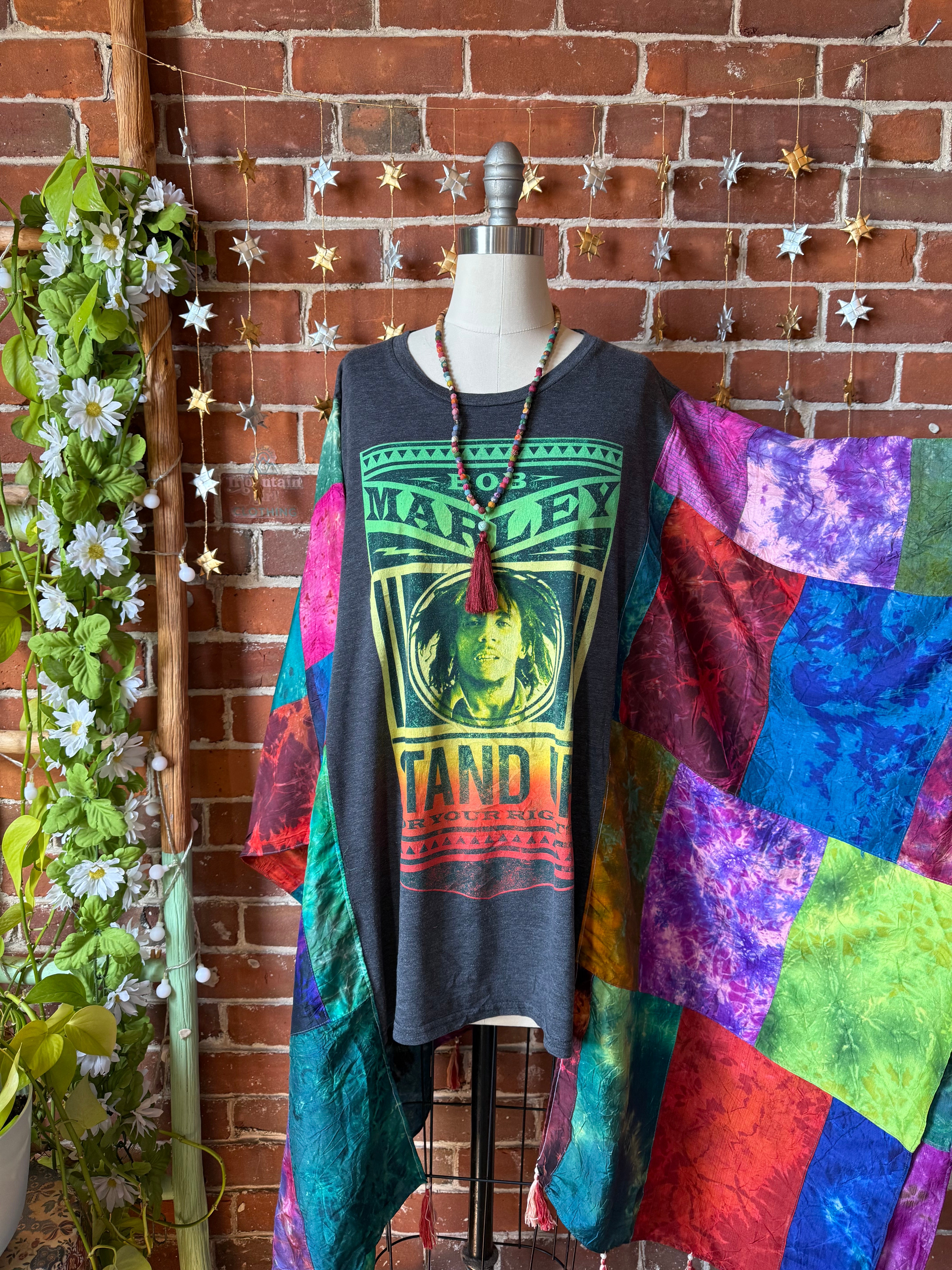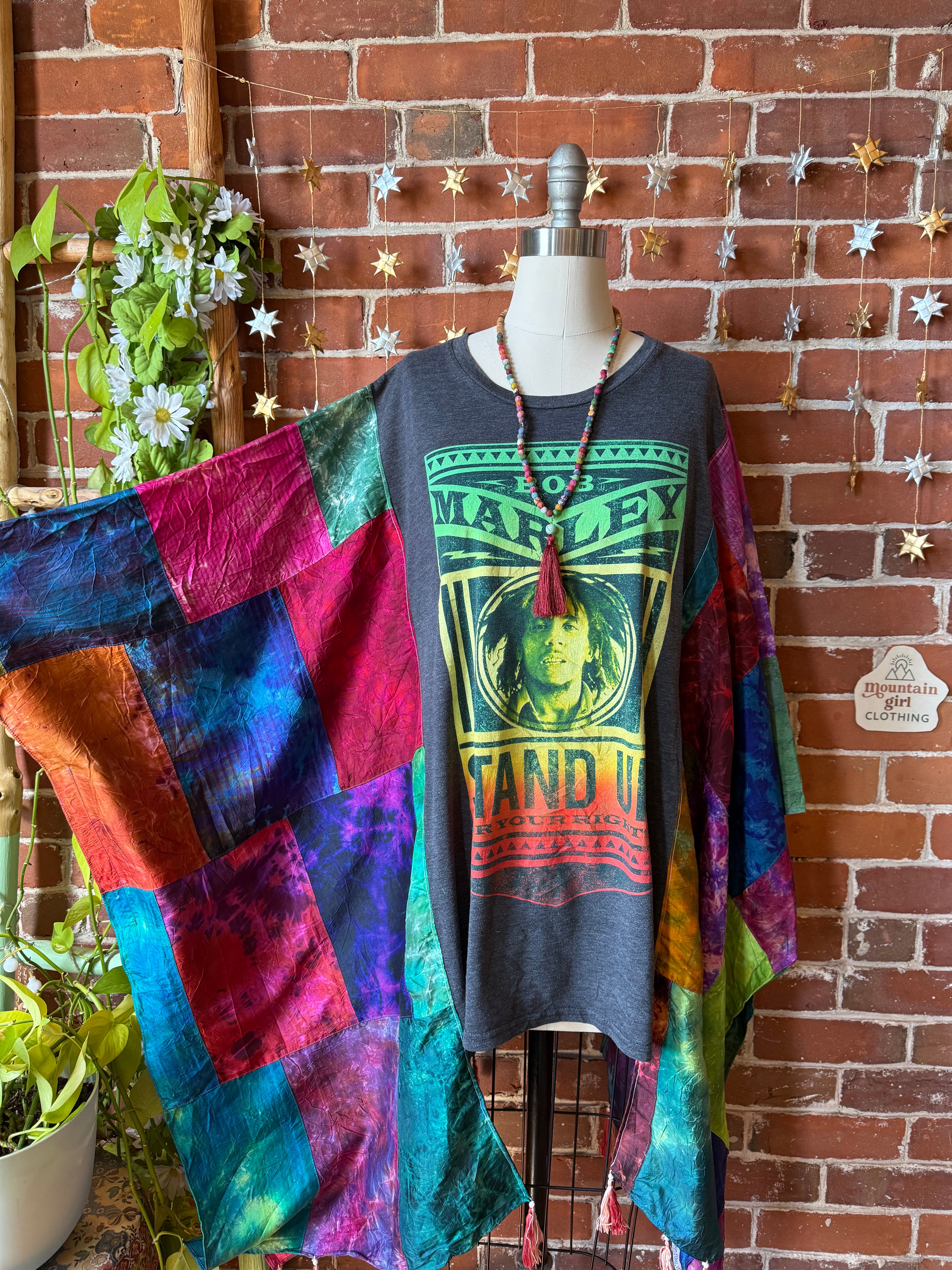 OOAK Winter Collection- Upcycled Silk Patchwork Tie Dye Bob Marley Inspired Hi Lo Poncho Top