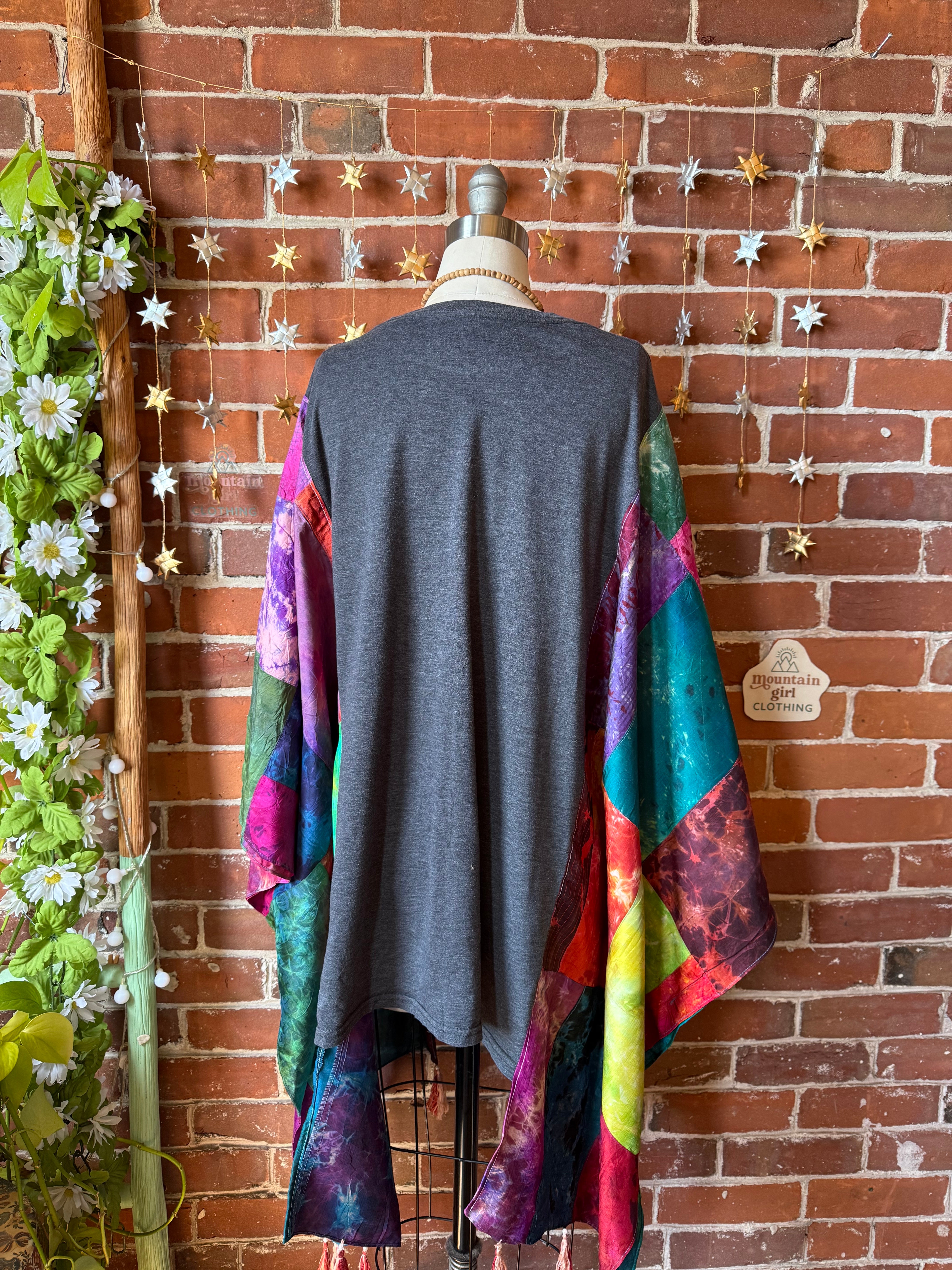 Upcycled silk flowy lightweight patchwork poncho sleeves, upcycled tee.