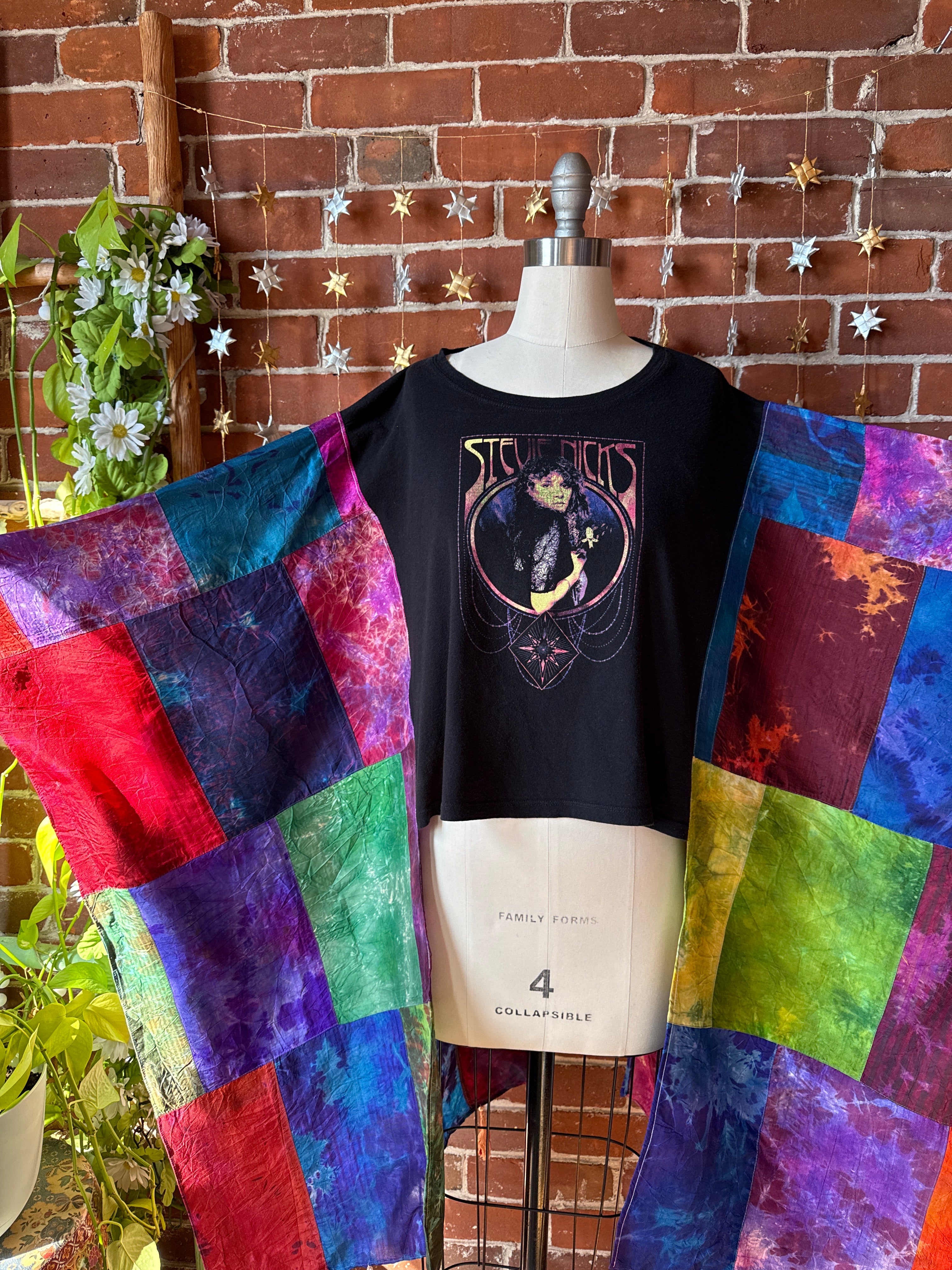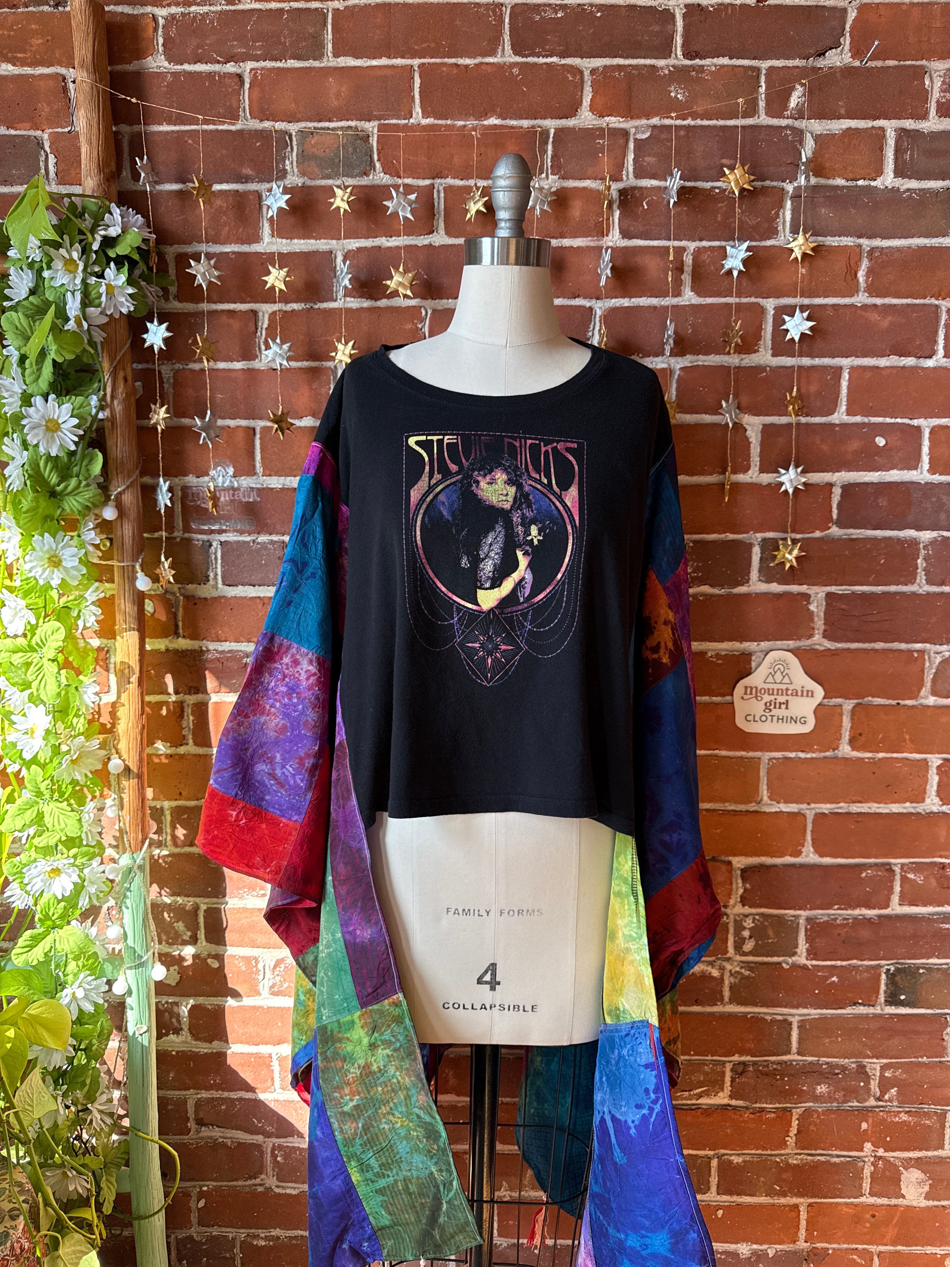 Upcycled silk flowy lightweight patchwork poncho sleeves, upcycled tee.