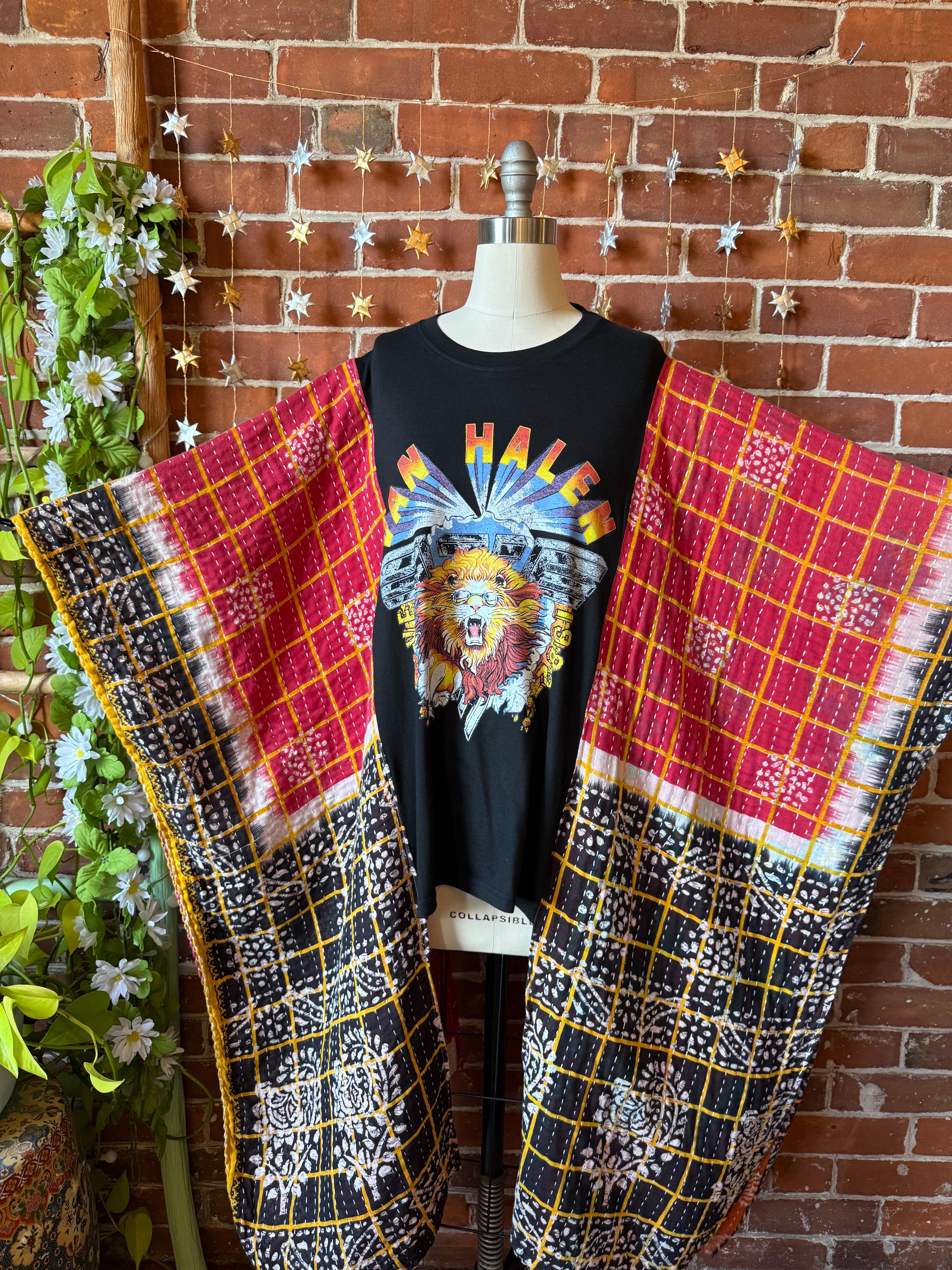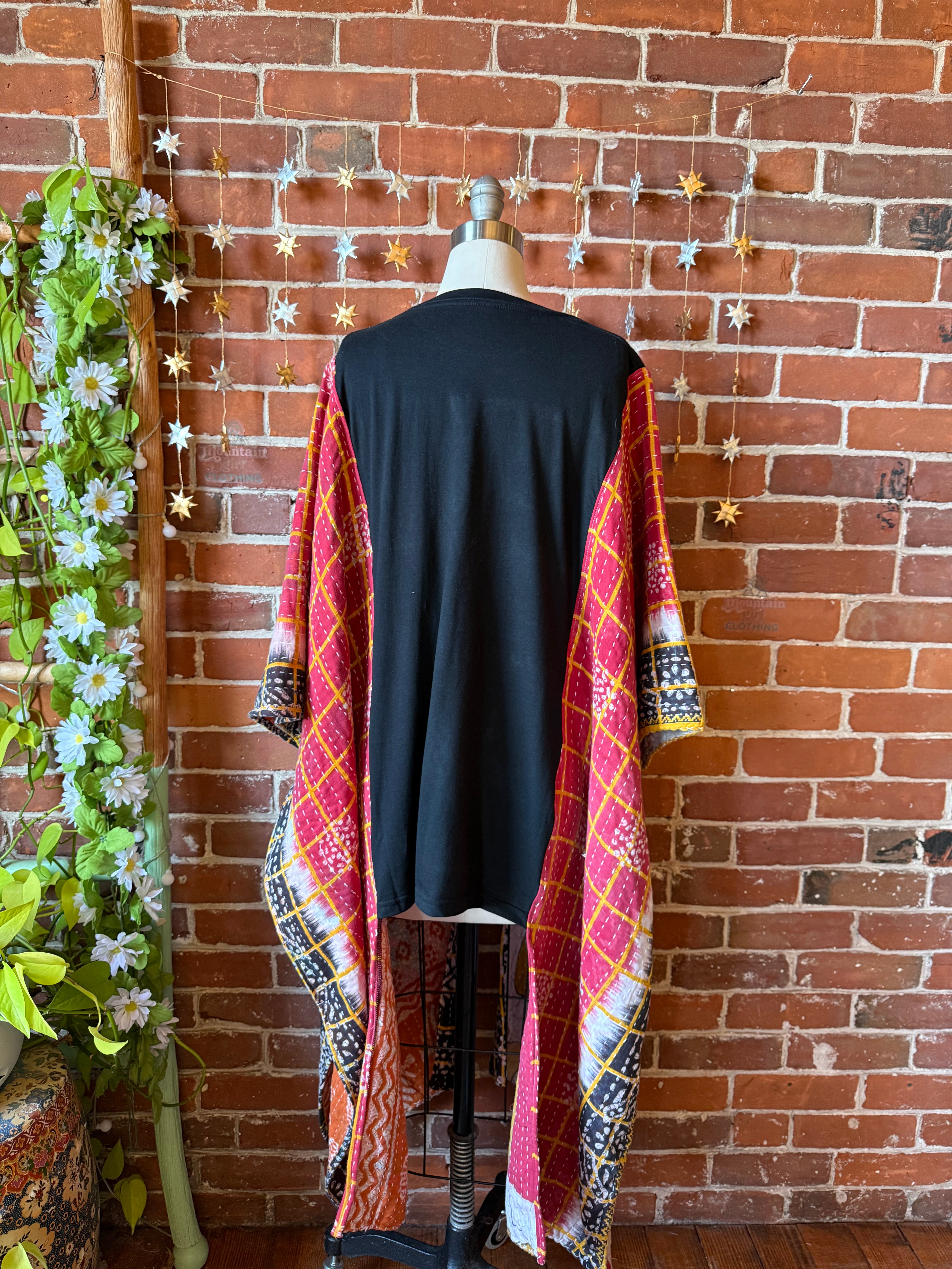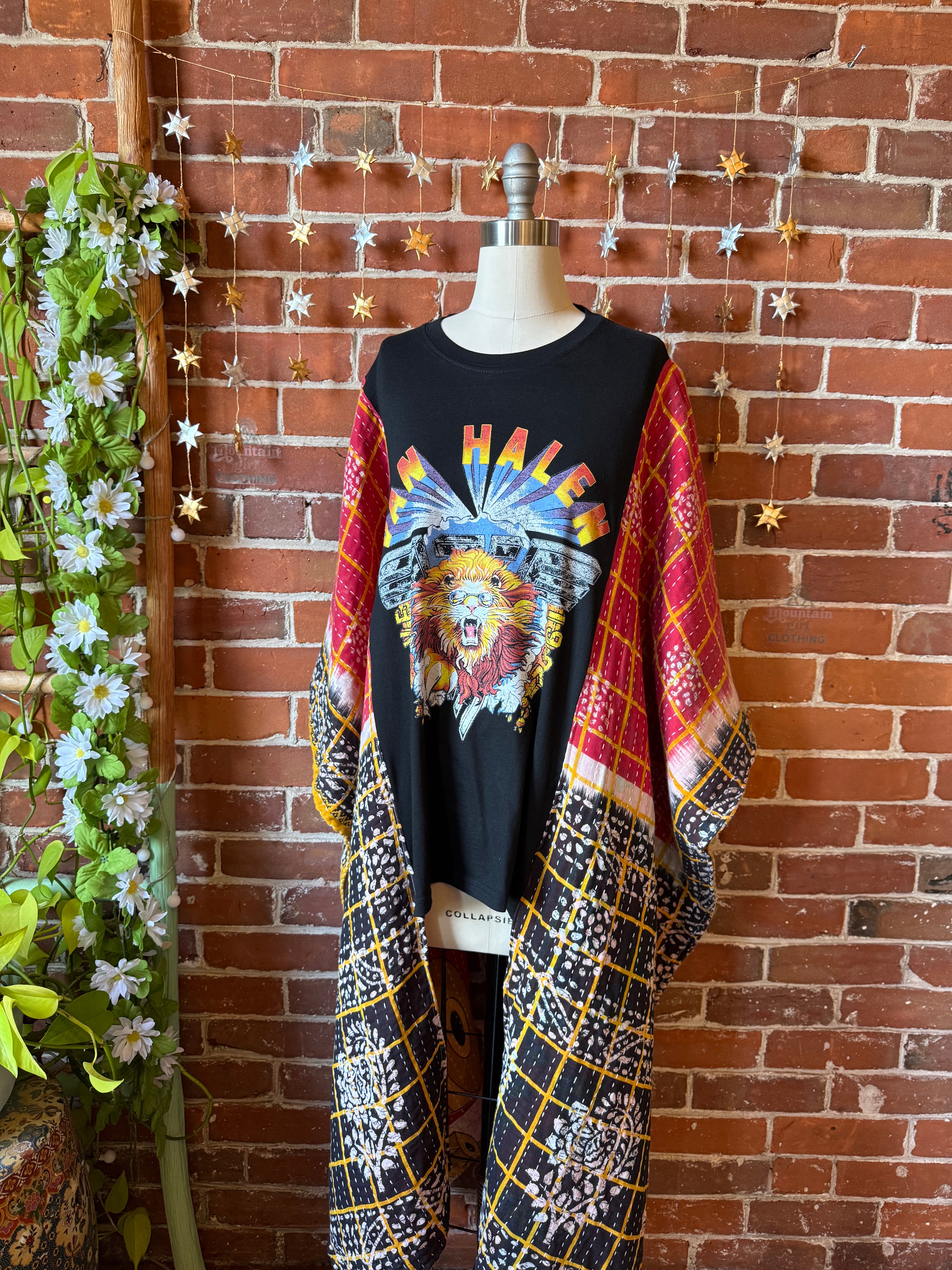Say Hello to Boho in this unique flowy tshirt top. Made from an upcycled tshirt and featuring soft, flowy fabric sides in a batik style print. Perfect for concerts or everyday wear.
