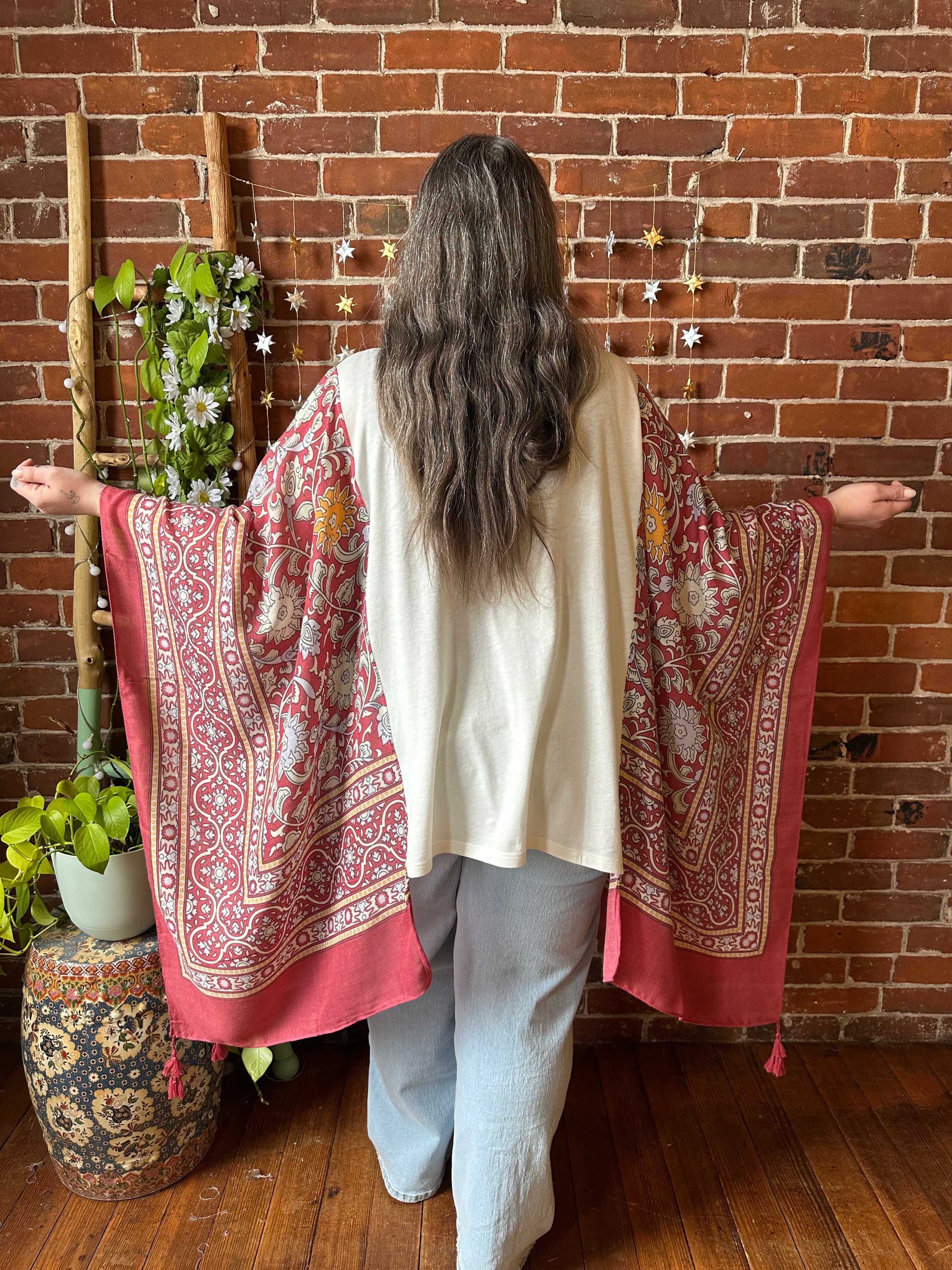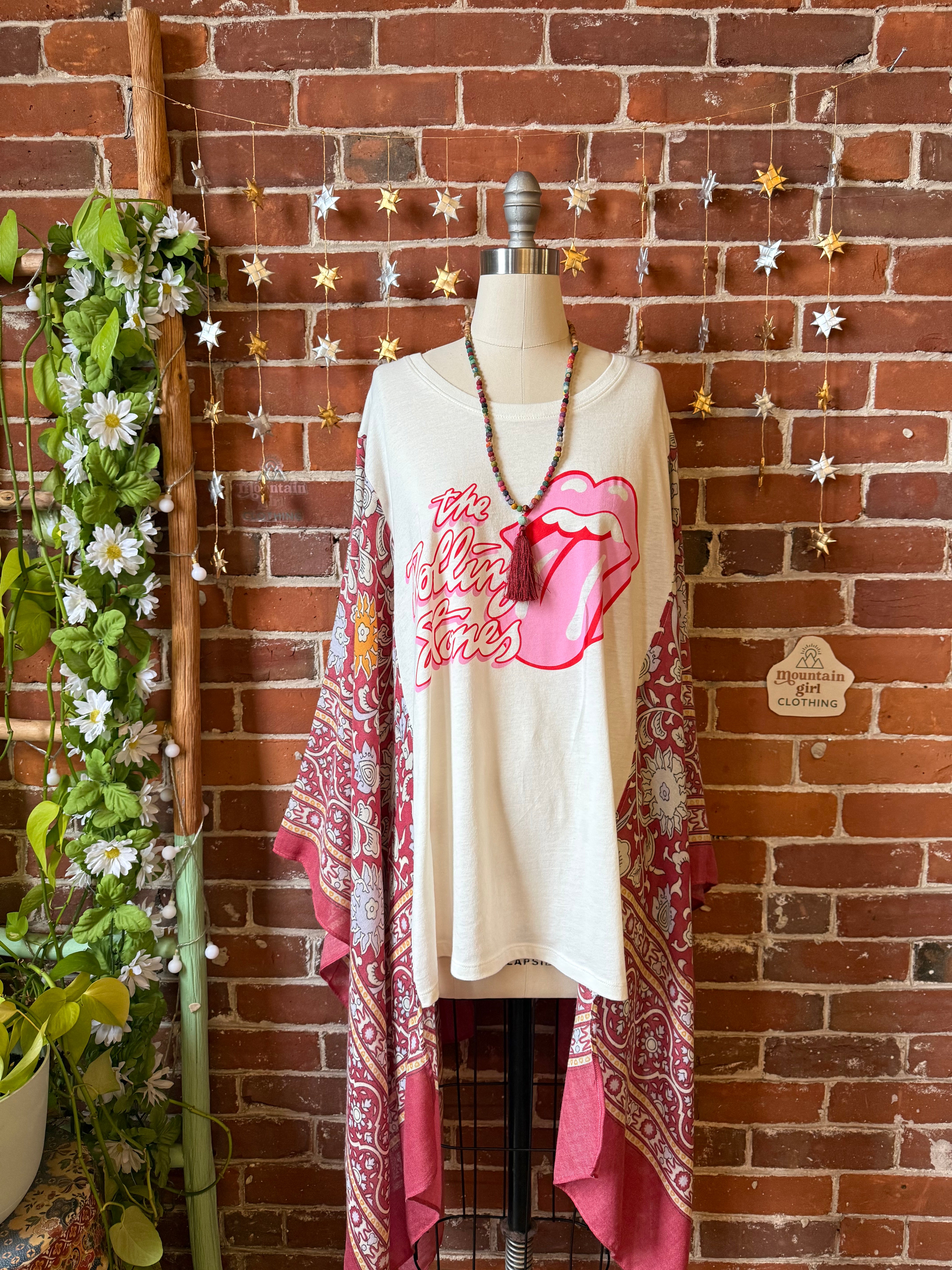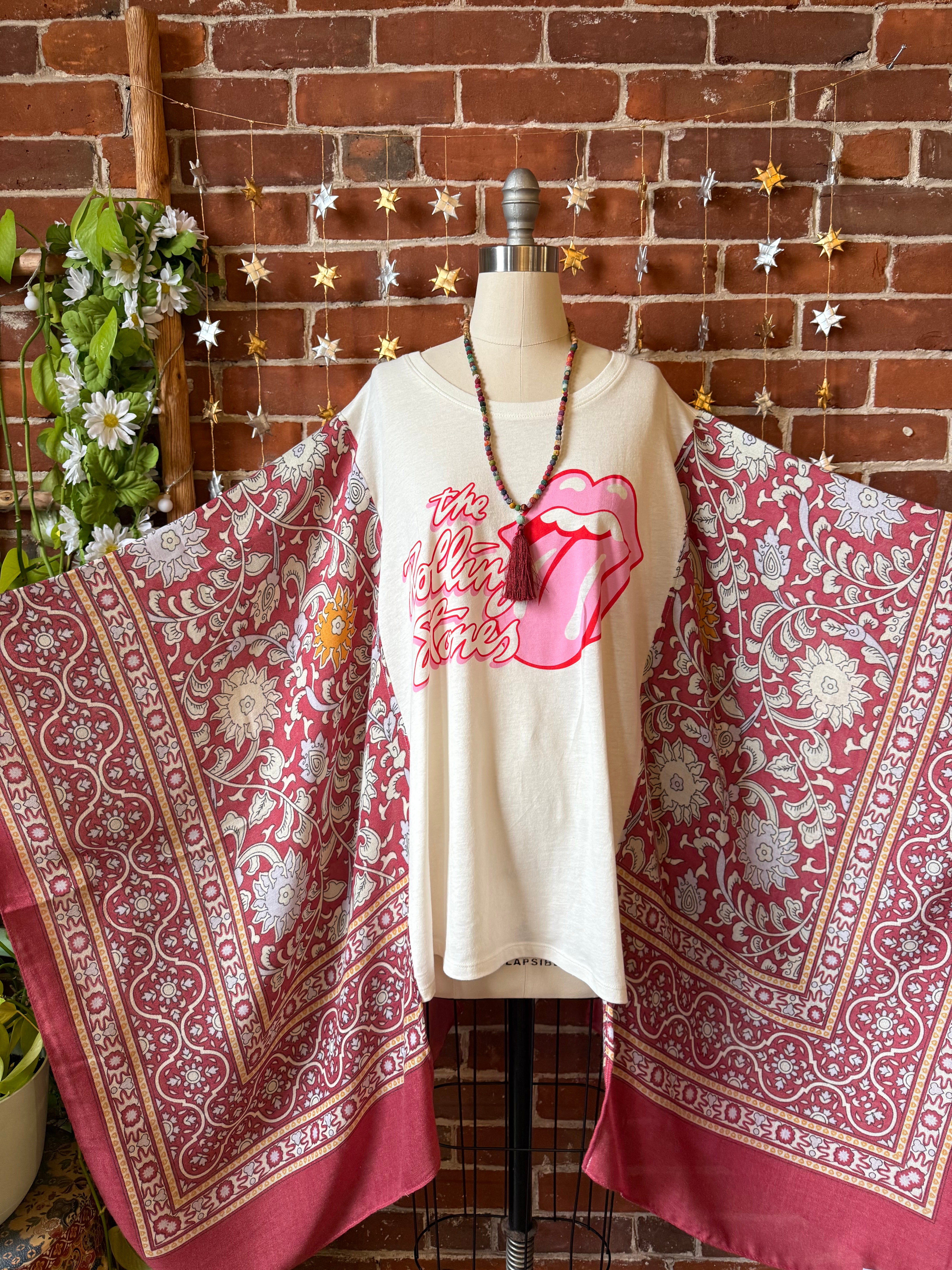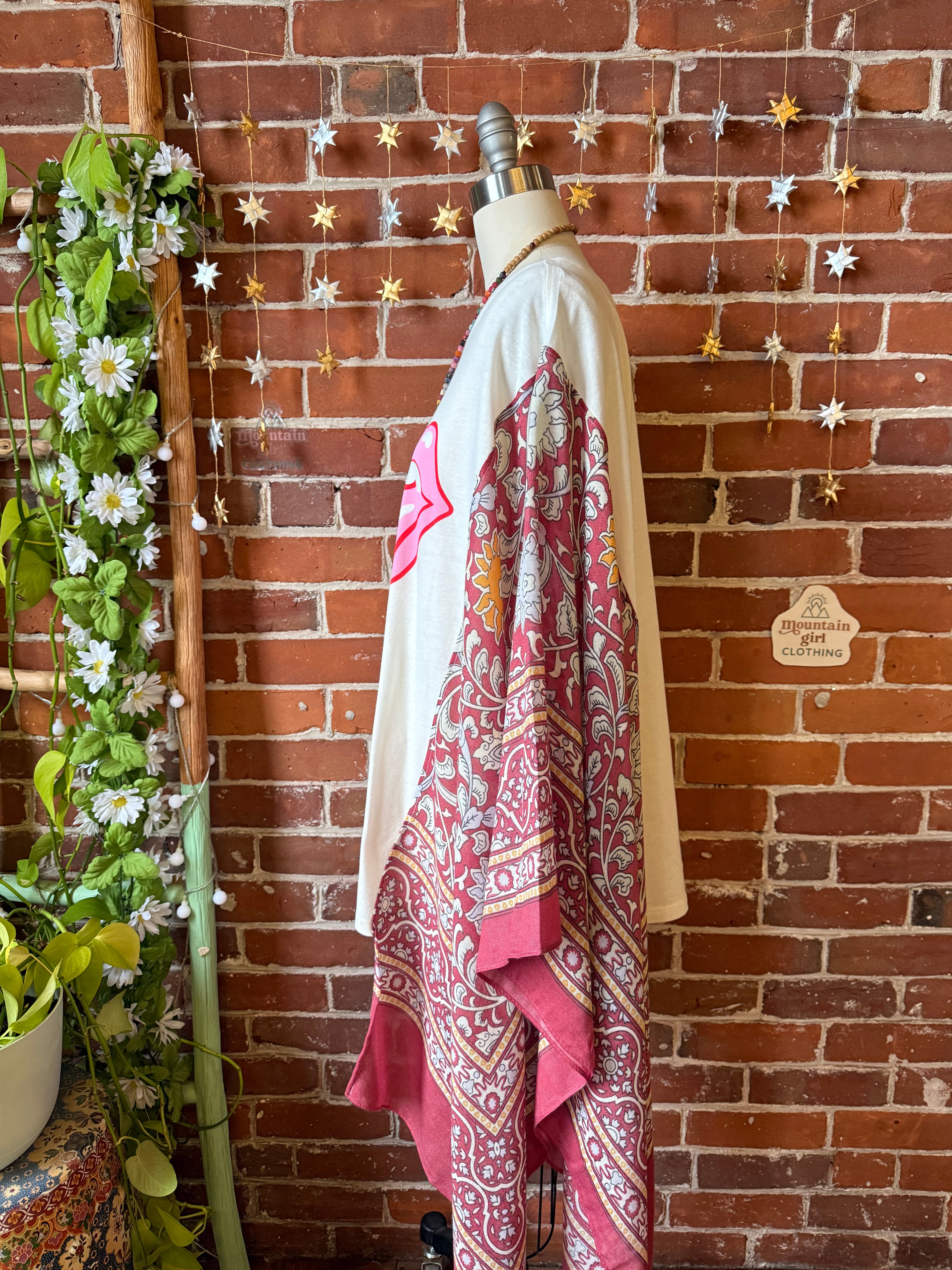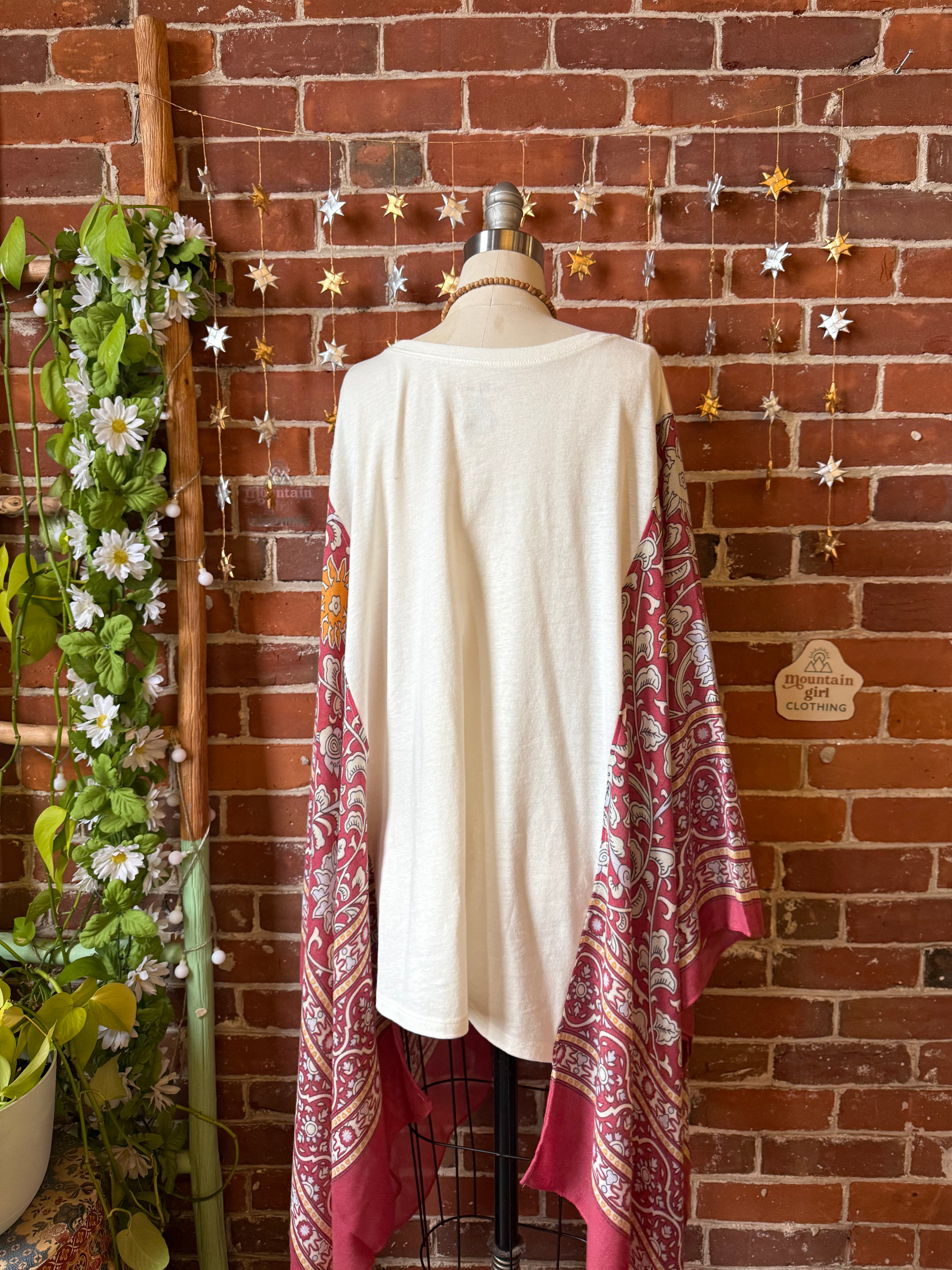 Say Hello to Boho in this unique flowy tshirt top. Made from an upcycled tshirt and featuring soft, flowy fabric sides in a botanical print. Perfect for concerts or everyday wear.