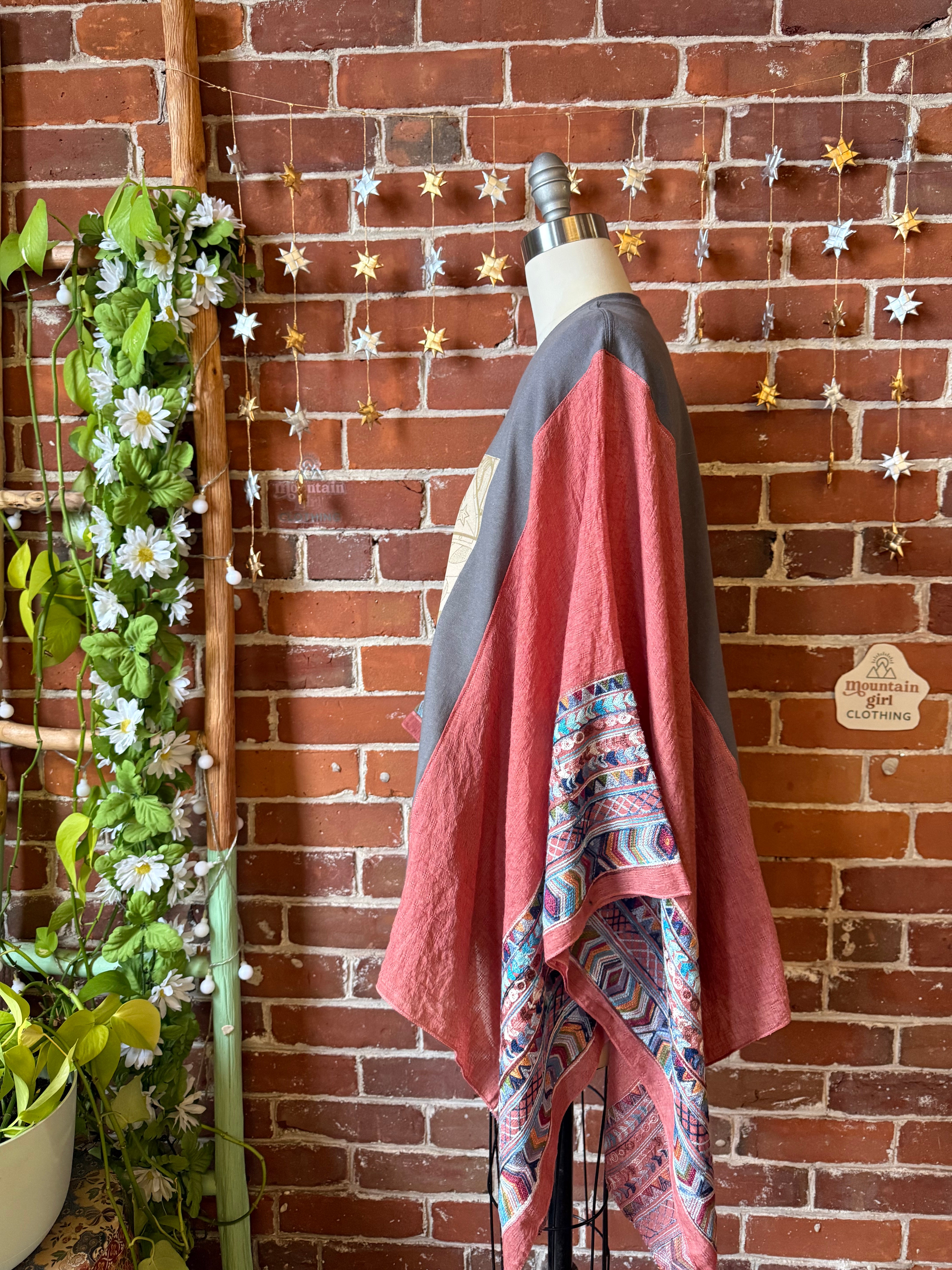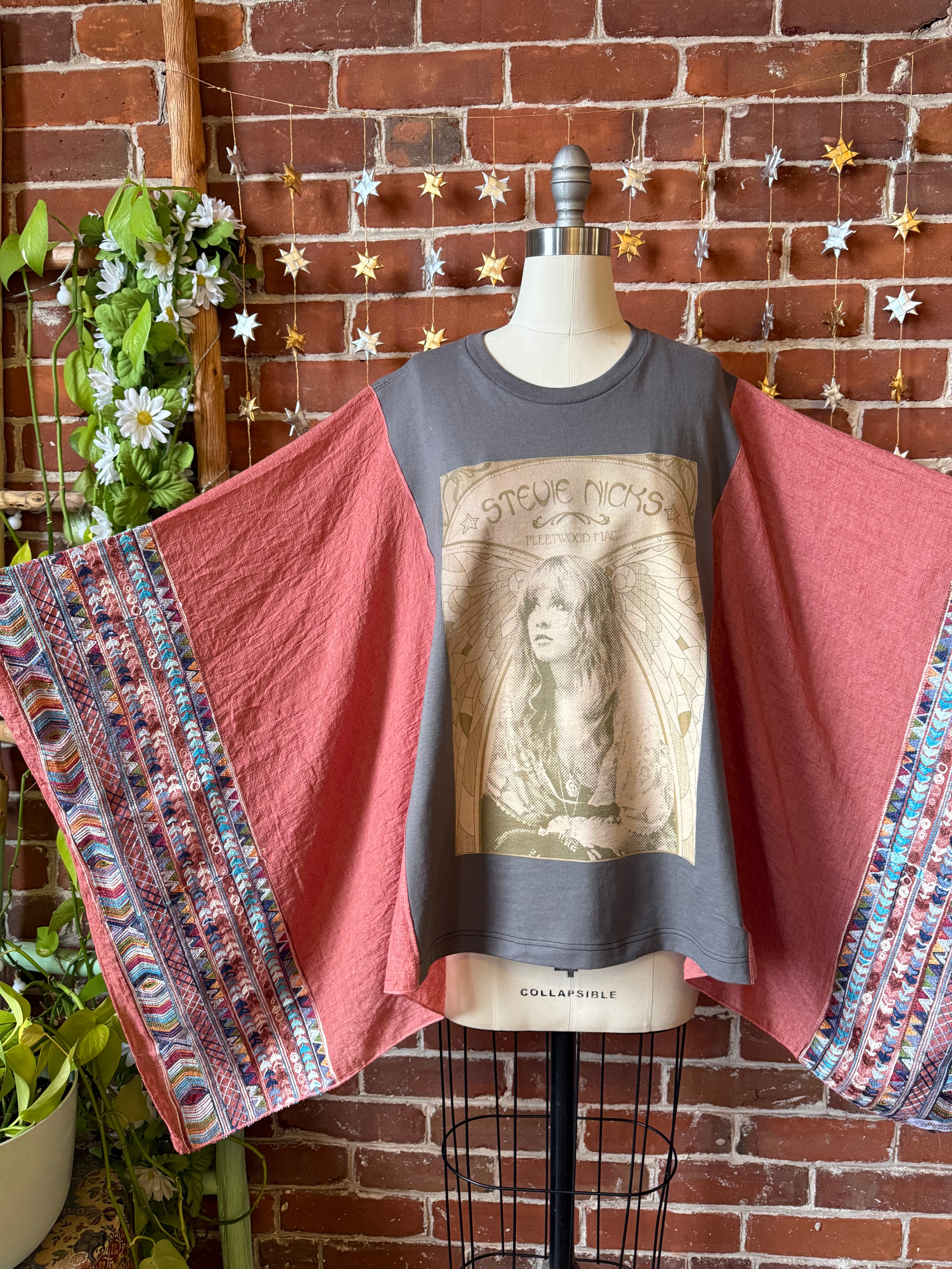 Unleash your inner gold dust woman with this unique Stevie Nicks inspired  embroidered poncho. Made from an upcycled faded print Stevie Nicks tshirt and featuring soft, flowy poncho sleeves, this is a must-have for any die-hard Stevie Nicks fan. Perfect for concerts or everyday wear.