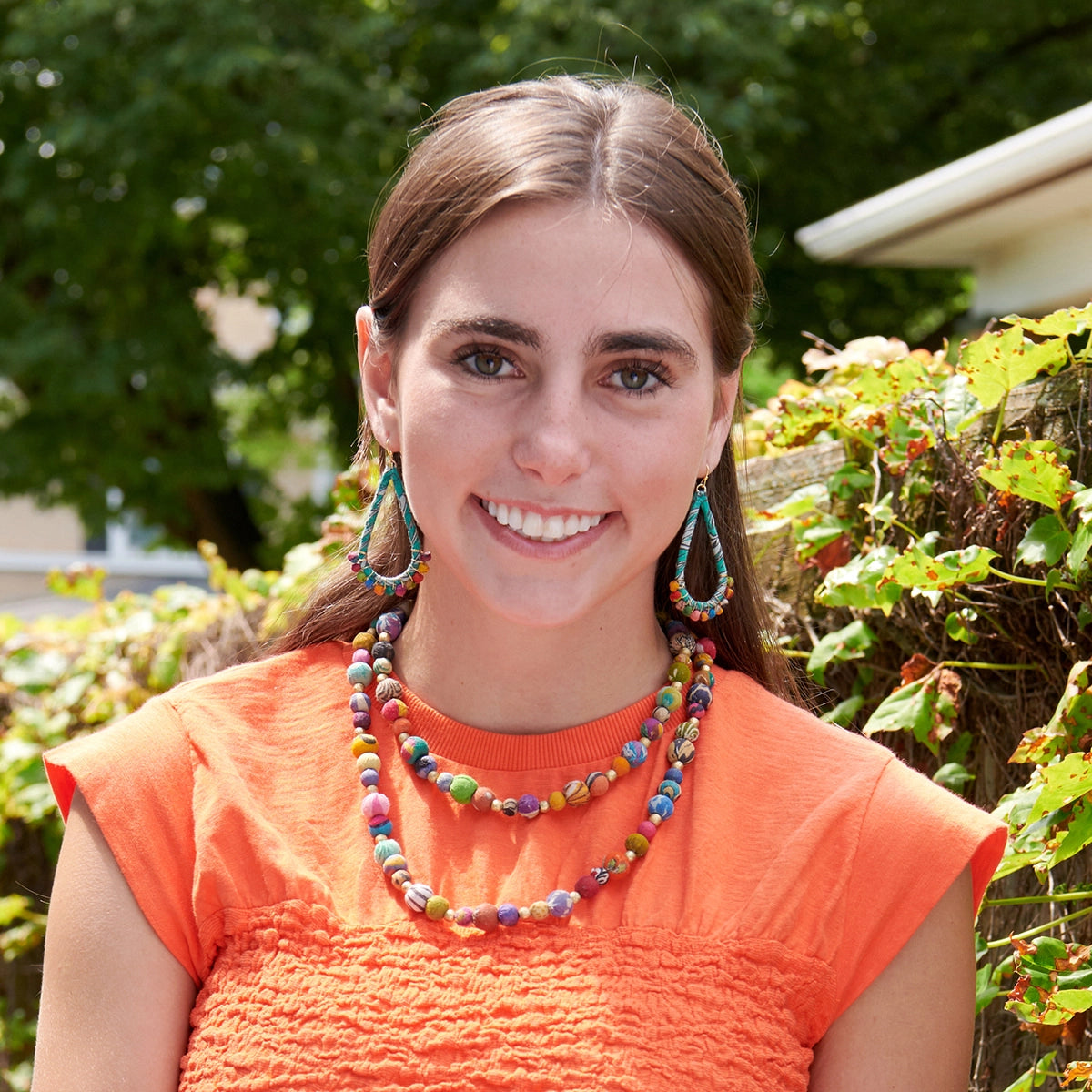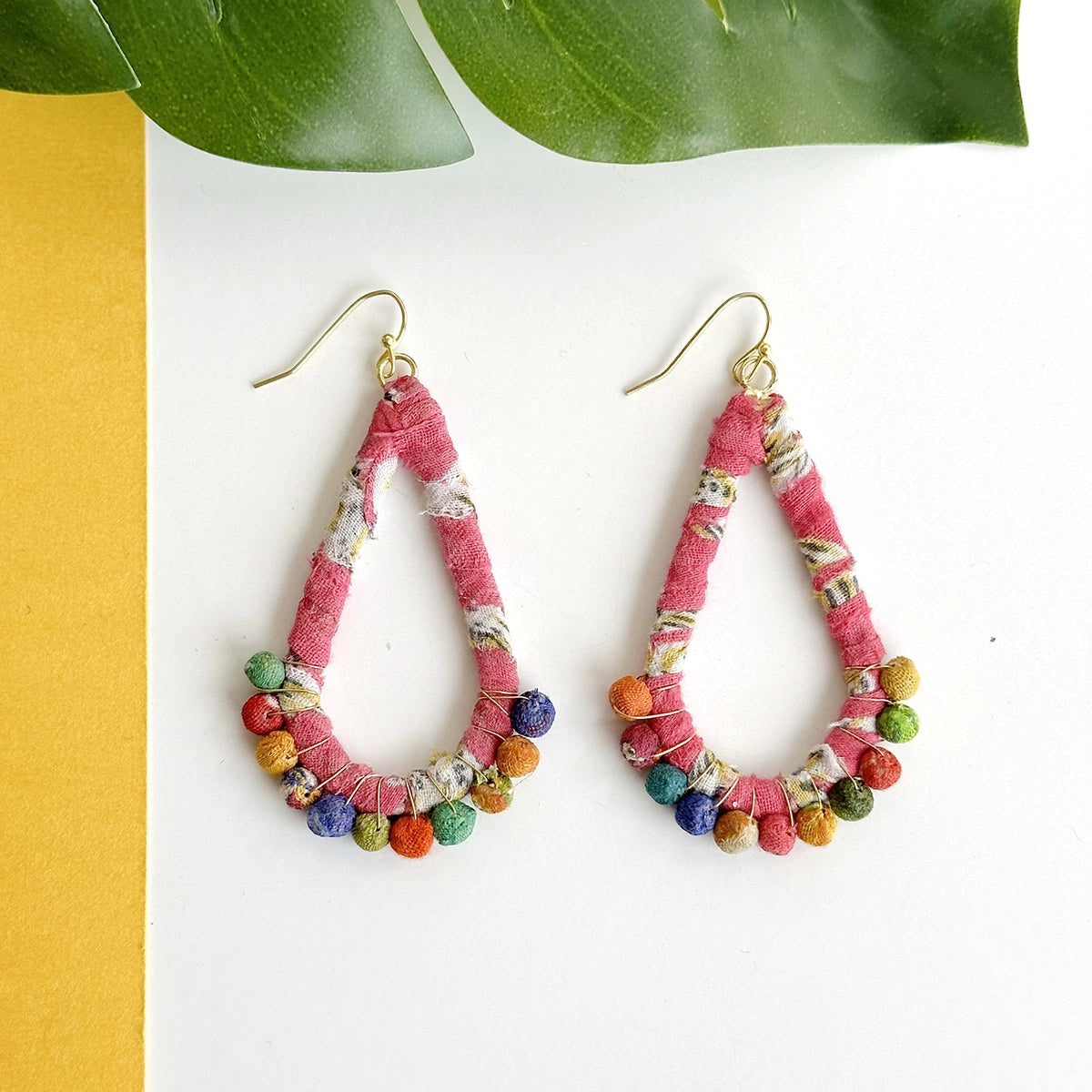 A teardrop is hand-wrapped with colorful Sari textiles, and then adorned at the bottom with a fan of Kantha beads. • Measures 2.75" long, with nickel-, cadmium-, and lead-free French ear wires. • Colors & patterns will vary due to repurposed textiles.
