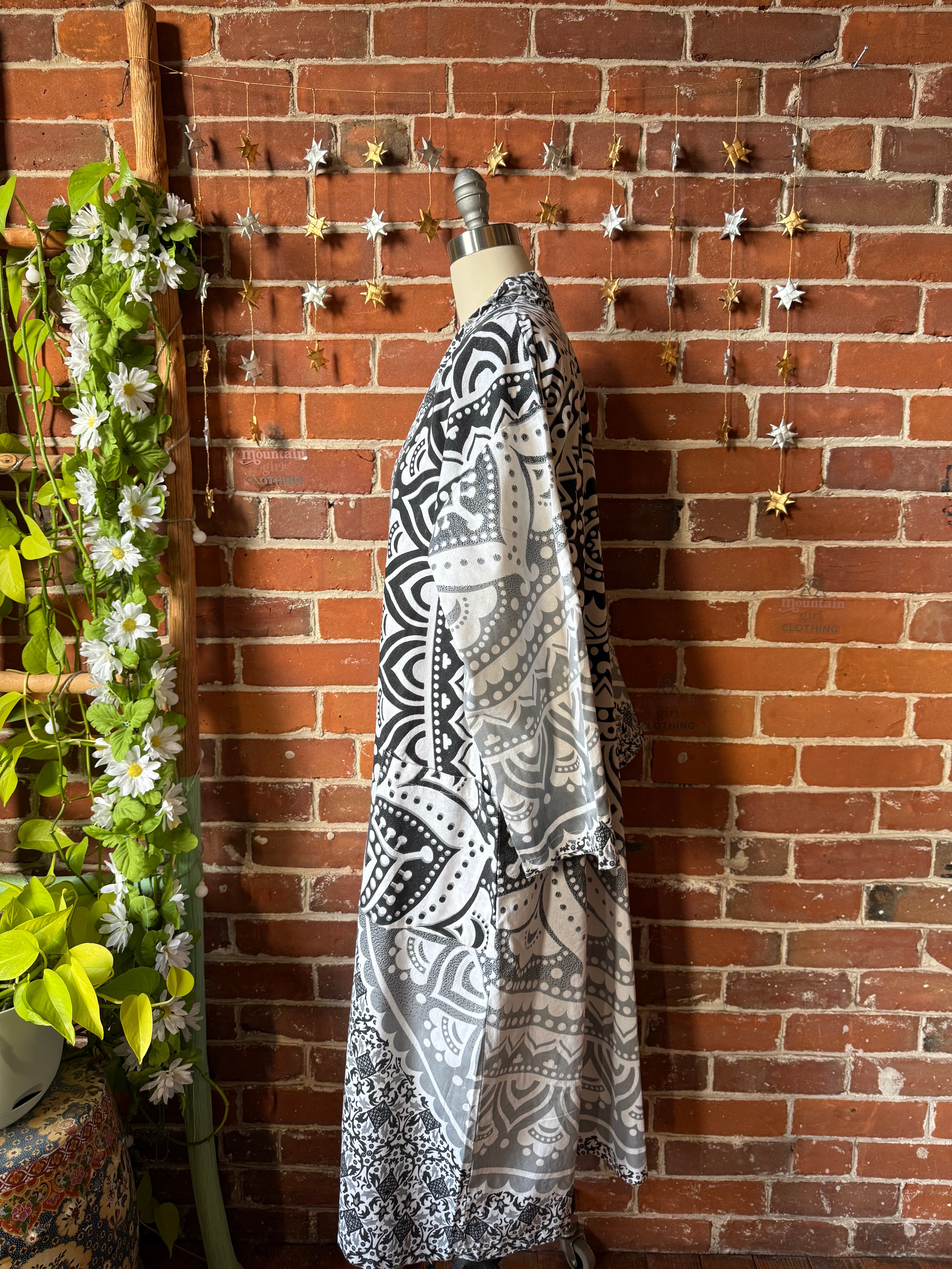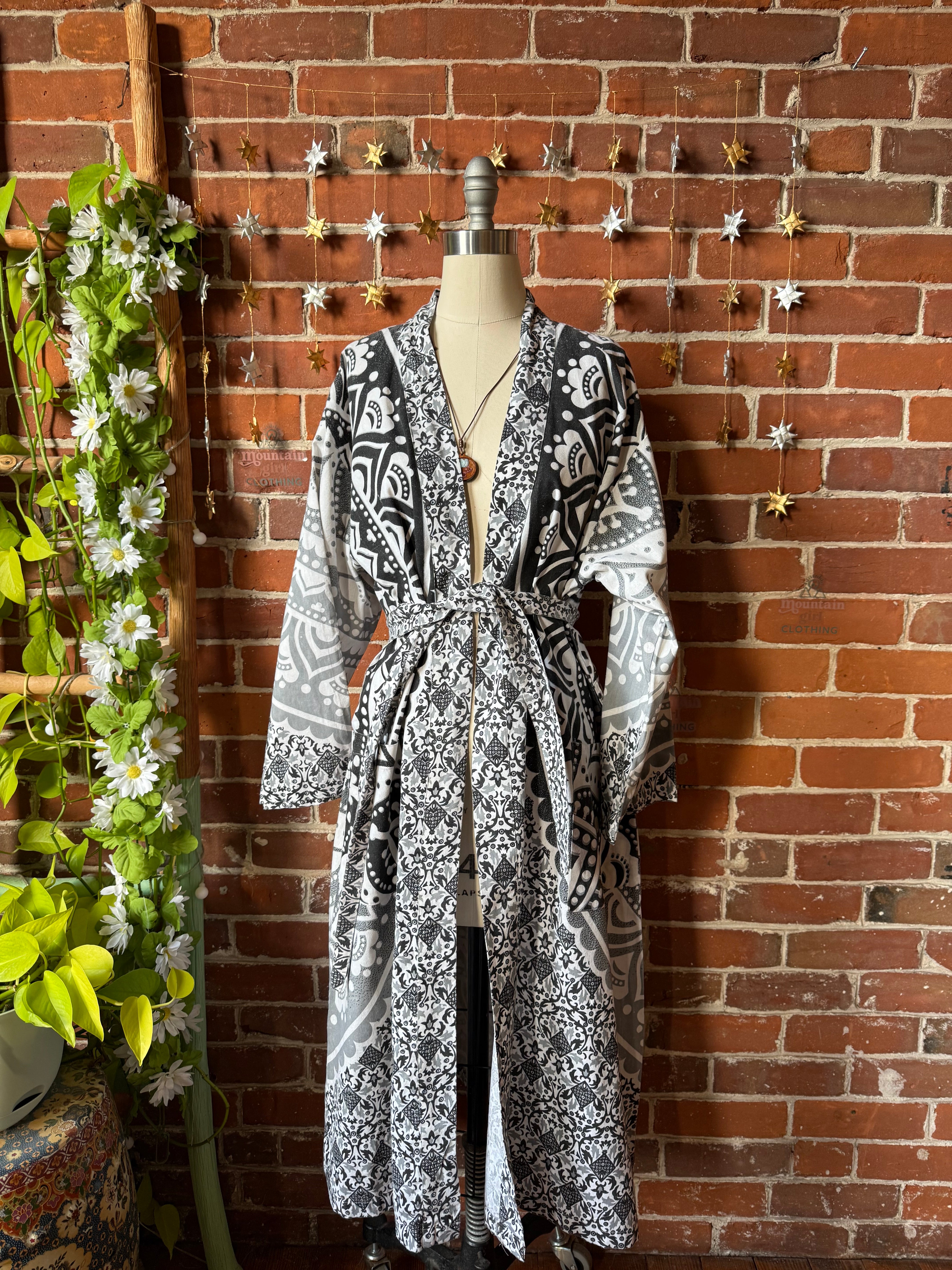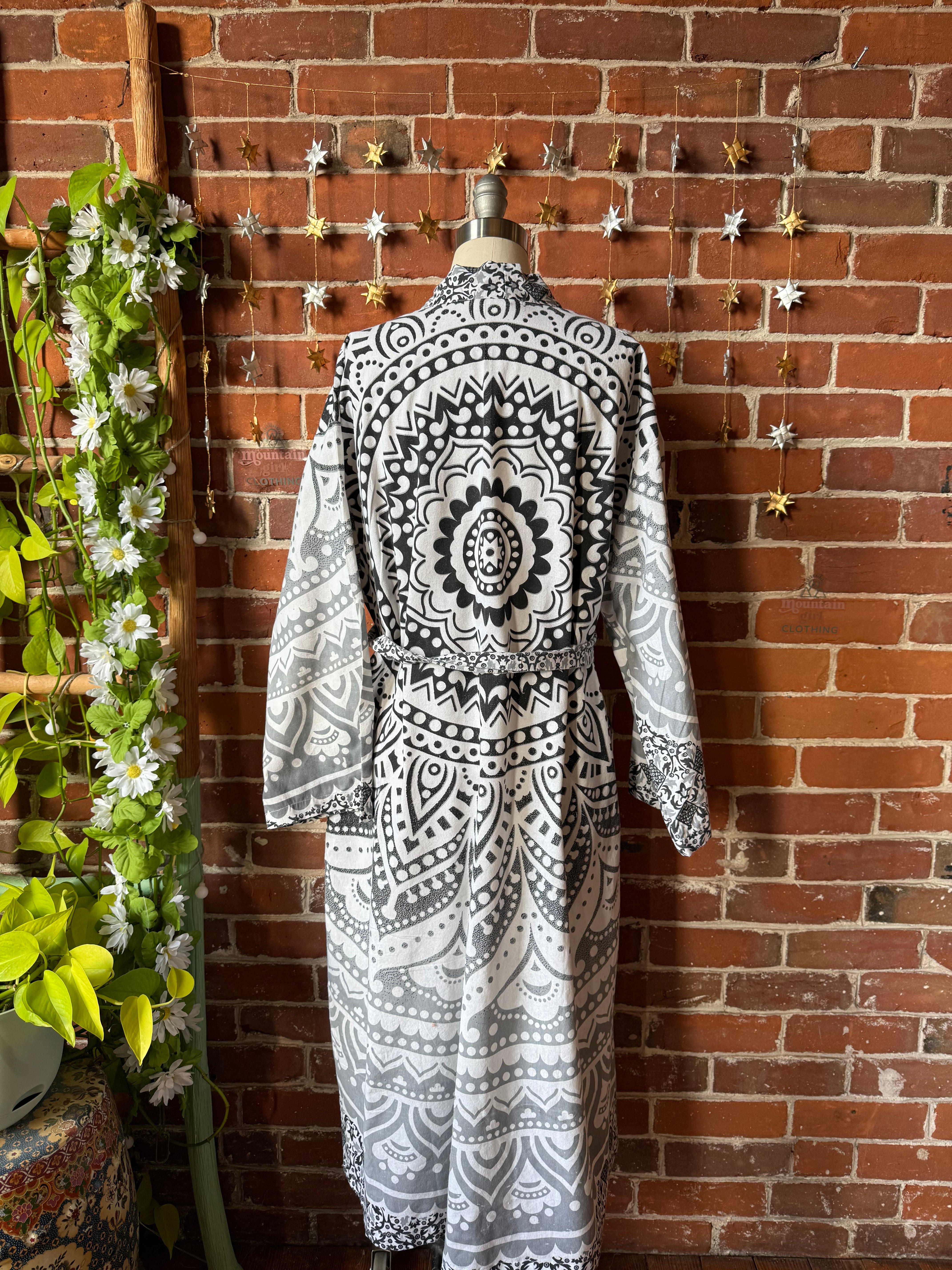 Black + Gray Mandala Long Tapestry Robe Kimono with Pockets and Belt