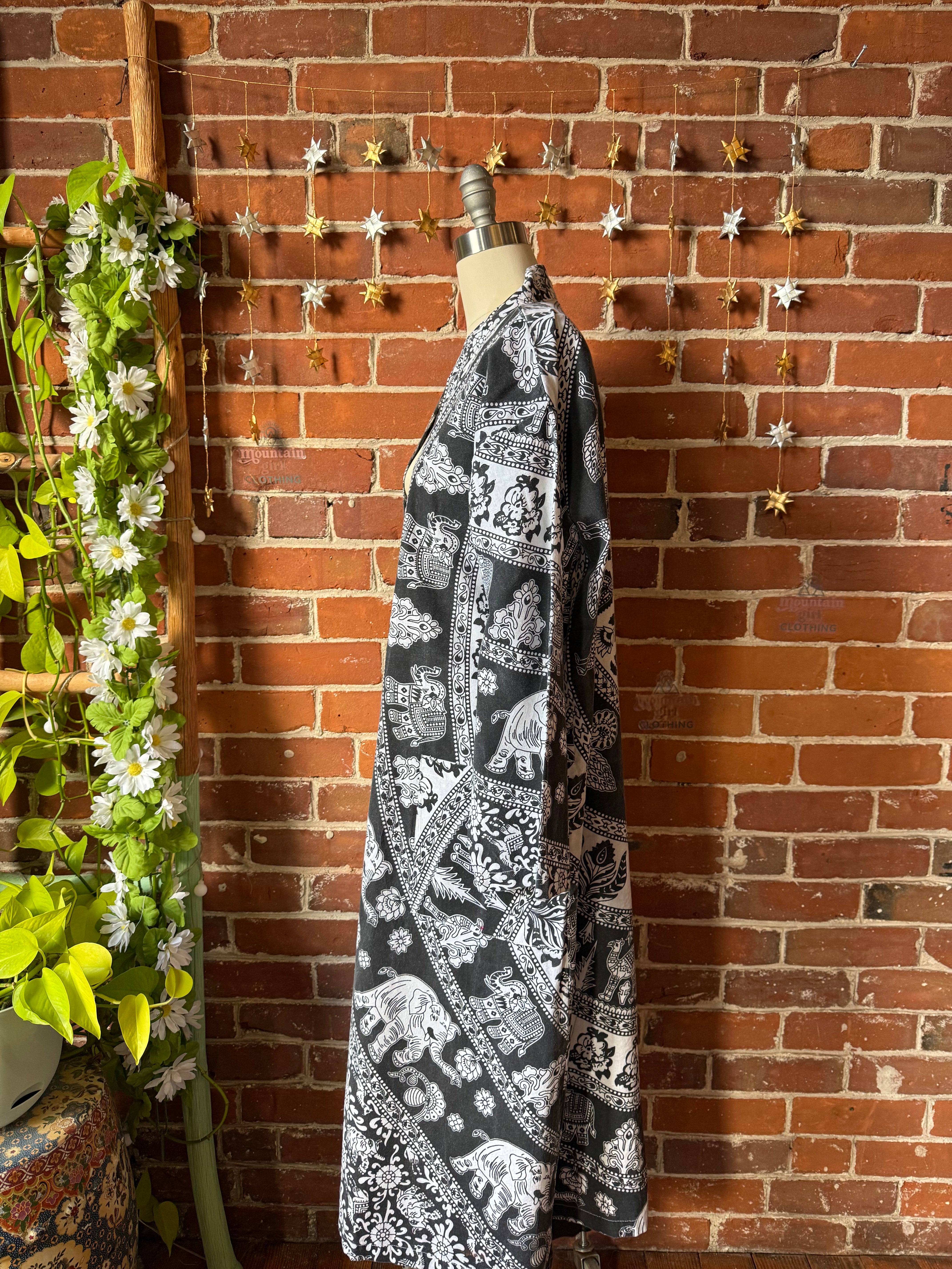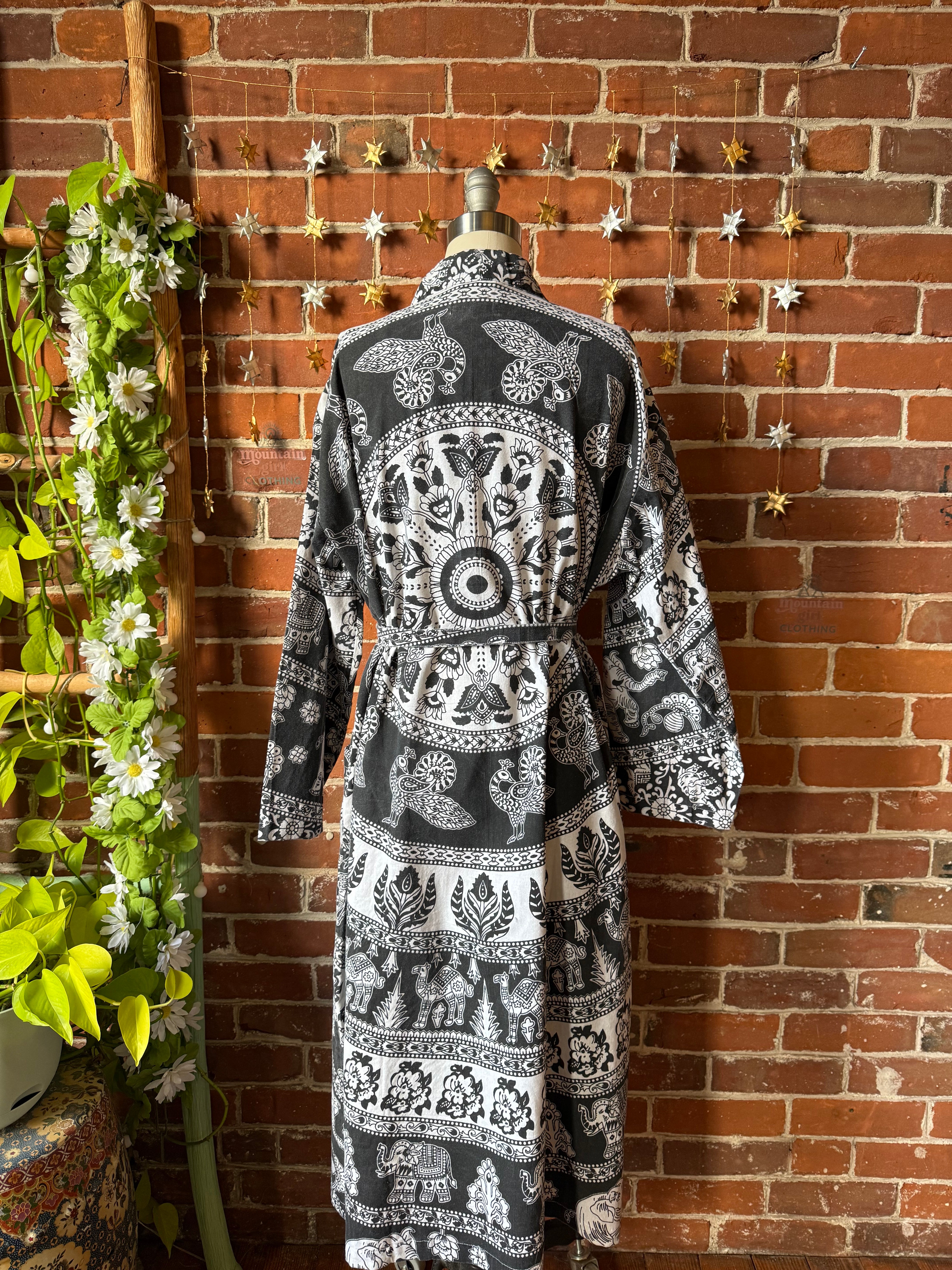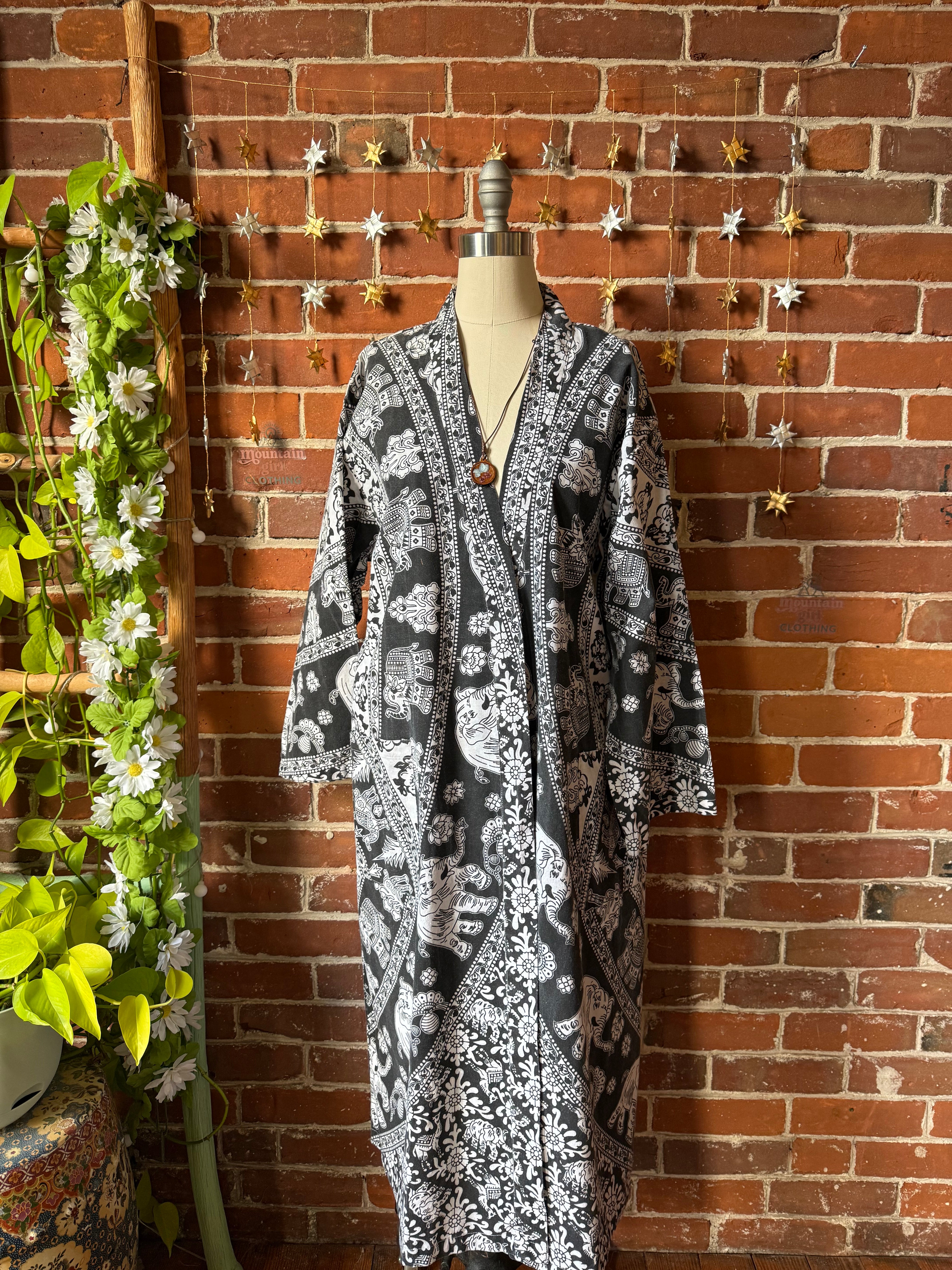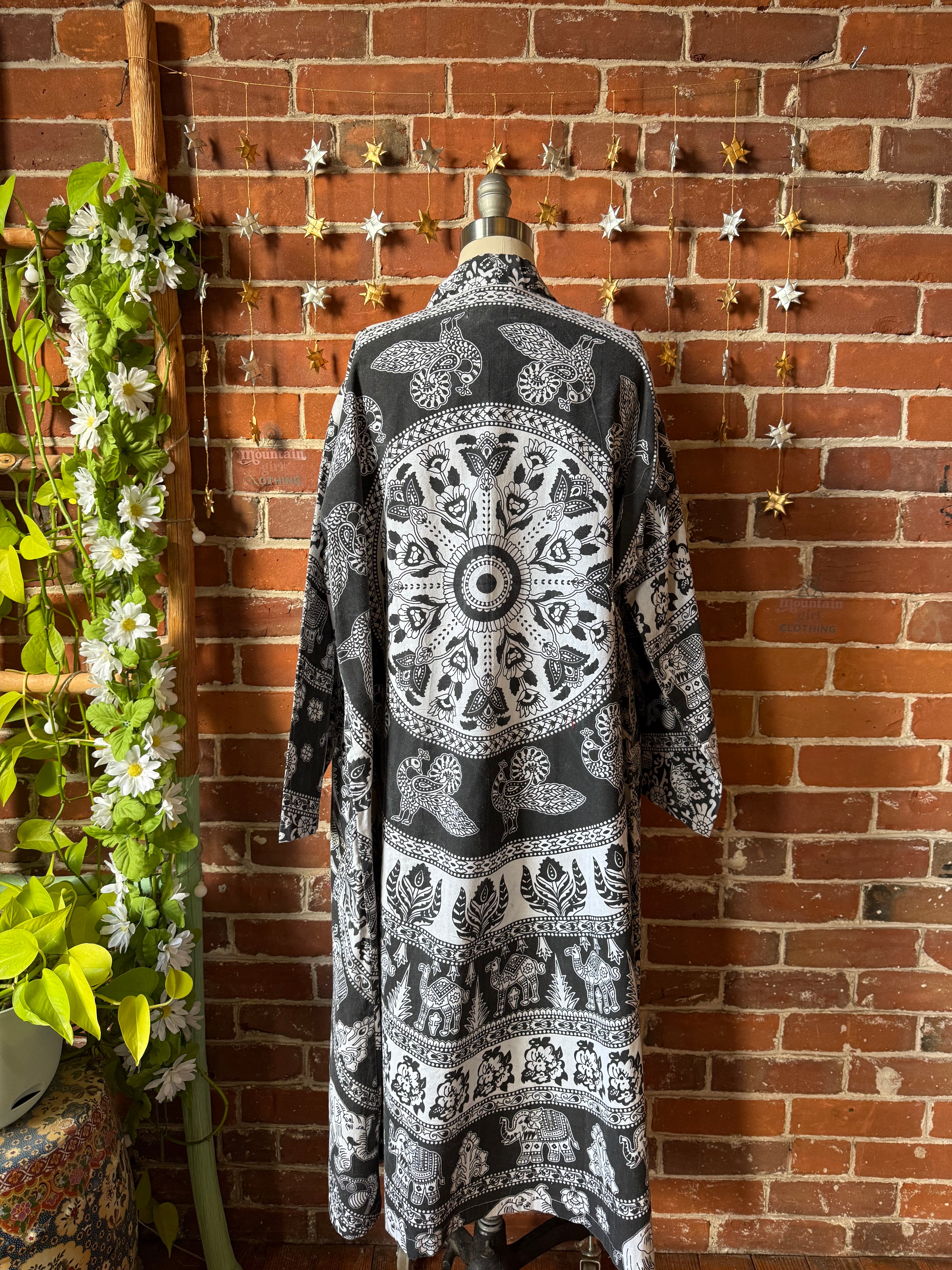 Black + White Mandala Long Tapestry Robe Kimono with Pockets and Belt