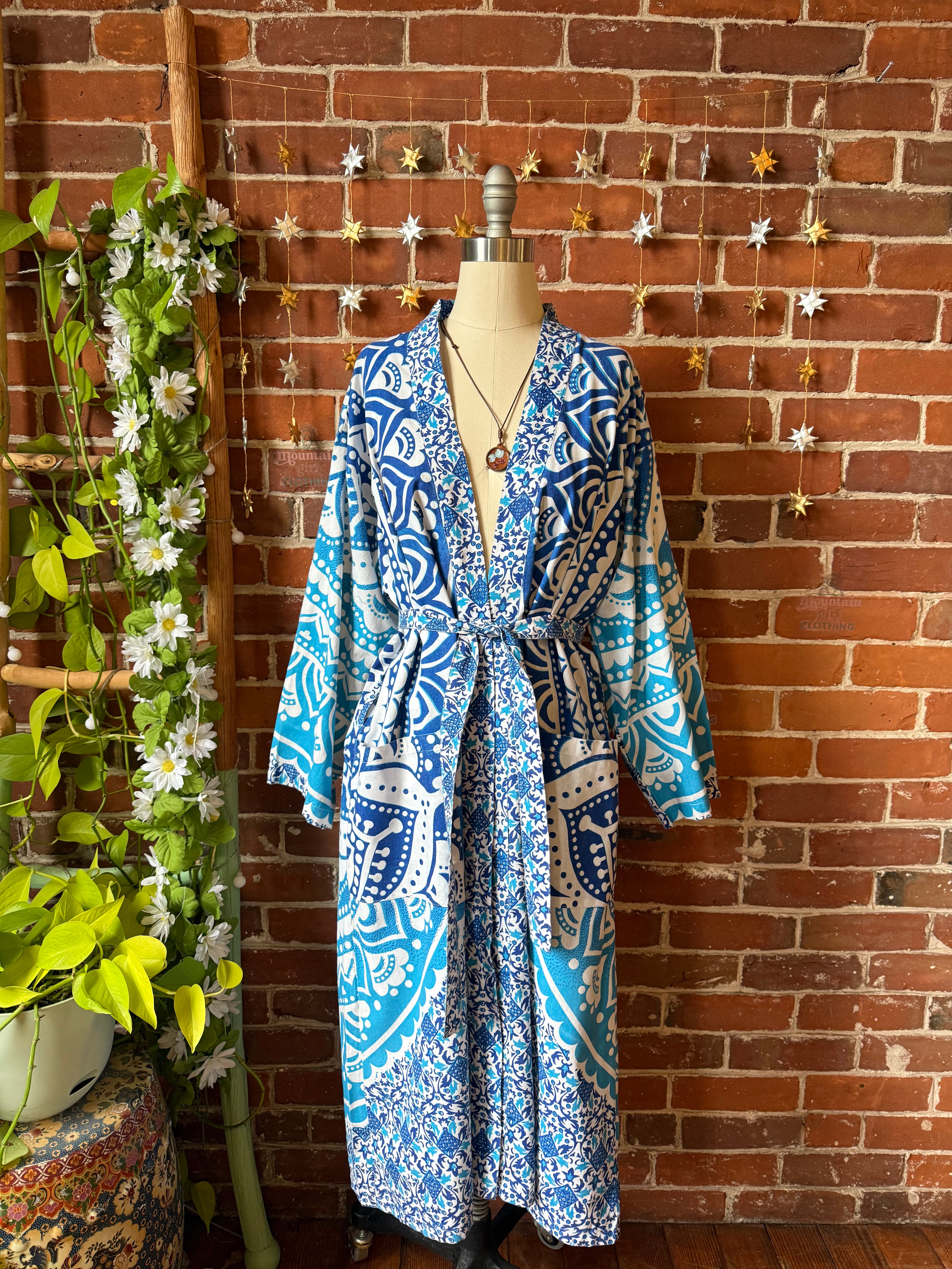Blue Mandala Long Tapestry Robe Kimono with Pockets and Belt