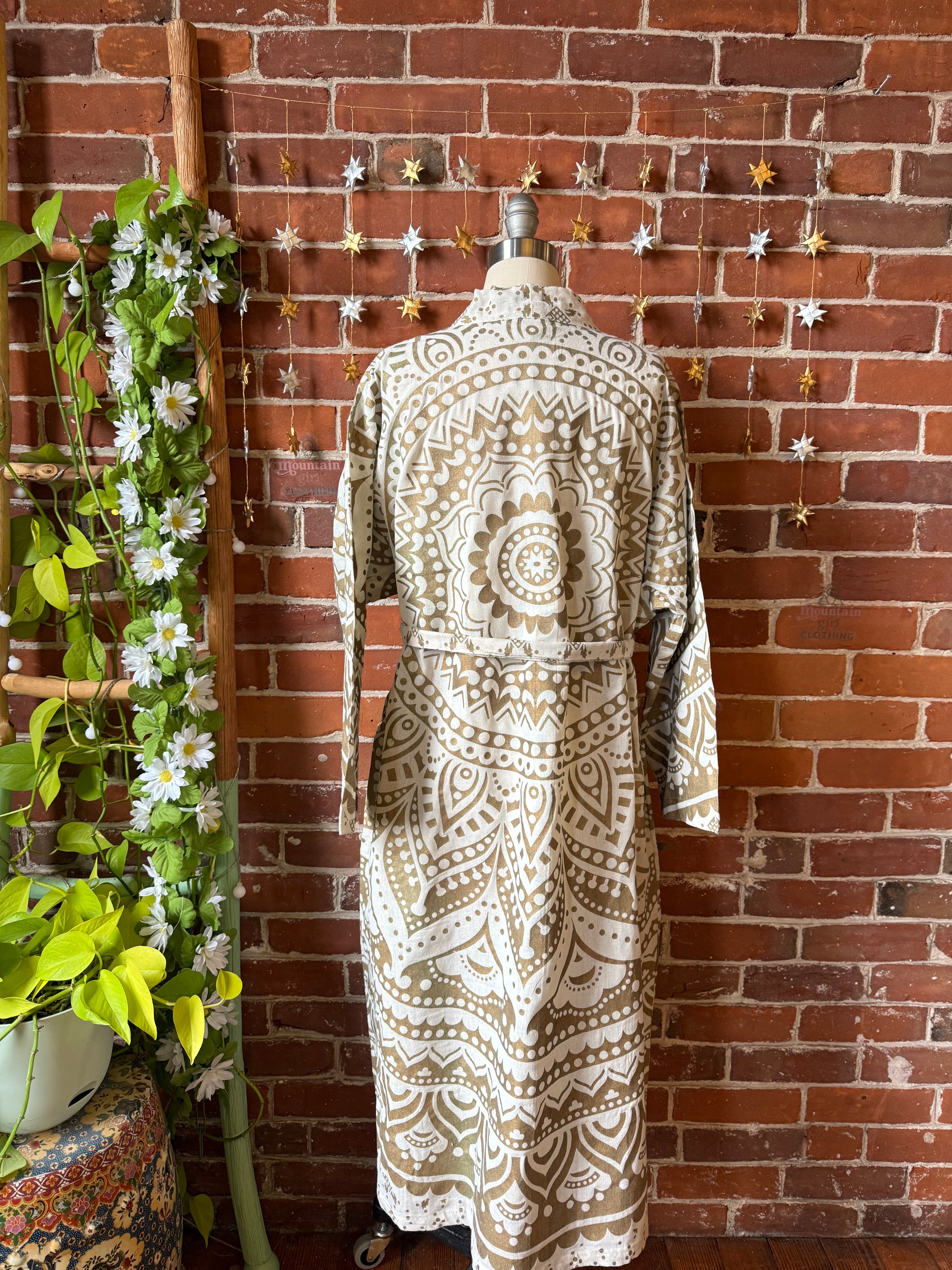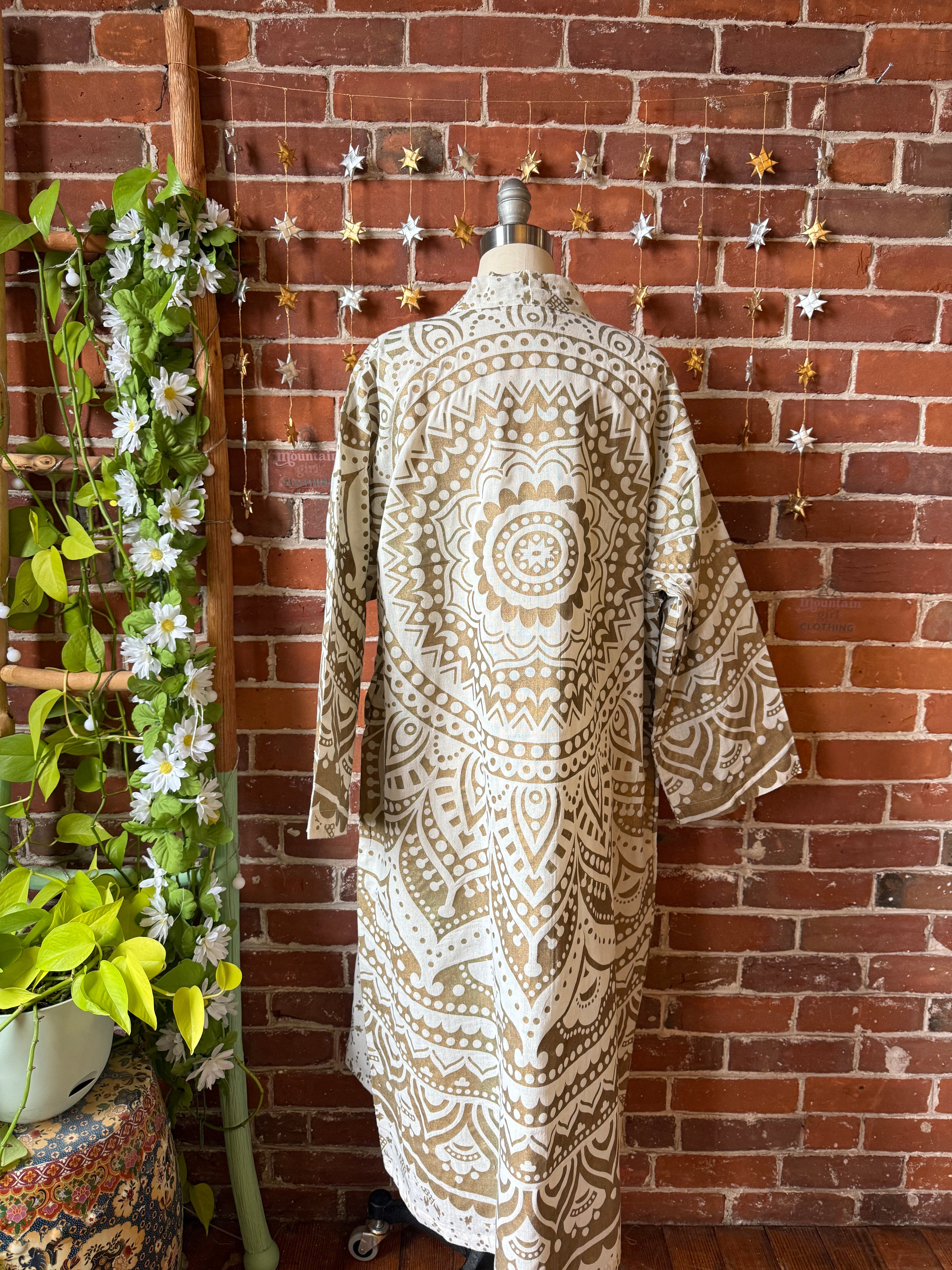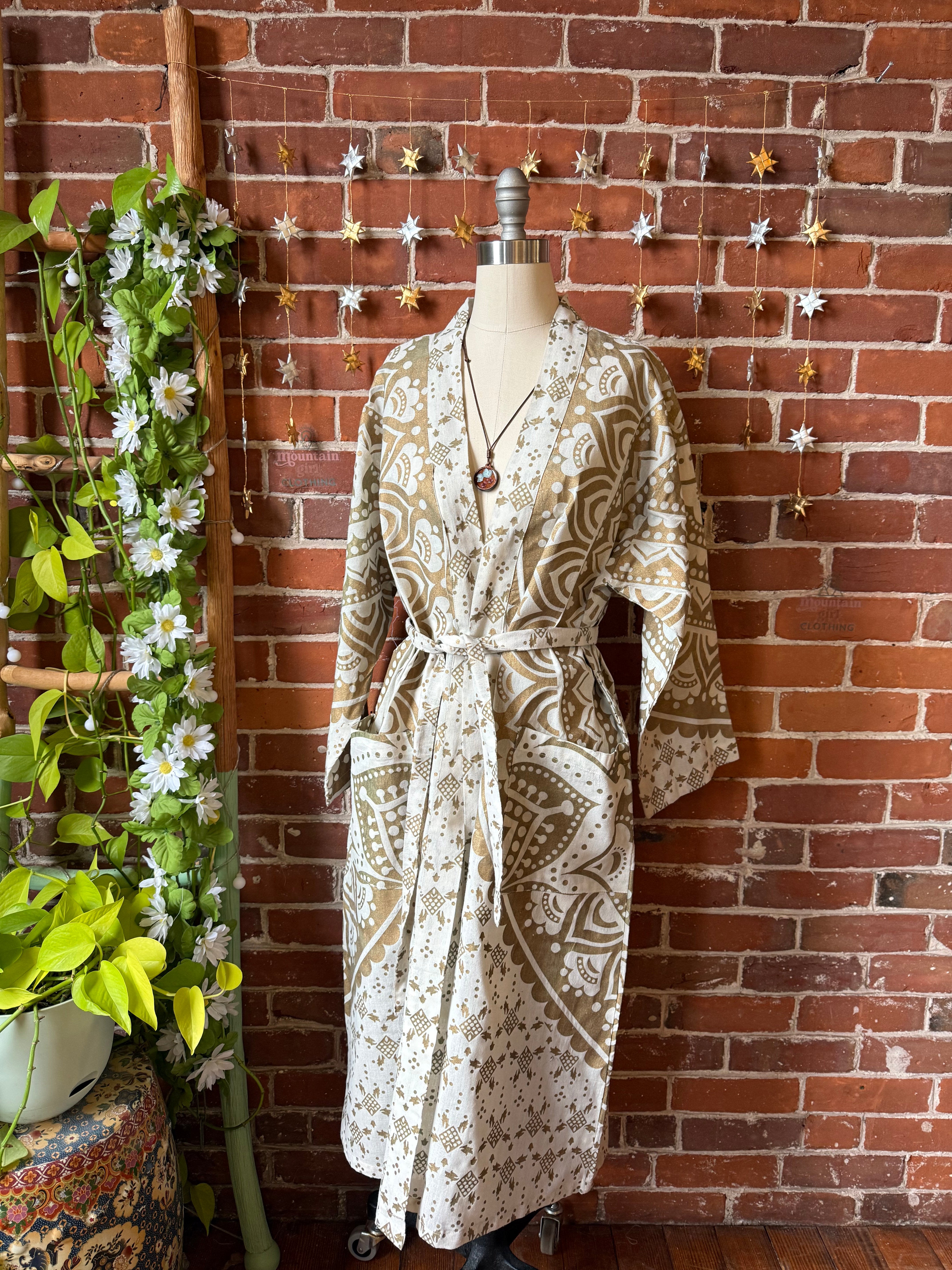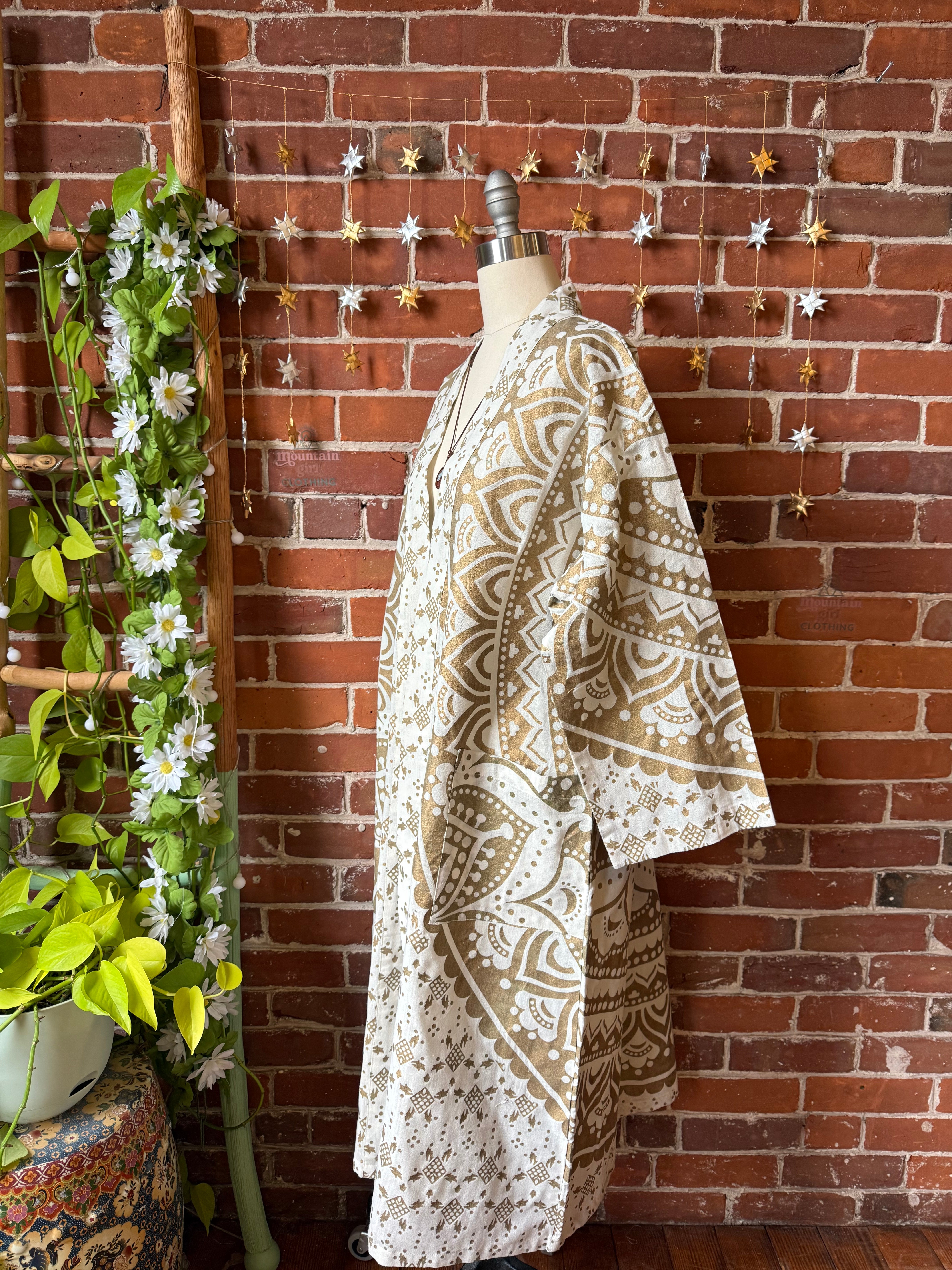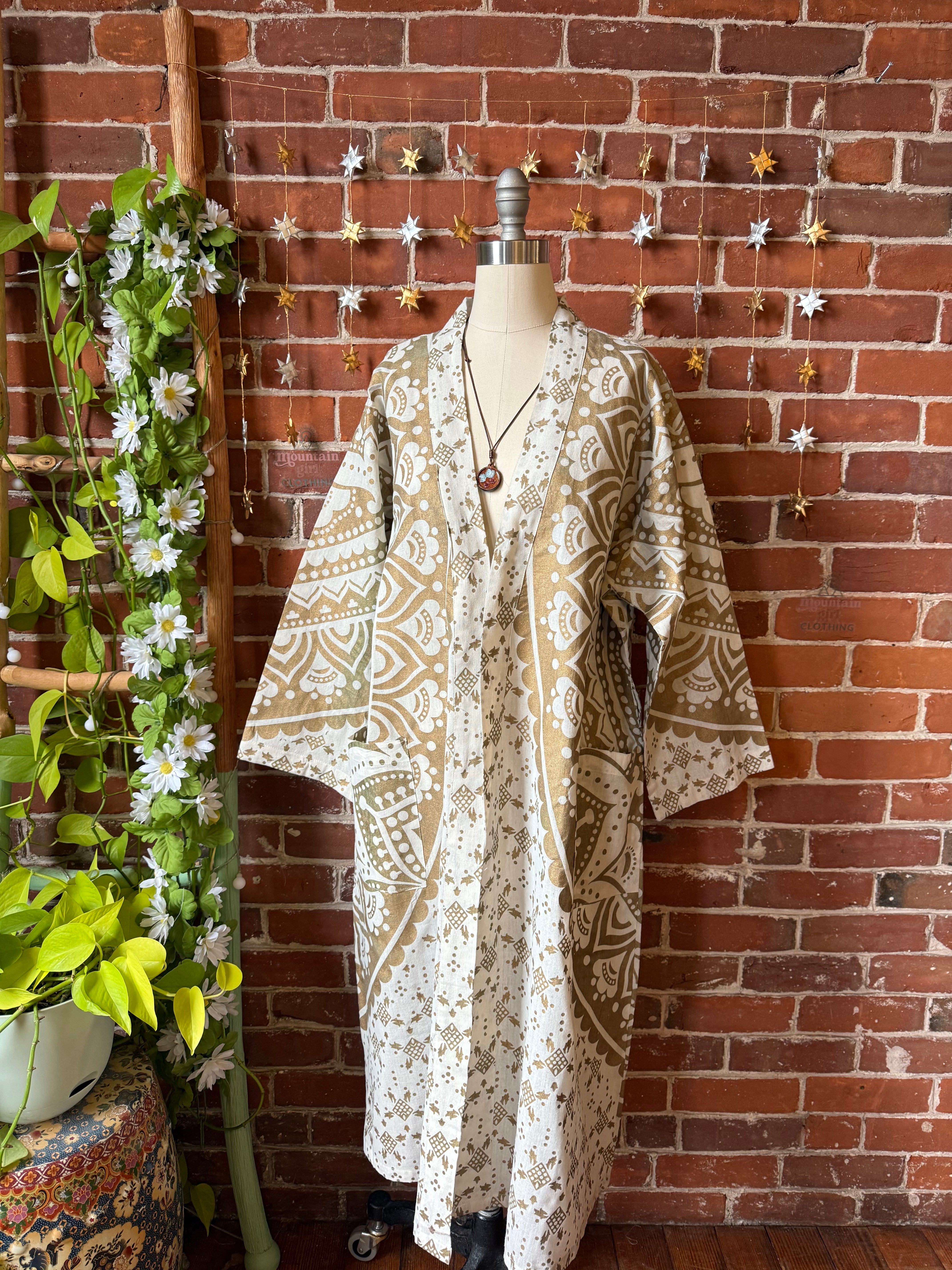 Gold + White Mandala Long Tapestry Robe Kimono with Pockets and Belt