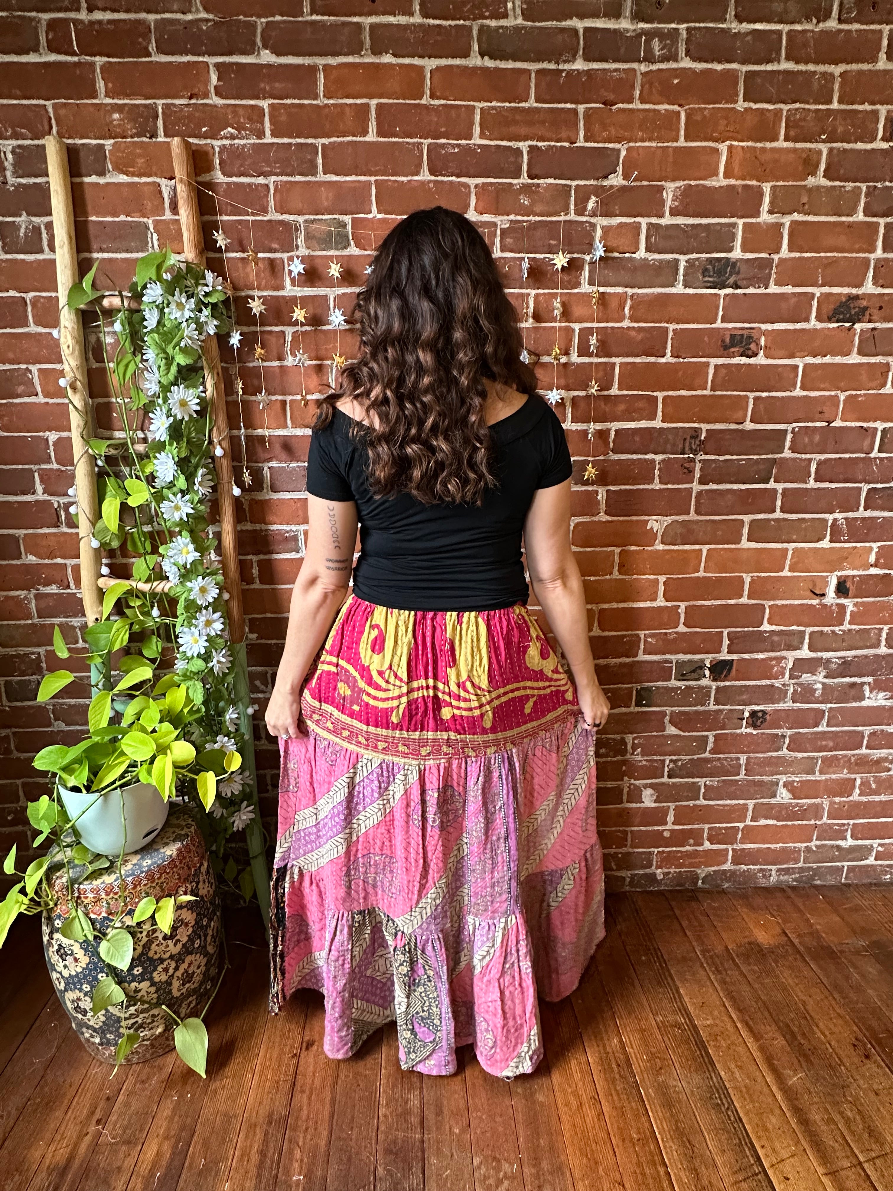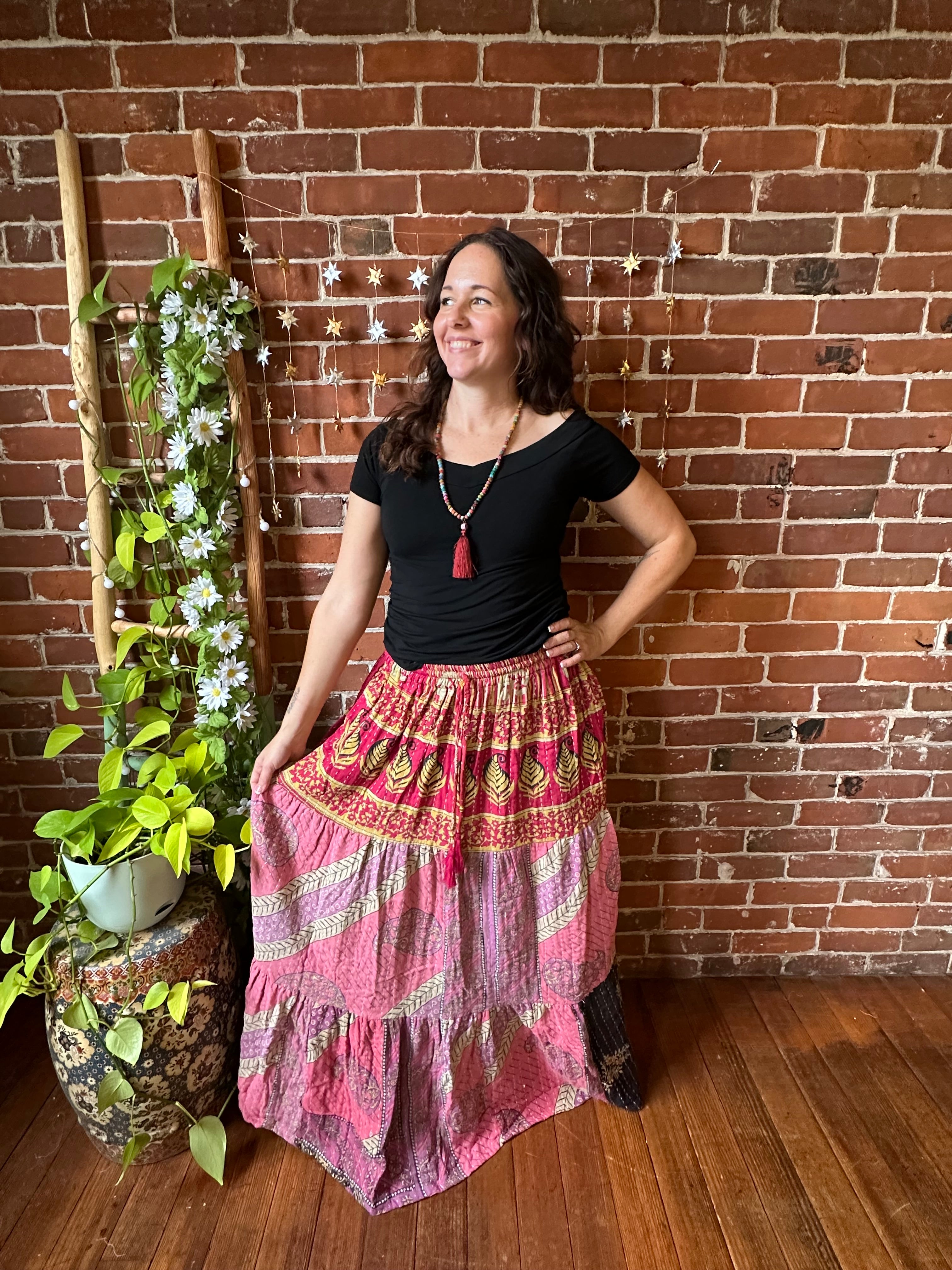 Add a pop of color and boho vibes to your wardrobe with these one of a kind recycled kantha fabric tiered skirt.