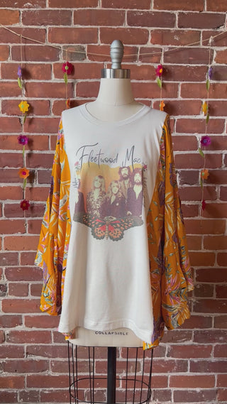 "Go Your Own Way" in this unique Fleetwood Mac flowy tshirt top. Made from an upcycled Fleetwood tshirt and featuring soft, flowy fabric bell sleeves in a botanical print, this is a must-have for any die-hard Fleetwood Mac fan. Perfect for concerts or everyday wear.