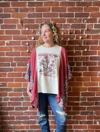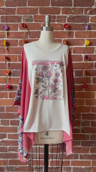 "Go Your Own Way" in this unique Fleetwood Mac embroidered poncho. Made from an upcycled Fleetwood tshirt and featuring soft, flowy poncho sleeves, this is a must-have for any die-hard Fleetwood Mac fan. Perfect for concerts or everyday wear.