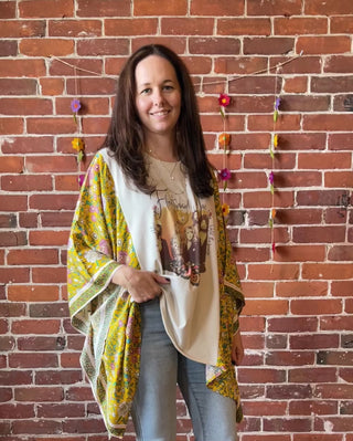 "Go Your Own Way" in this unique Fleetwood Mac floral print flowy poncho. Made from an upcycled Fleetwood tshirt and featuring soft, flowy poncho sleeves with armholes, this is a must-have for any die-hard Fleetwood Mac fan. Perfect for concerts or everyday wear.