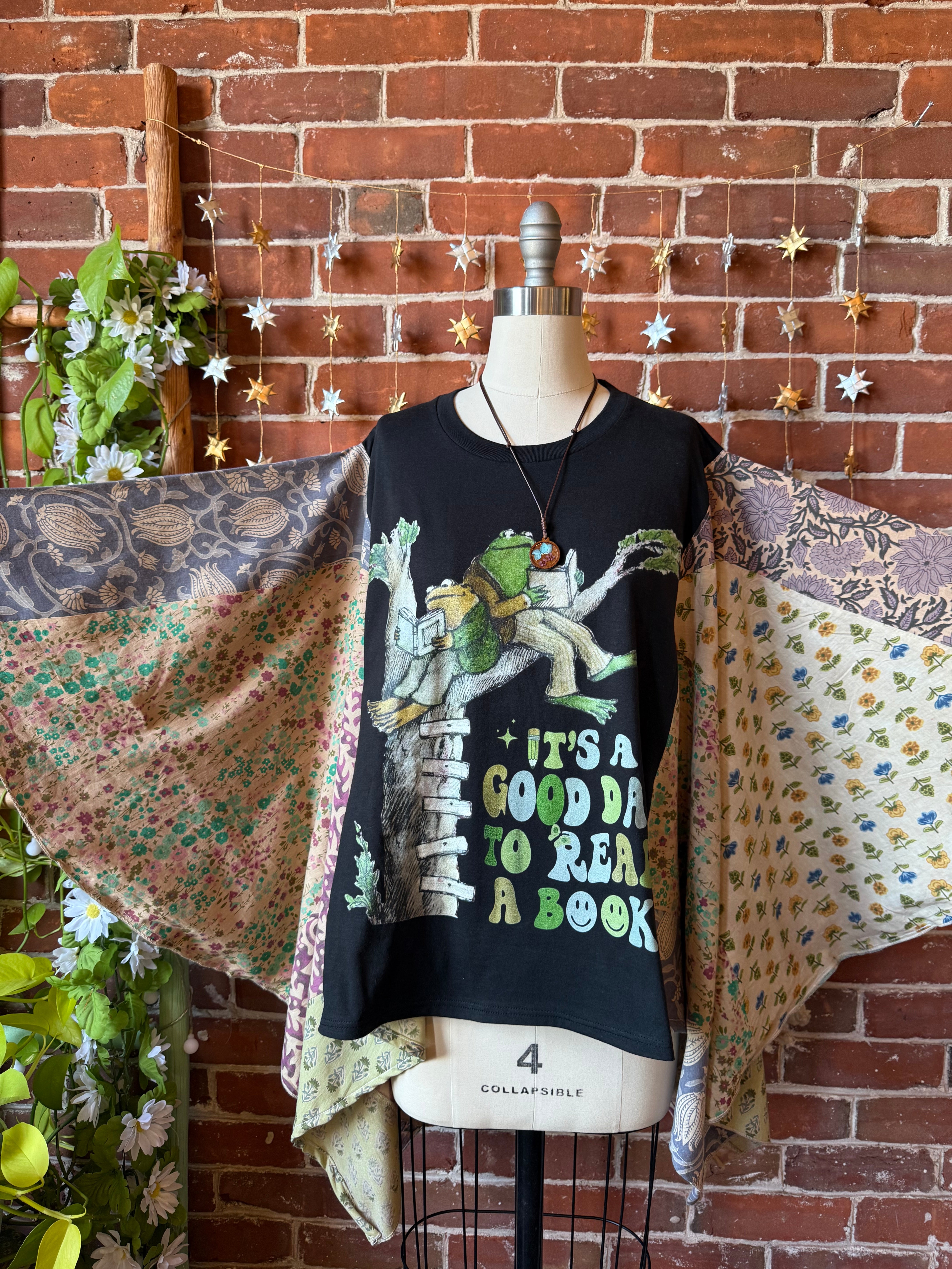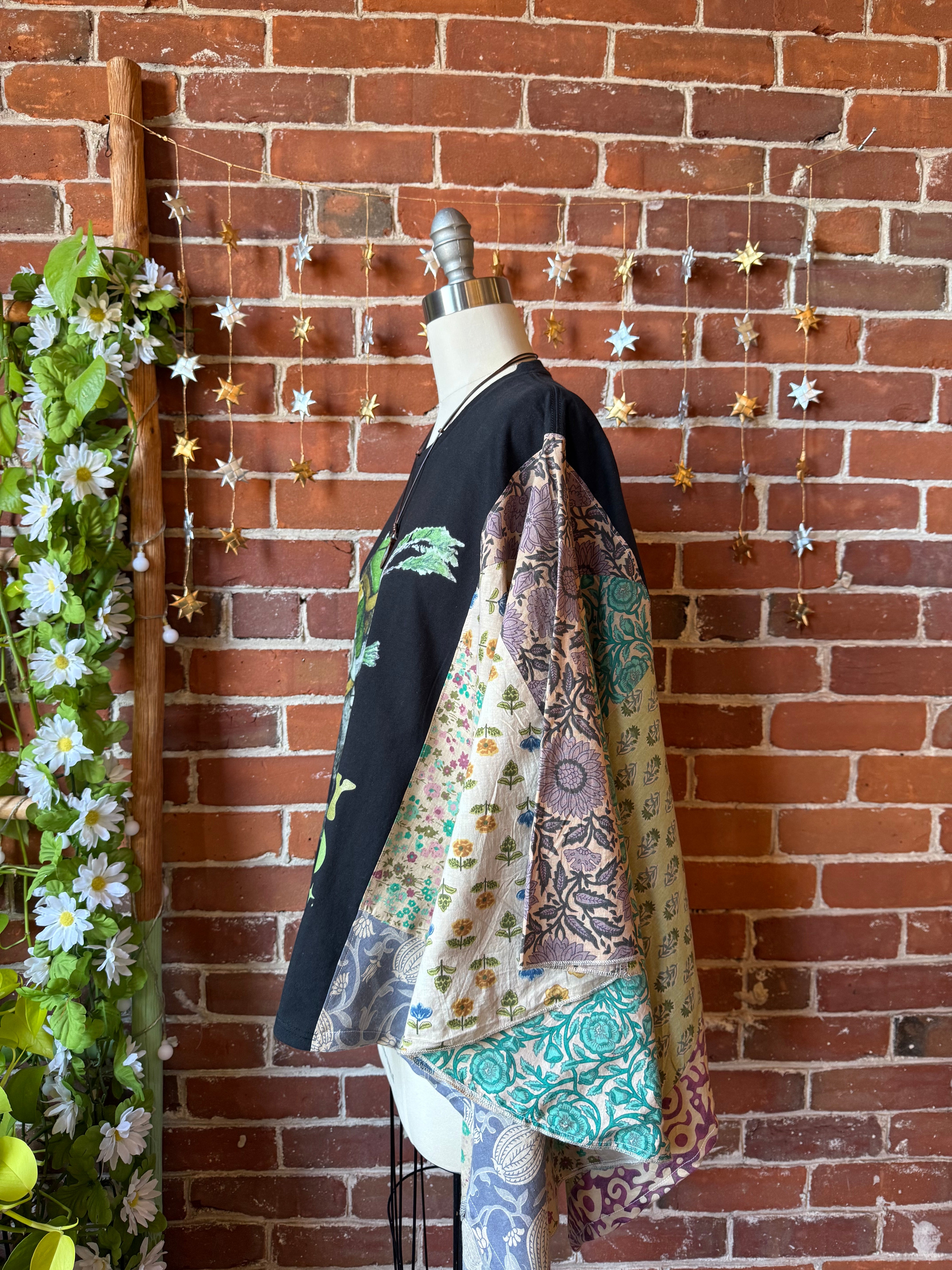 Upcycled tee and flowy fabric on the sides, patchwork angel wing style