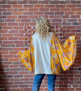 Channel your inner rock goddess with this flowy bell sleeve tshirt top. Made from an upcycled tshirt and featuring soft, flowy fabric bell sleeves in a botanical print, this is a must-have for any die-hard classic rock fan. Perfect for concerts or everyday wear.