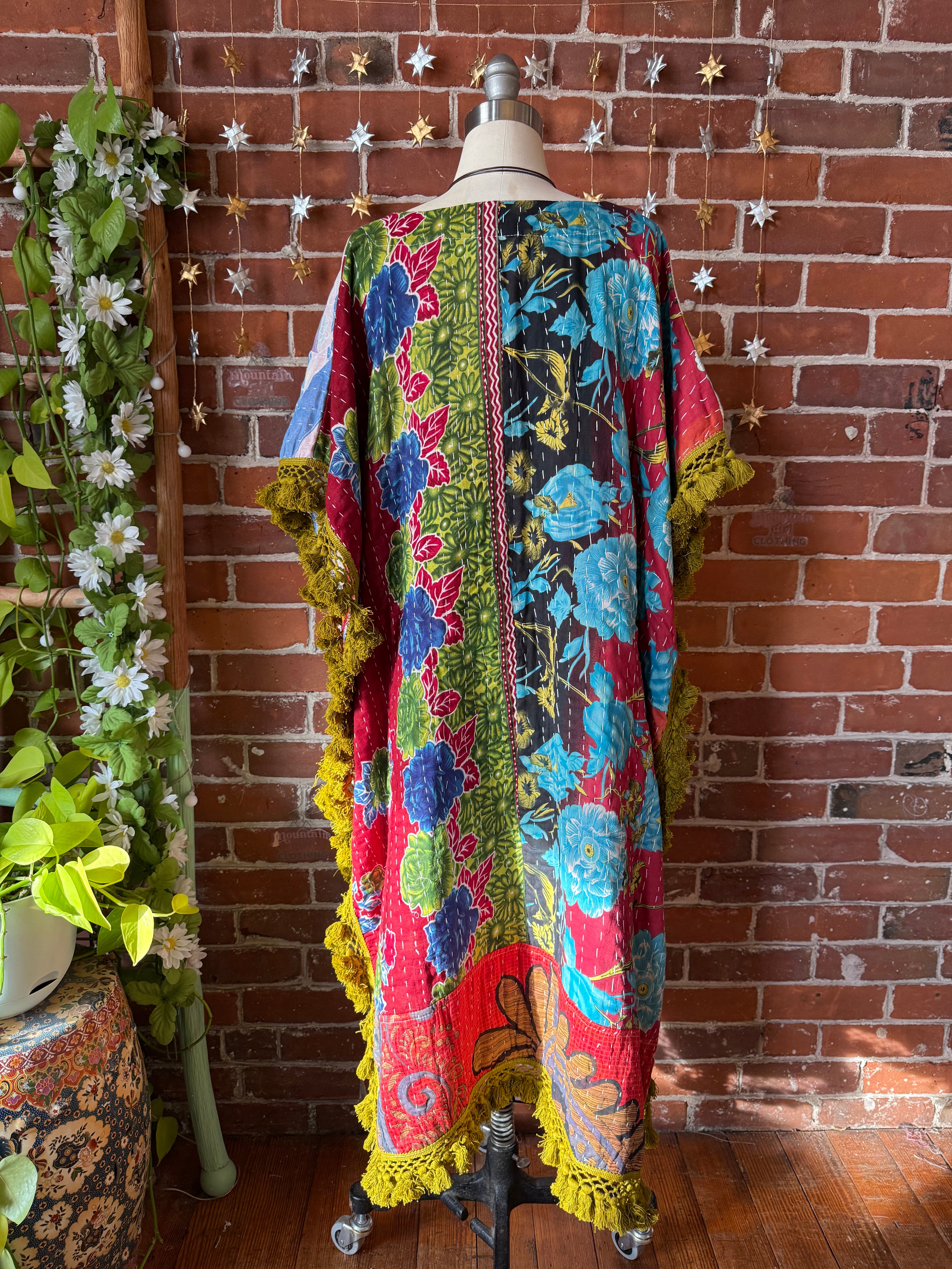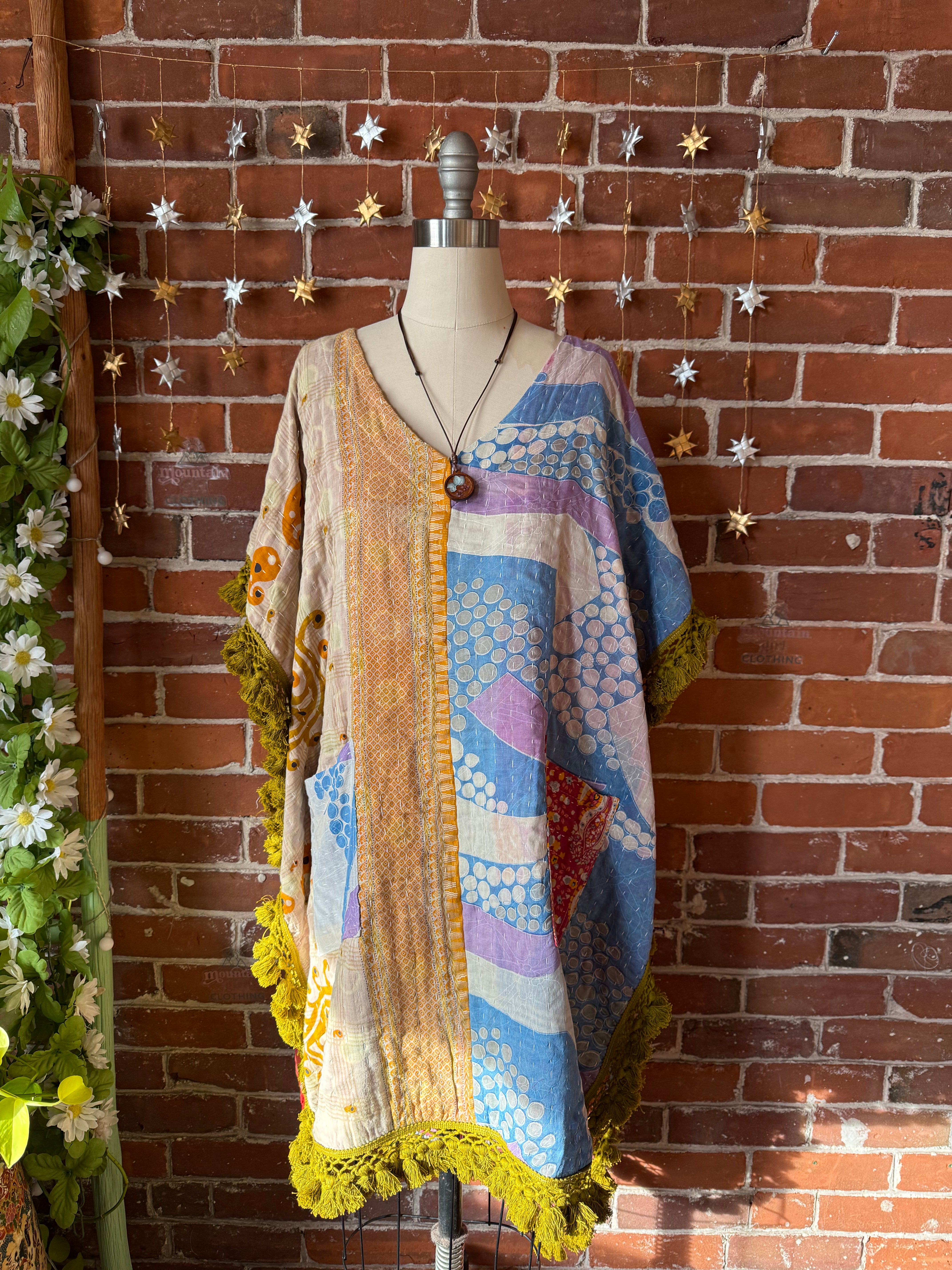 Wrap yourself in vibrant, free-spirited charm with this one-of-a-kind boho kantha poncho top. Crafted from upcycled Kantha fabric, each piece tells its own story through a stunning mix of hand-stitched patterns, bold colors, and intricate textures. The relaxed, flowy silhouette and V-neckline make it perfect for layering over jeans, leggings, or palazzo pants. Finished with playful fringe trim for that extra touch of bohemian flair.