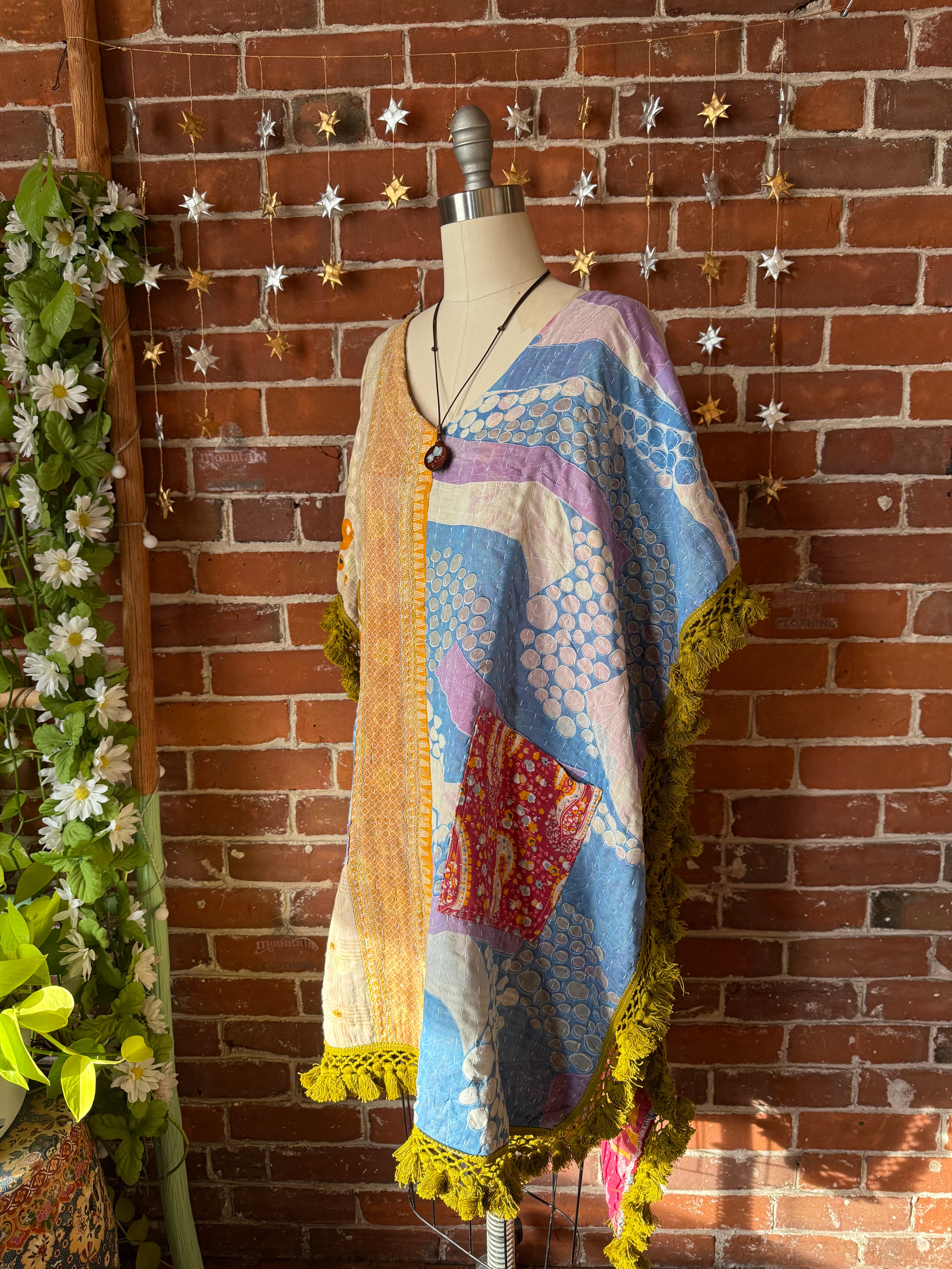 Sierra Dreams Upcycled Cotton Kantha Poncho Tunic Top with Pockets
