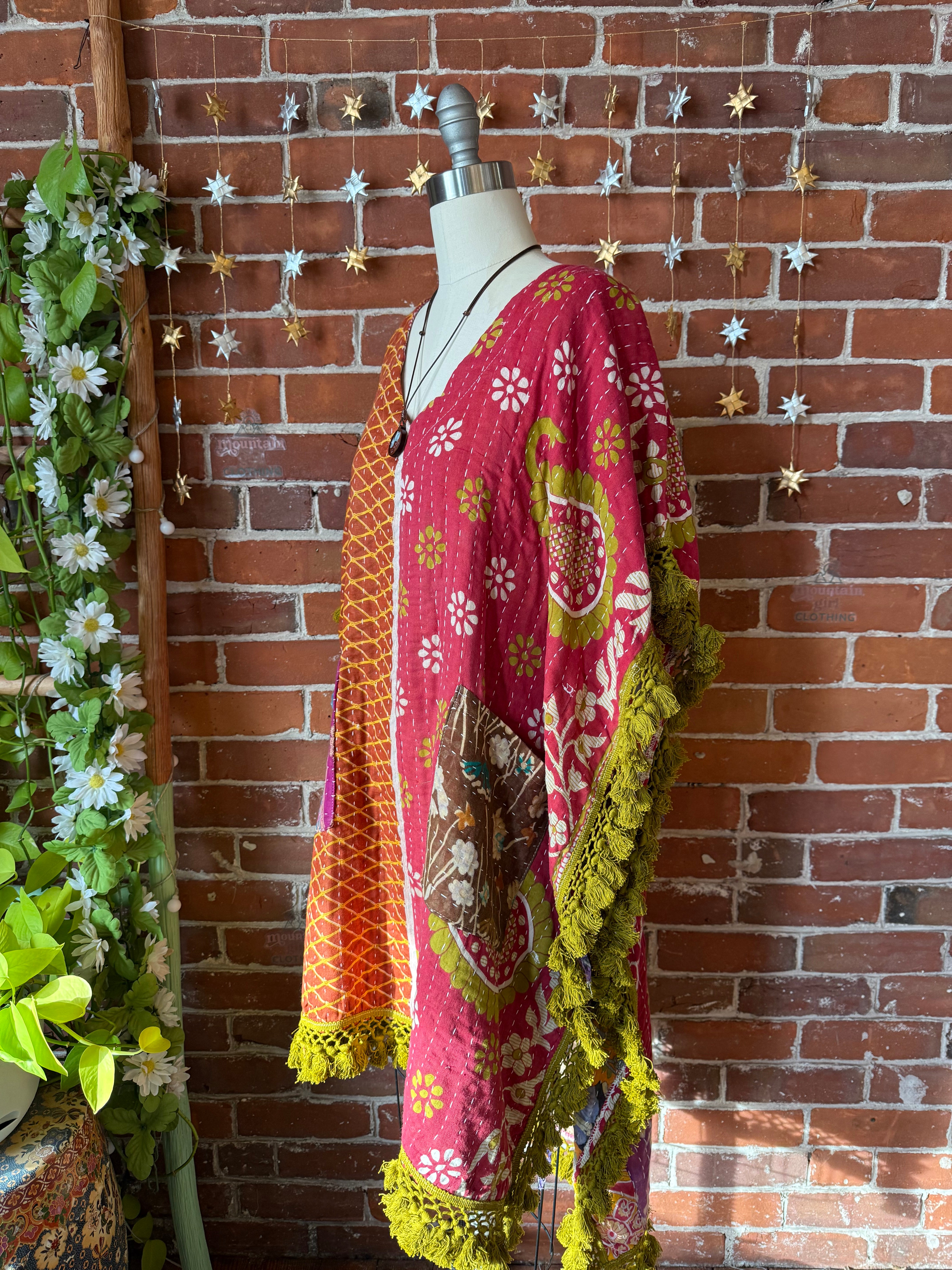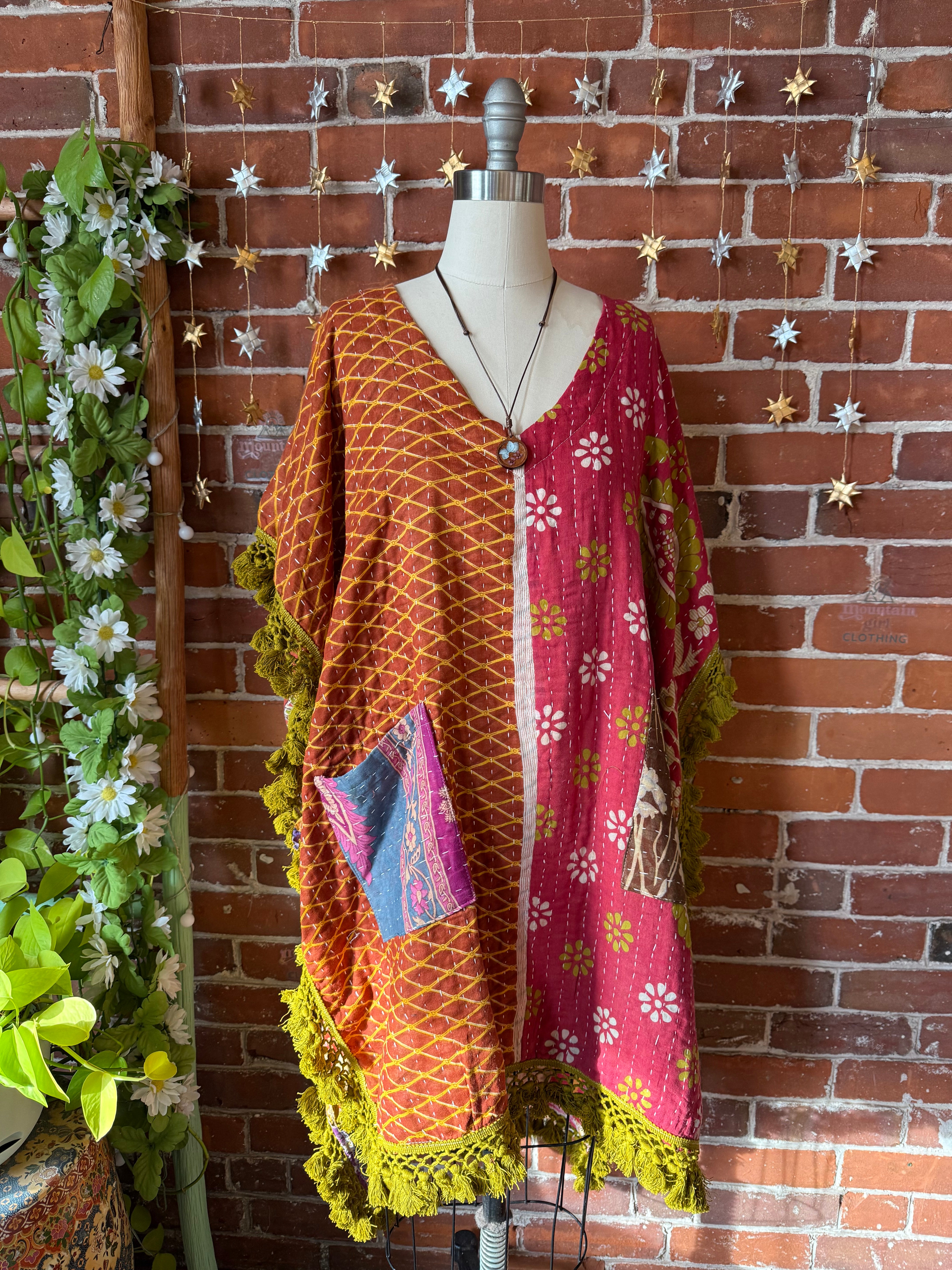 Wrap yourself in vibrant, free-spirited charm with this one-of-a-kind boho kantha poncho top. Crafted from upcycled Kantha fabric, each piece tells its own story through a stunning mix of hand-stitched patterns, bold colors, and intricate textures. The relaxed, flowy silhouette and V-neckline make it perfect for layering over jeans, leggings, or palazzo pants. Finished with playful fringe trim for that extra touch of bohemian flair.