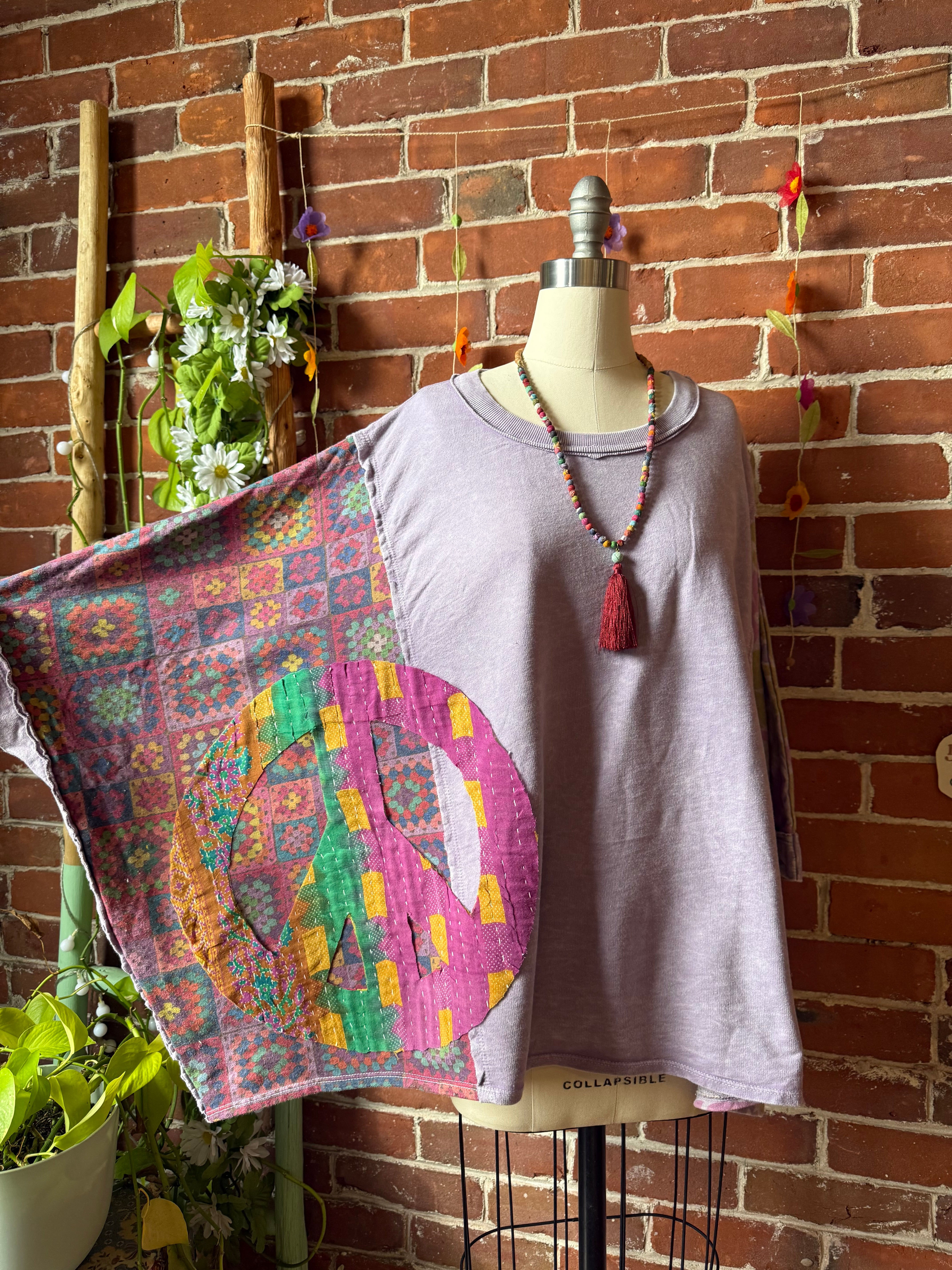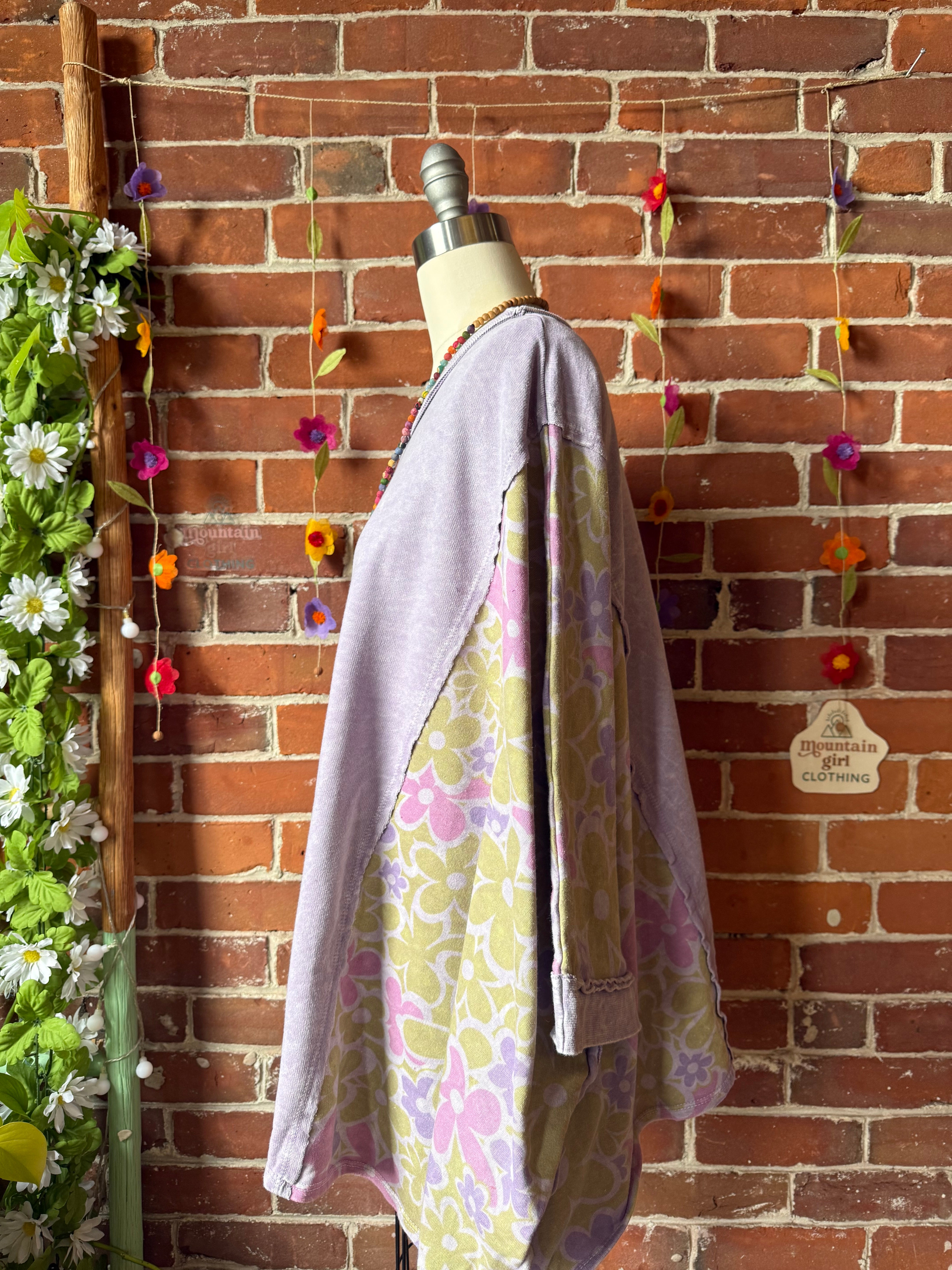 Upcycled flowy lightweight sweatshirt top and poncho sides with armholes.