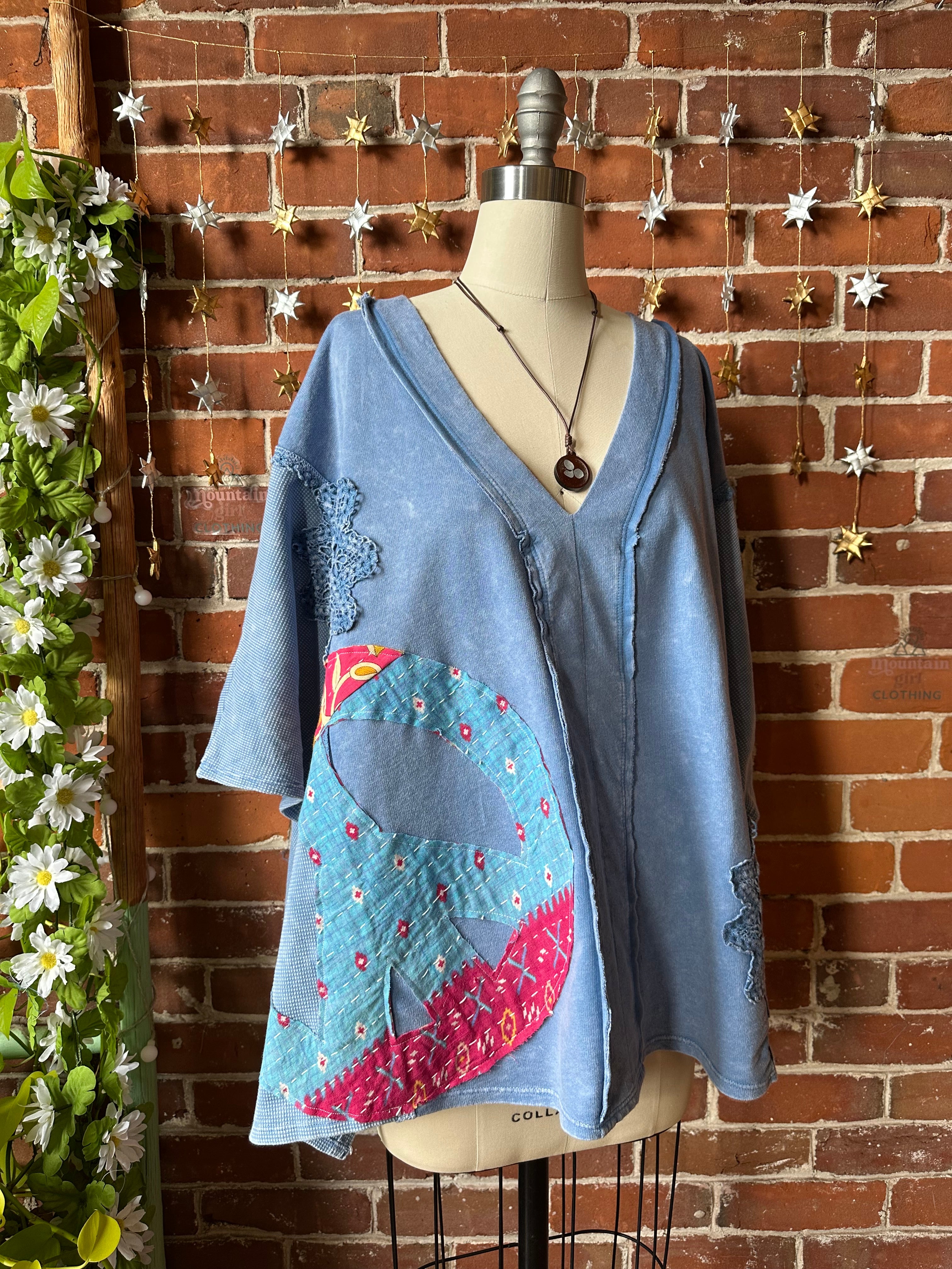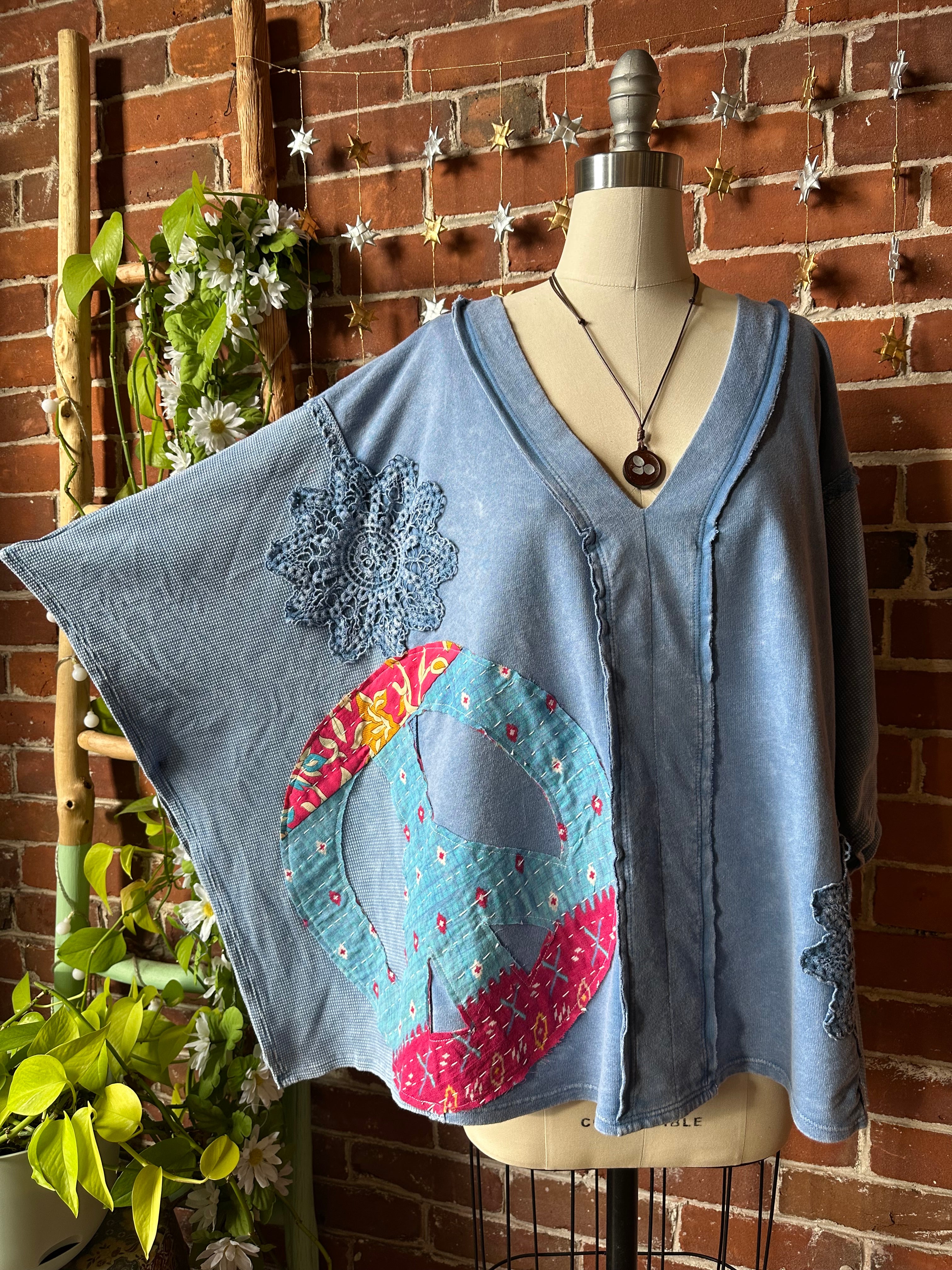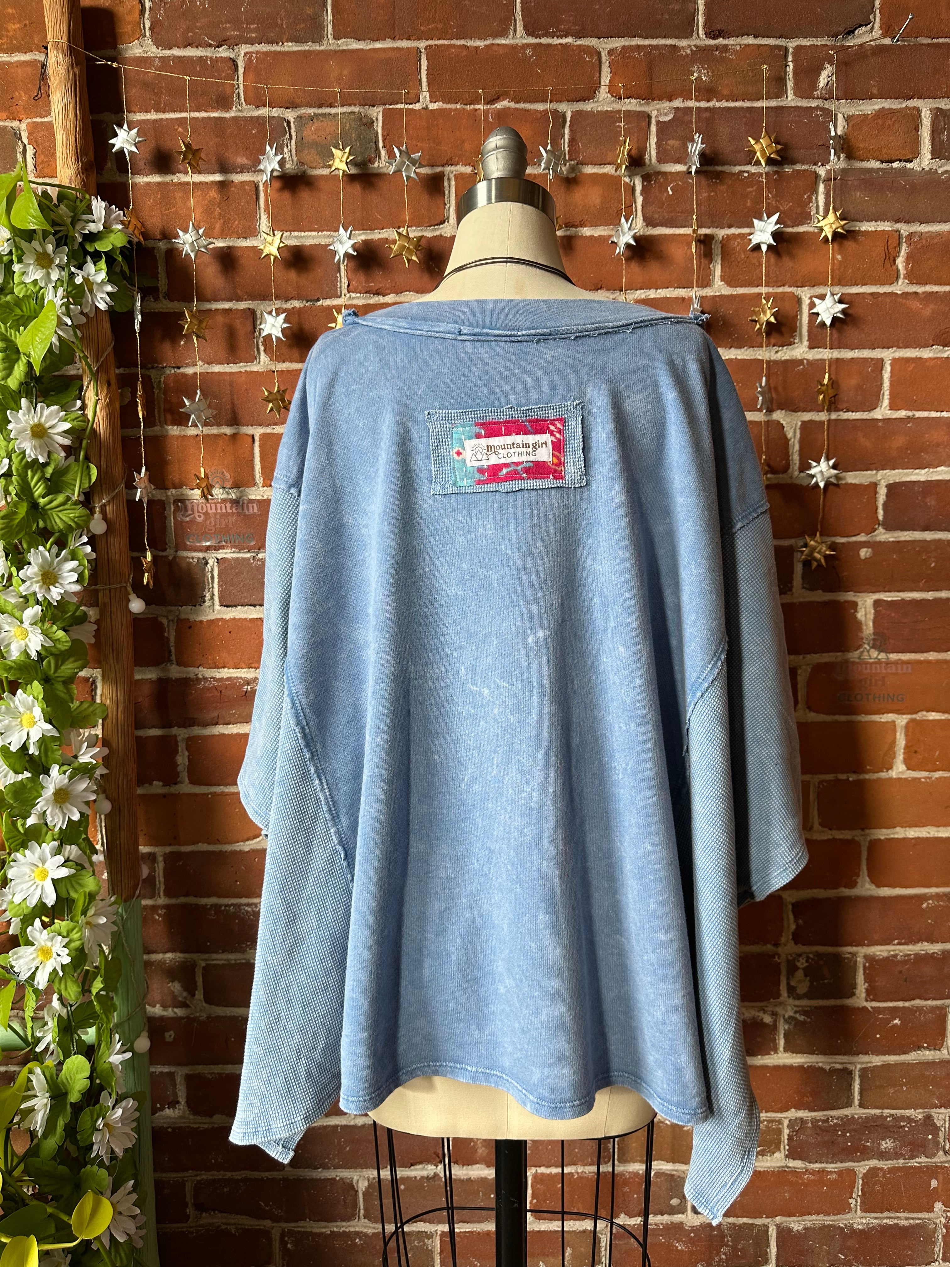 Upcycled flowy lightweight sweatshirt top and poncho sides with armholes.