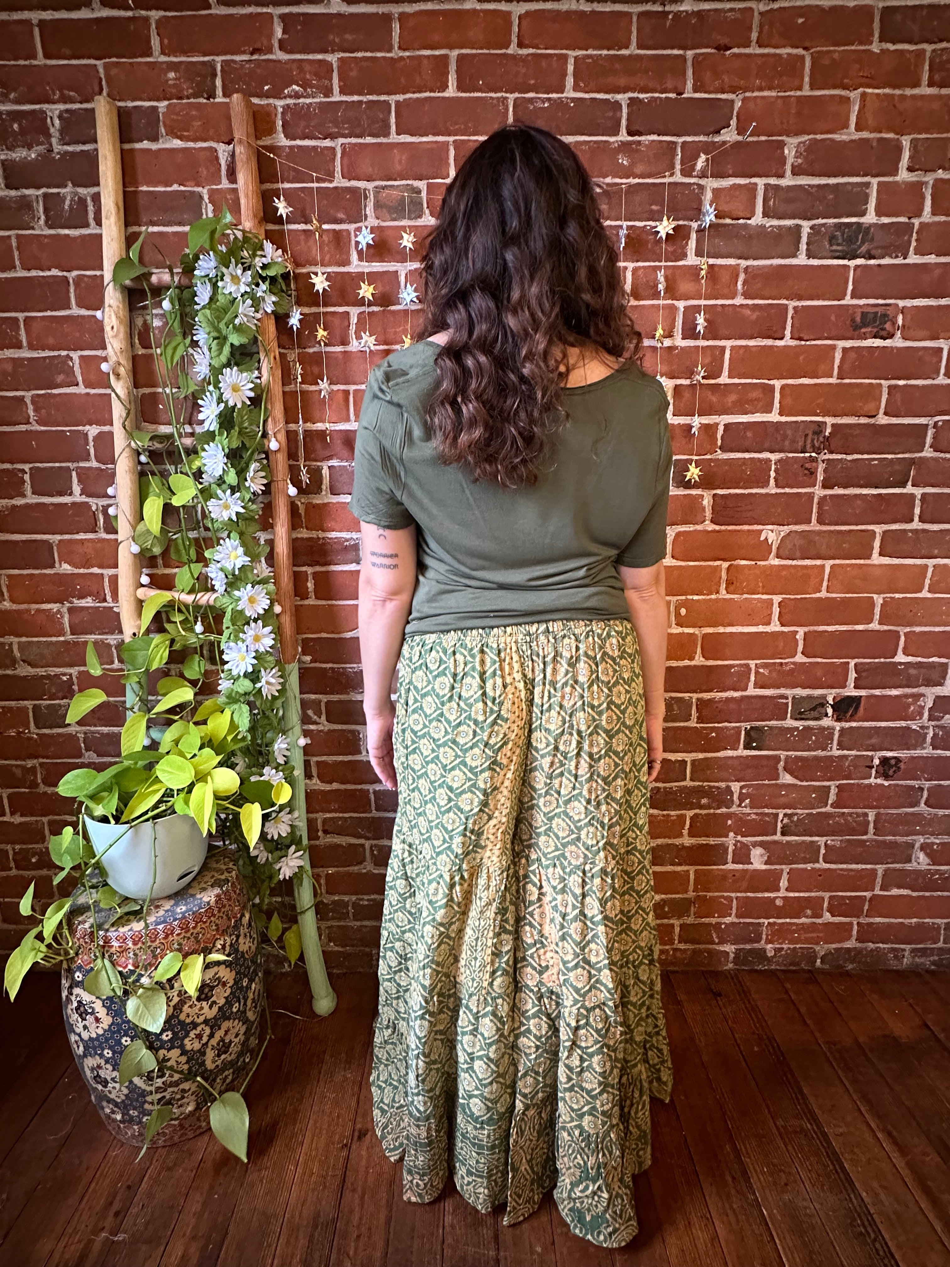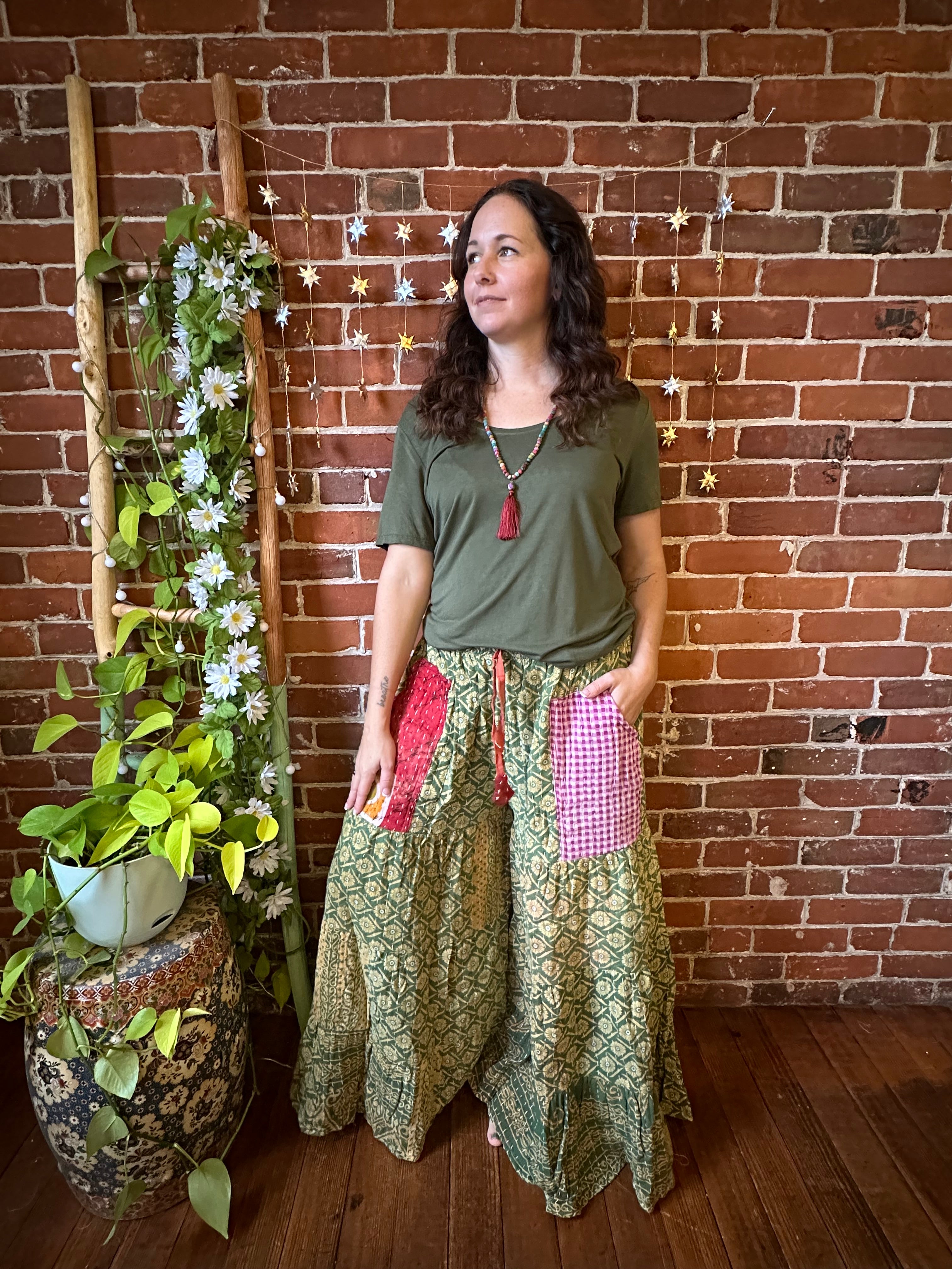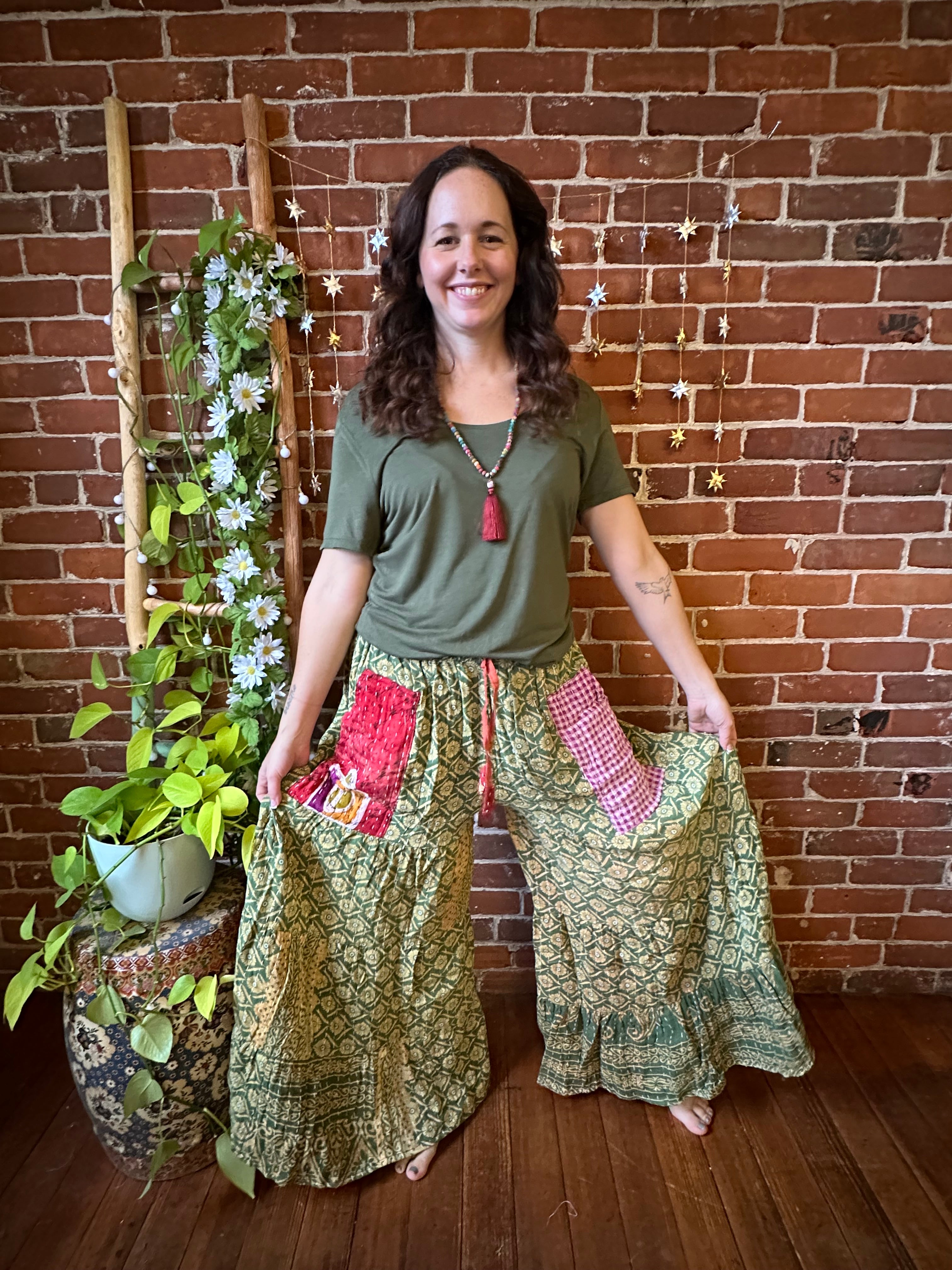 Add a pop of color and boho vibes to your wardrobe with these one of a kind recycled kantha fabric Super Wide Leg Tiered Pants. These are REVERSIBLE with pockets on each side!