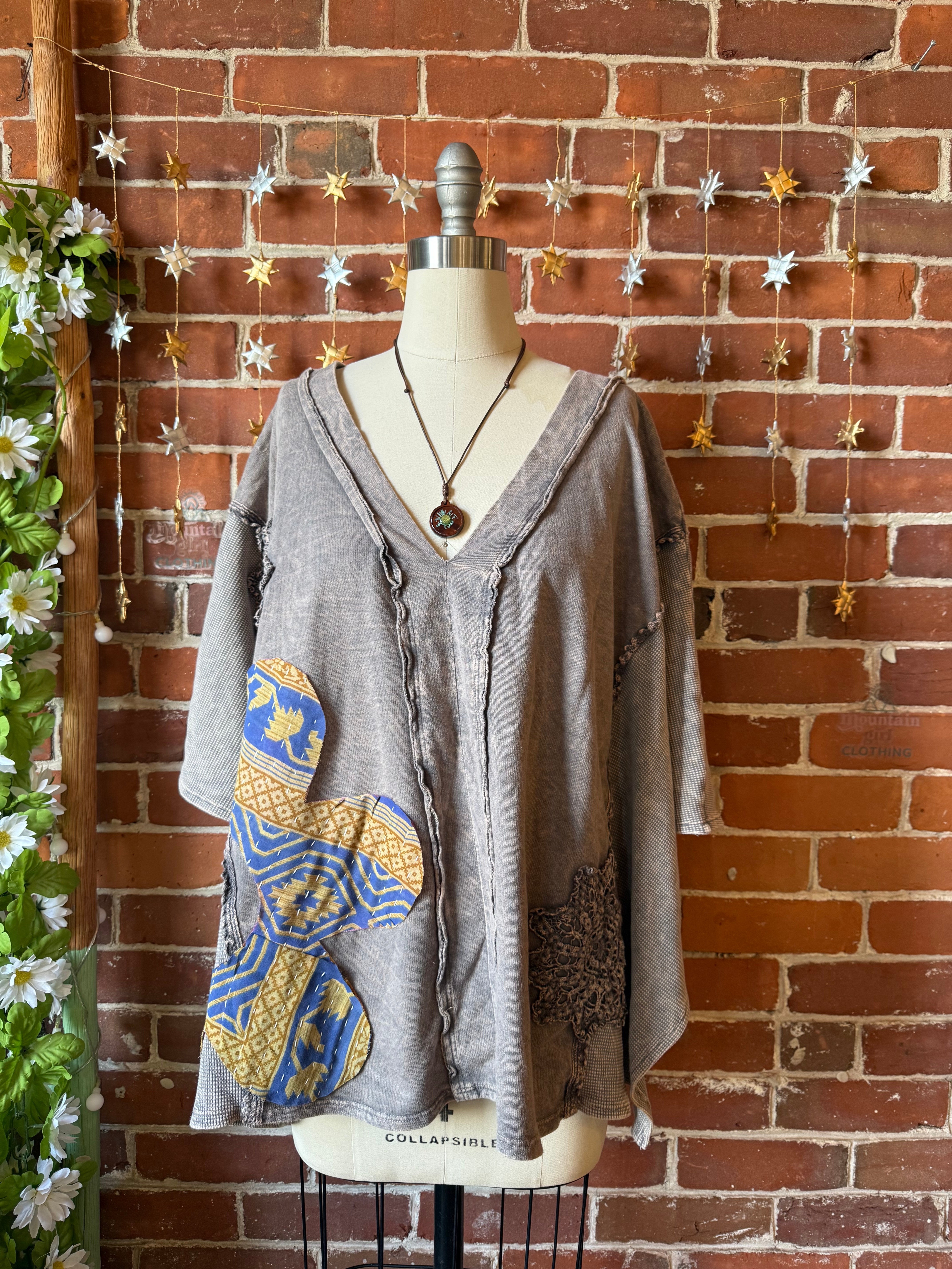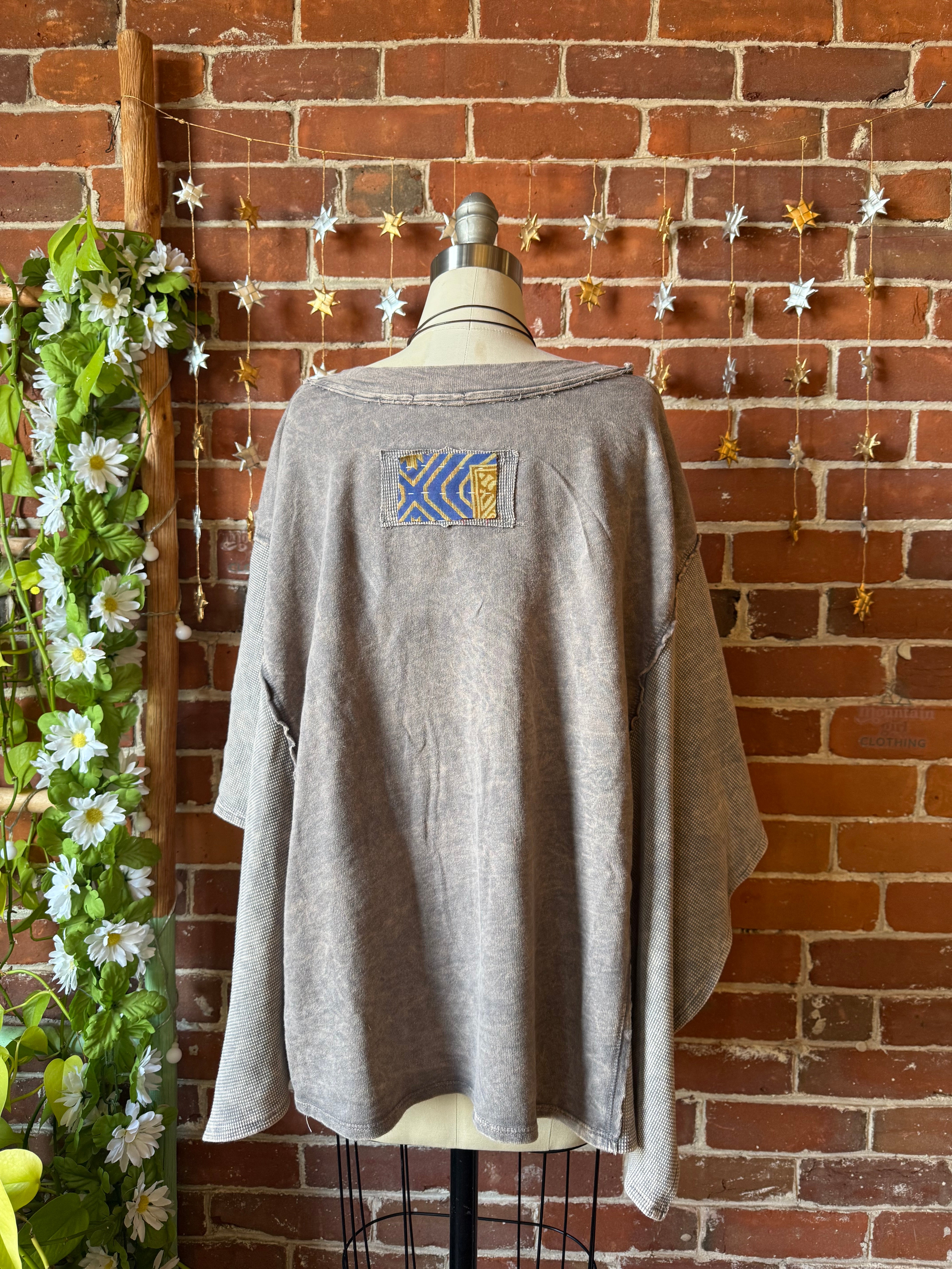 Upcycled flowy lightweight sweatshirt top and poncho sides with armholes.