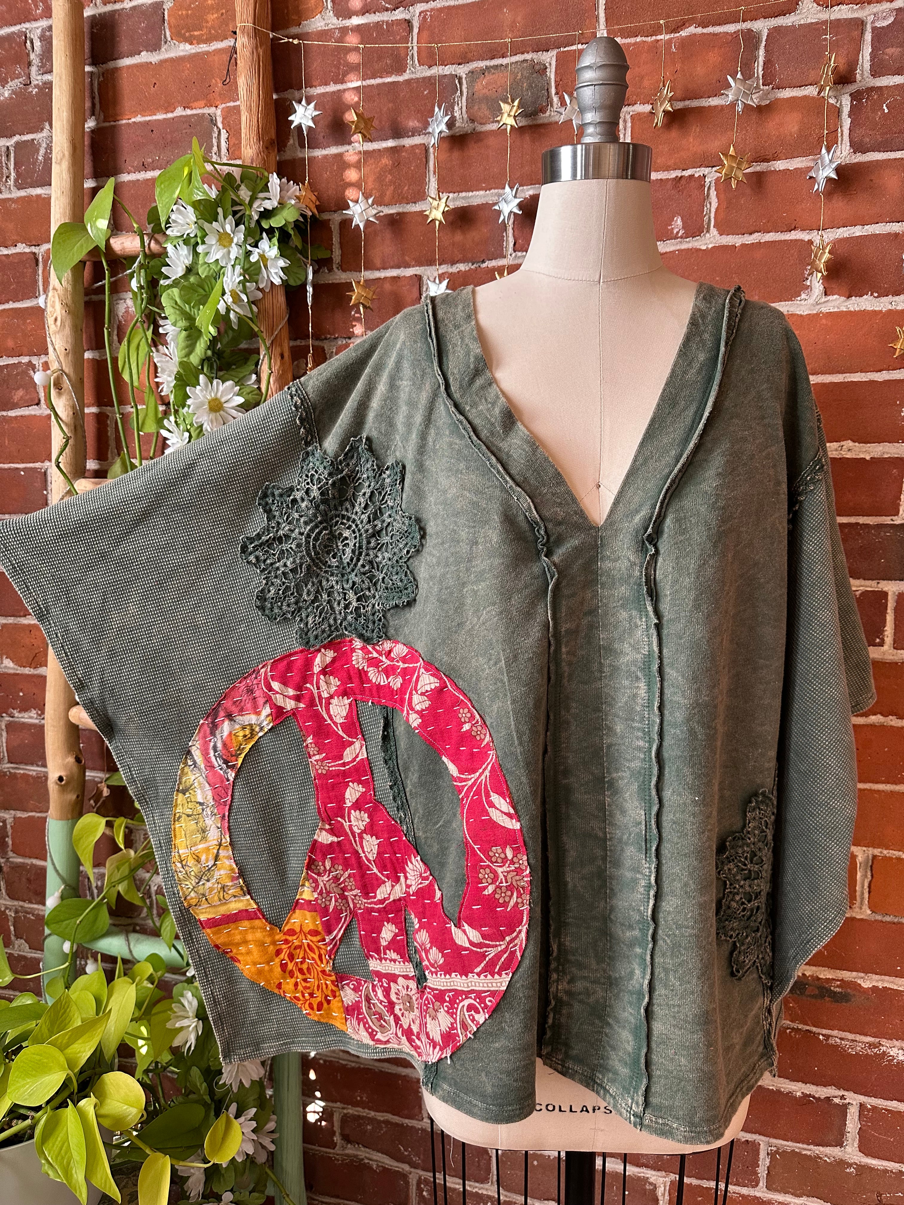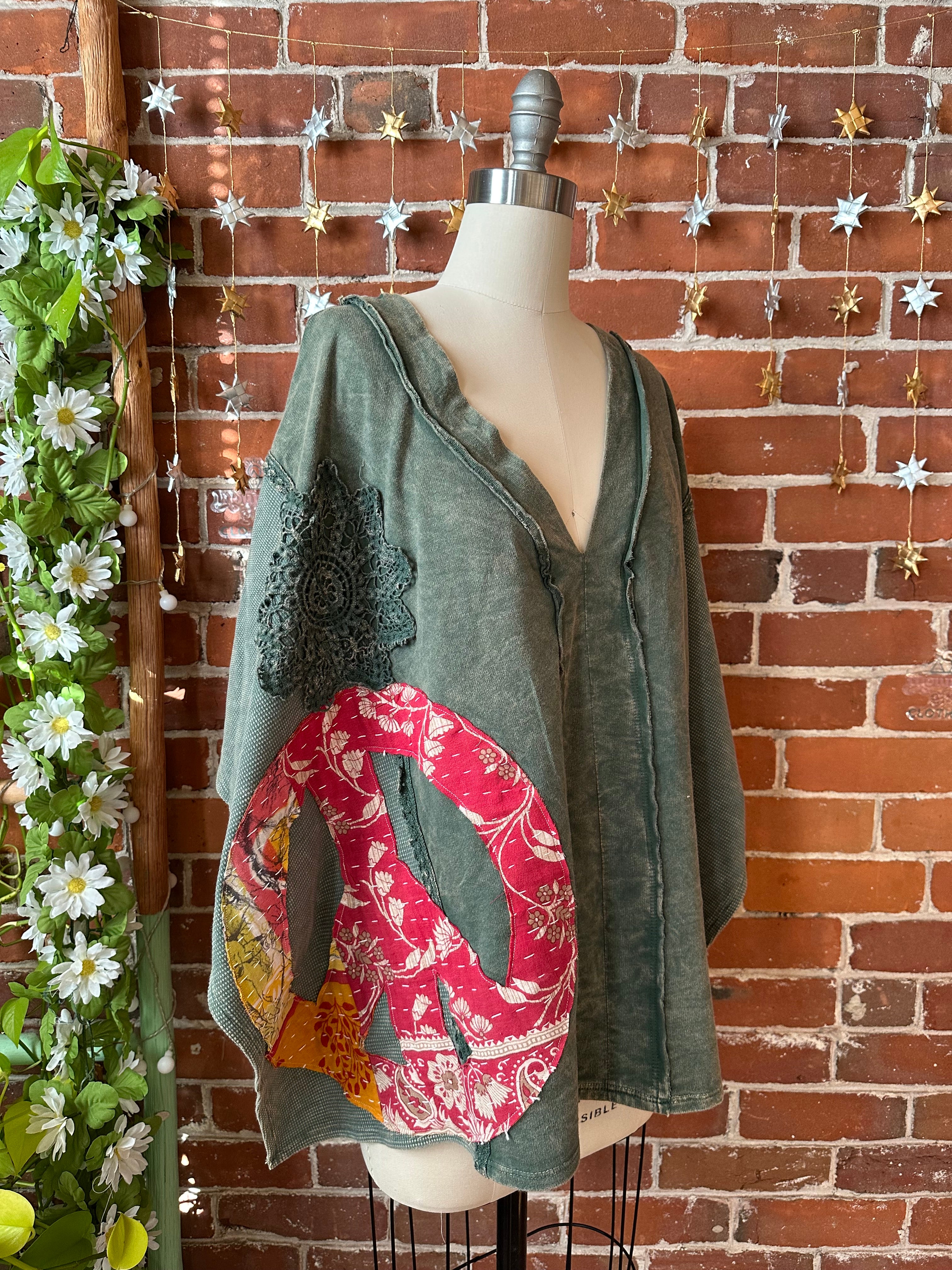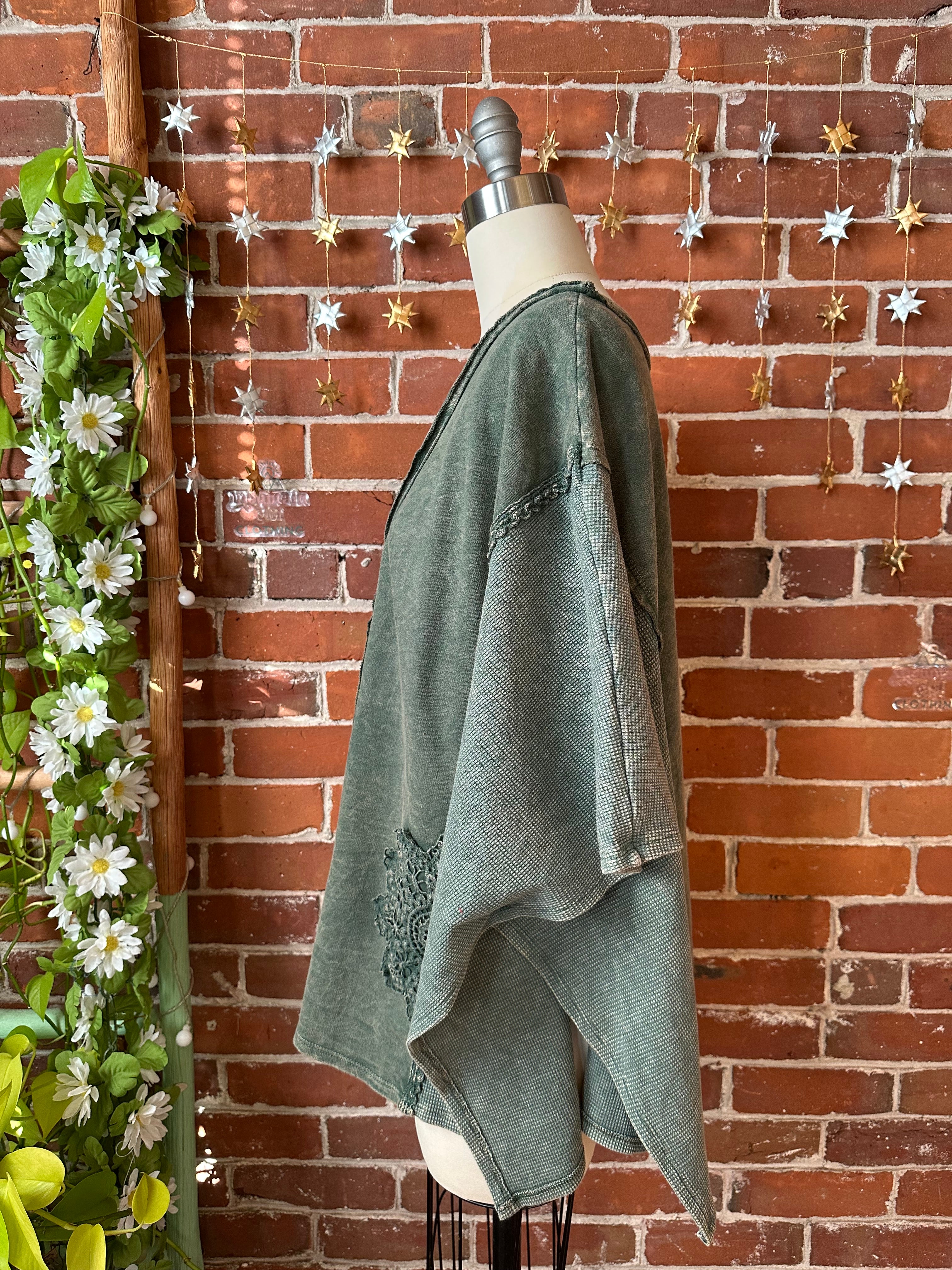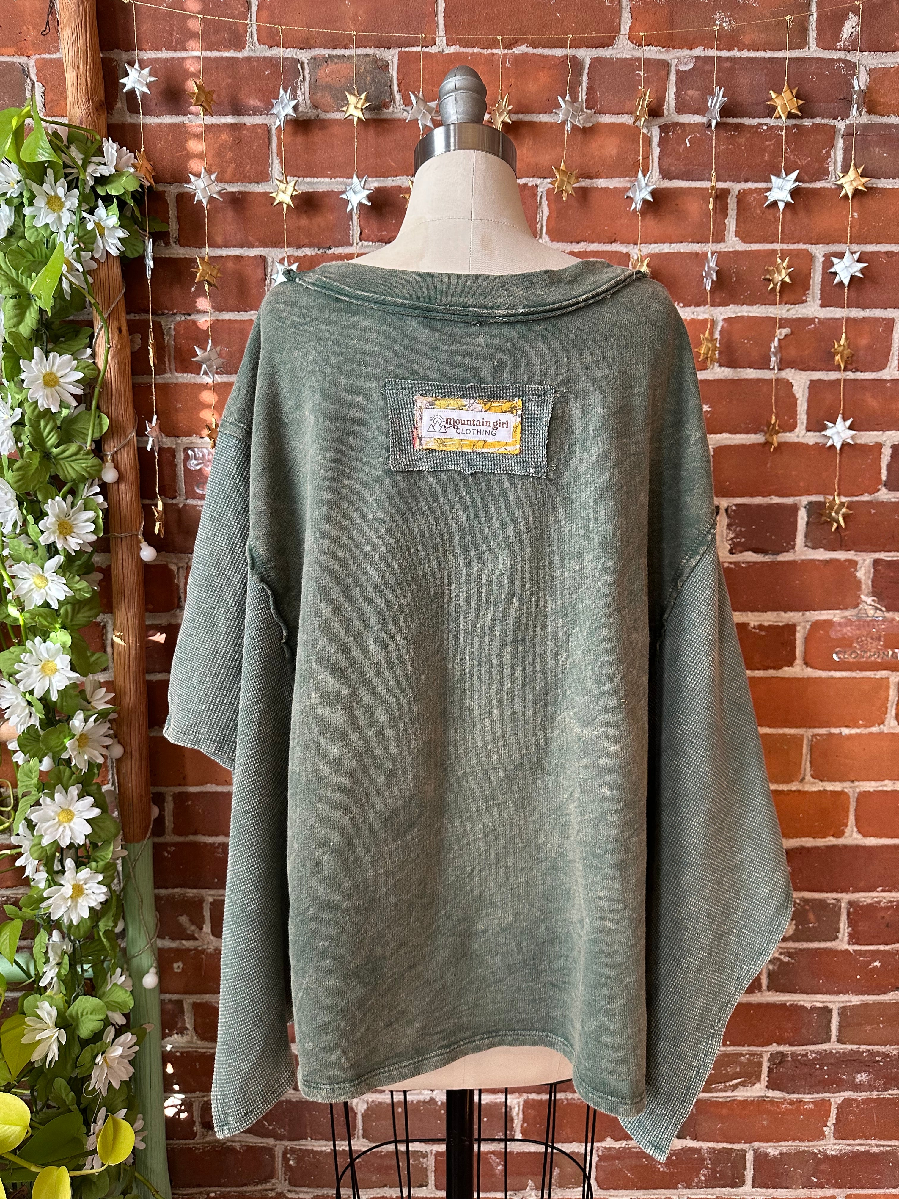 Upcycled flowy lightweight sweatshirt top and poncho sides with armholes.