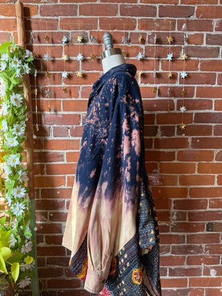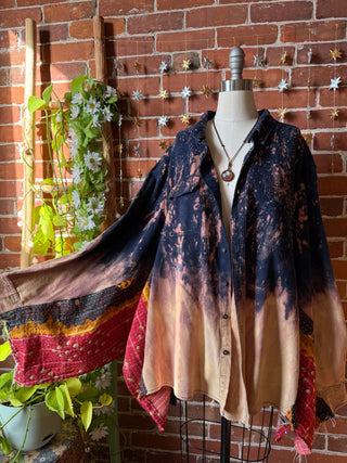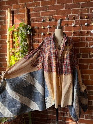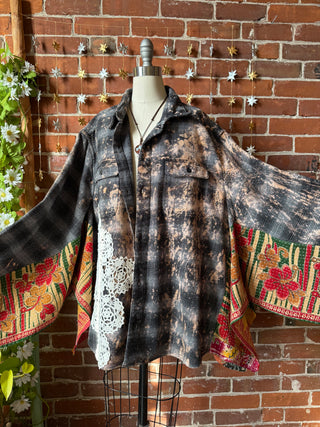 OOAK Winter Collection- Birdsong Kantha + Bleach Plaid Button Up Wing Style Poncho Jacket