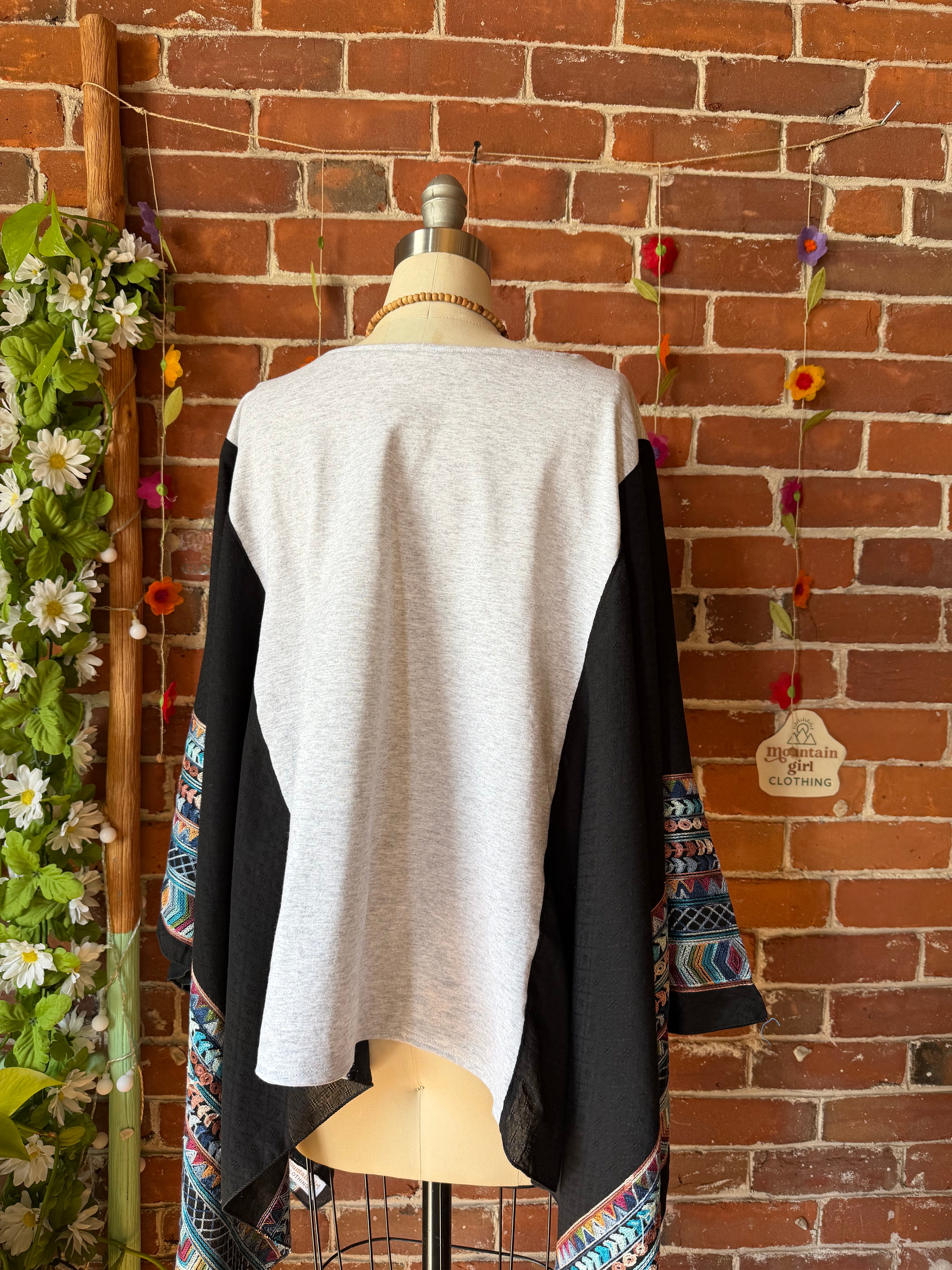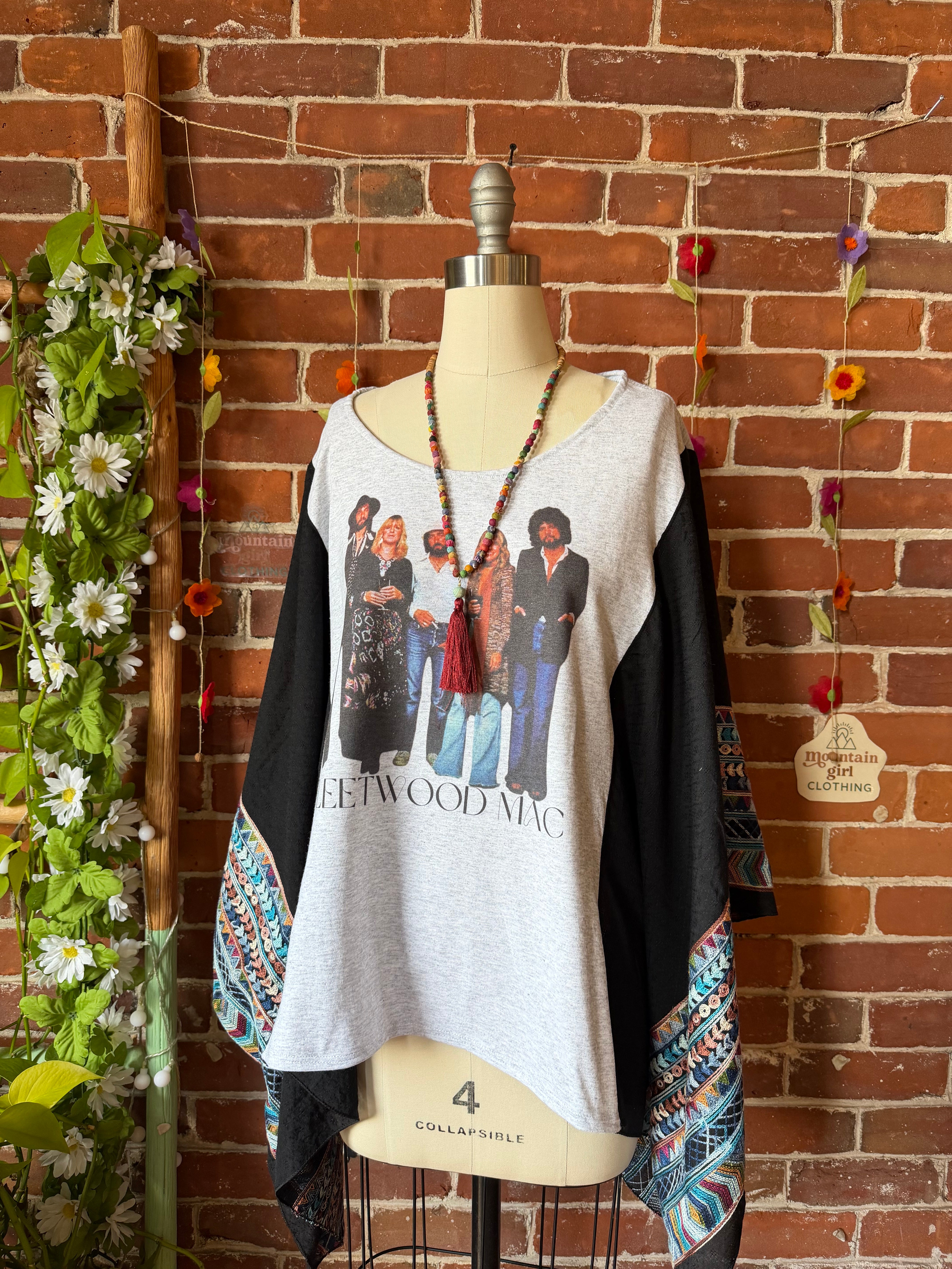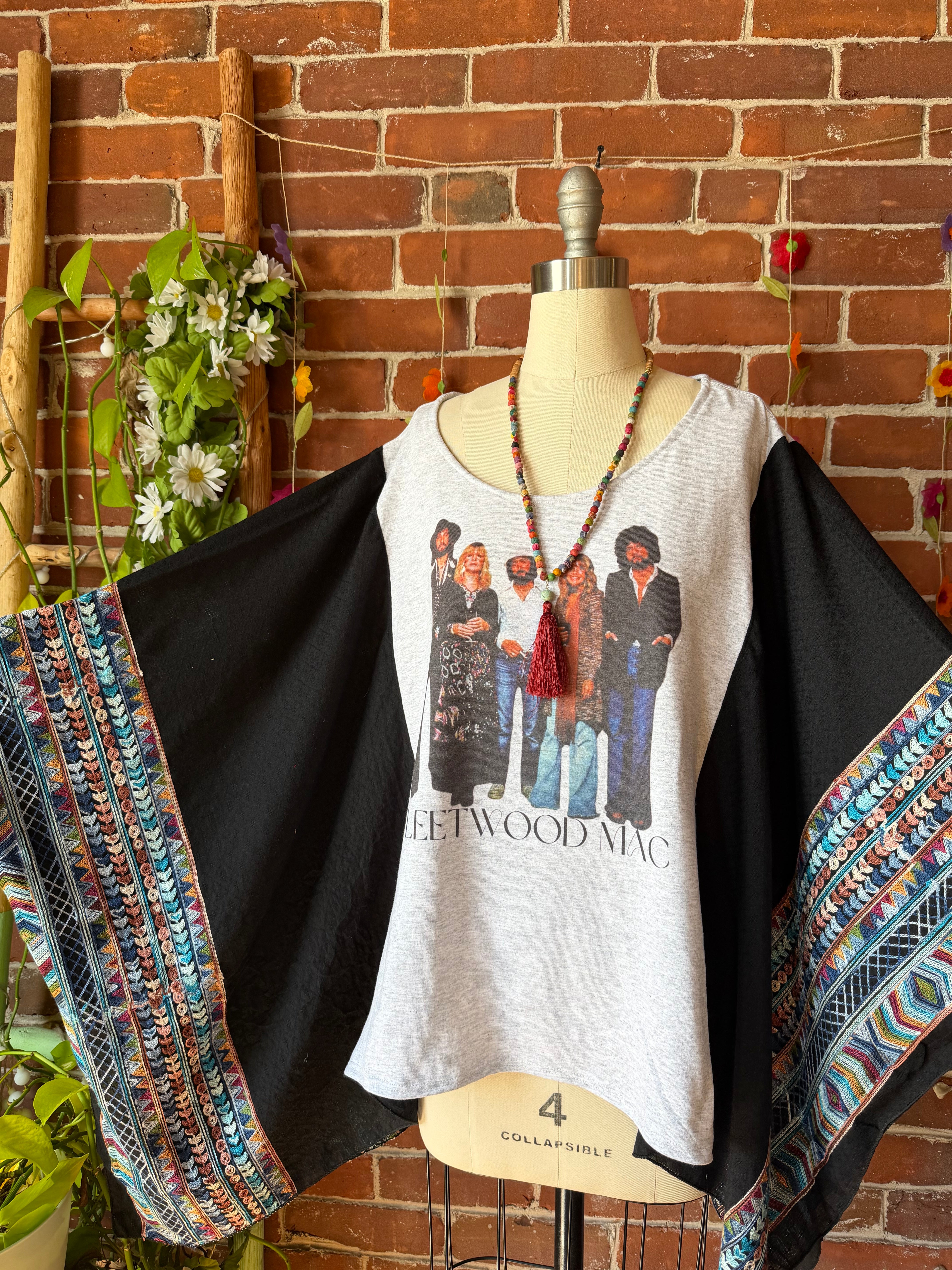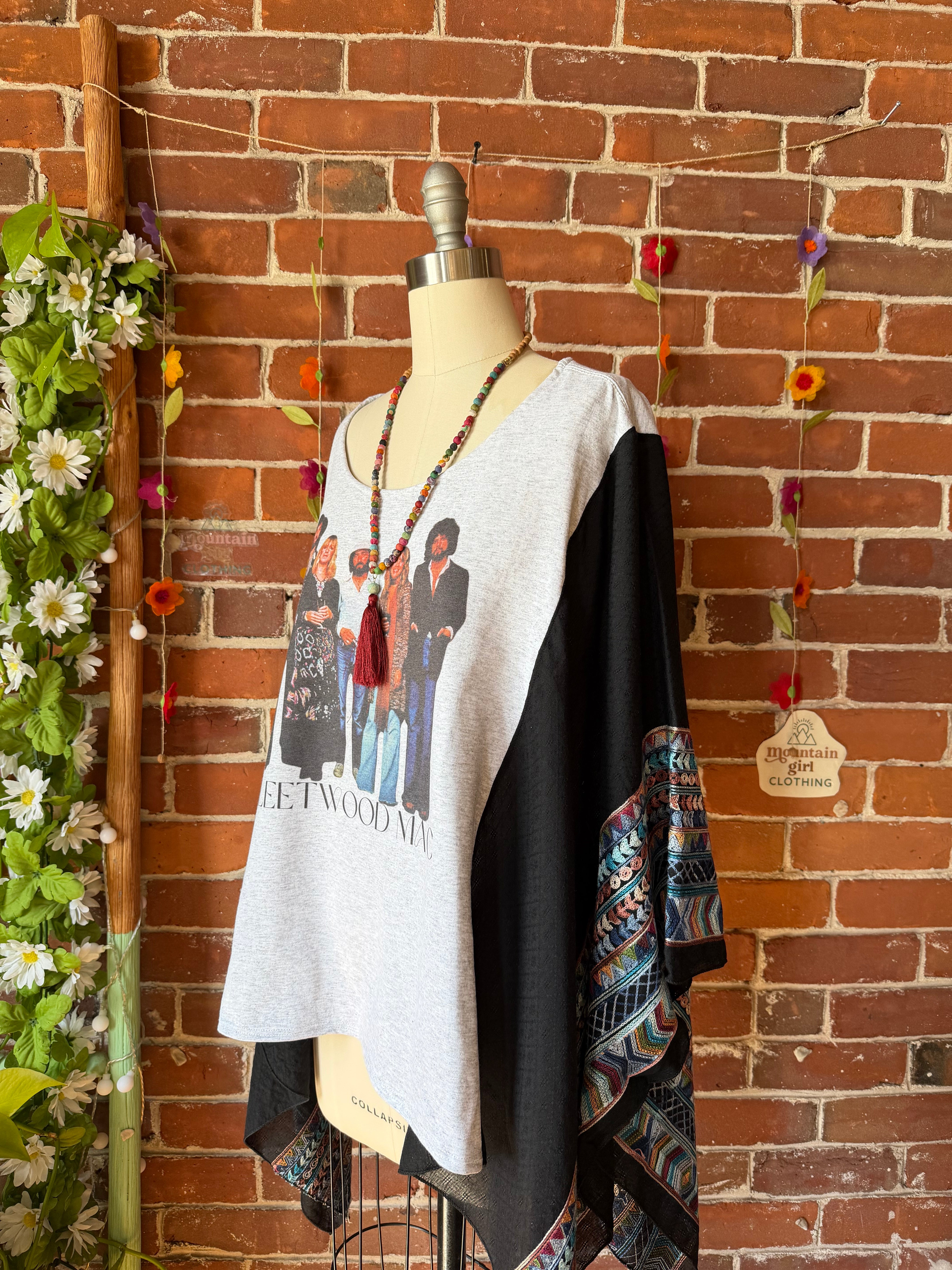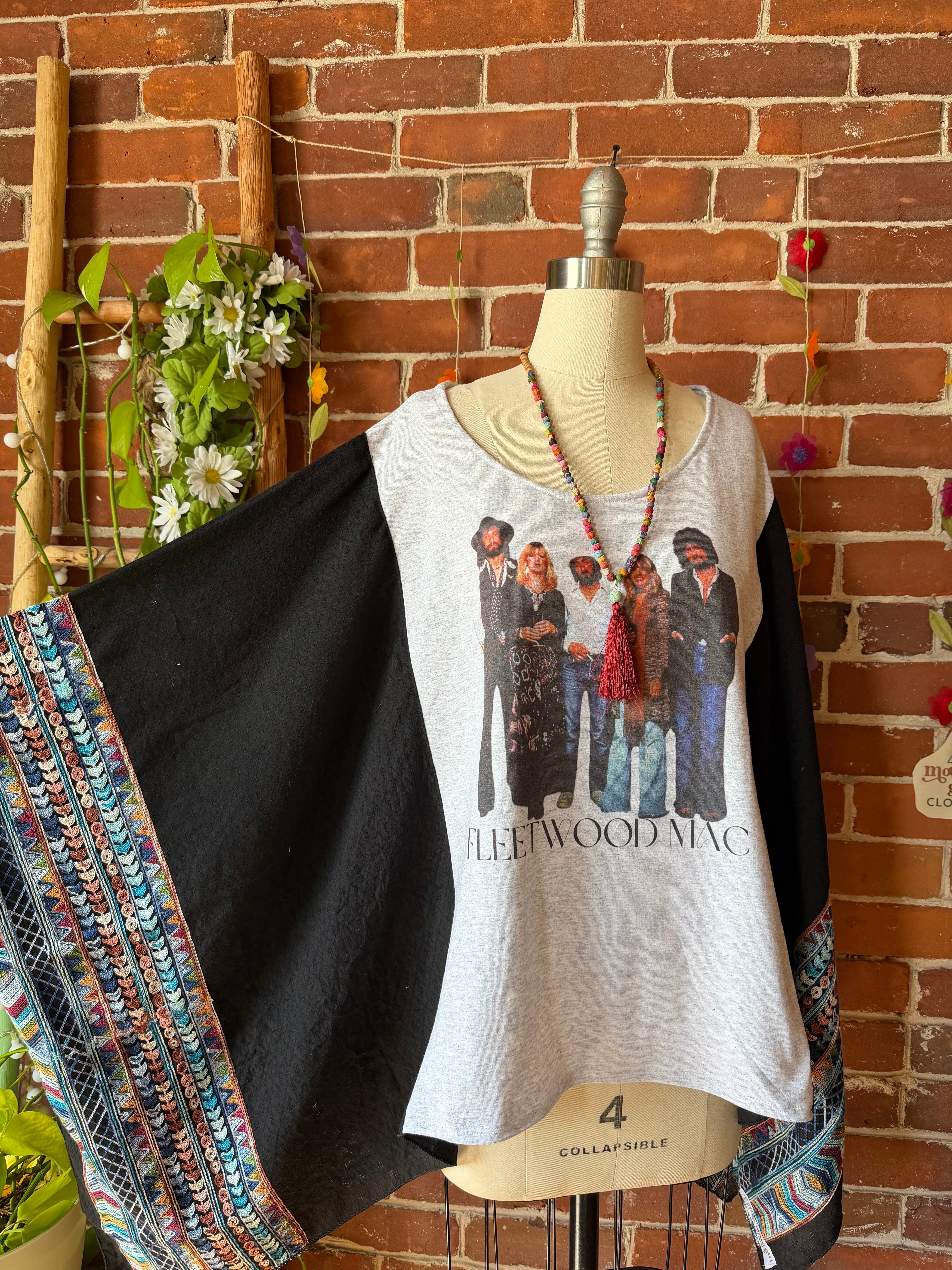 "Go Your Own Way" in this unique Fleetwood Mac embroidered poncho. Made from an upcycled Fleetwood tshirt and featuring soft, flowy poncho sleeves, this is a must-have for any die-hard Fleetwood Mac fan. Perfect for concerts or everyday wear.