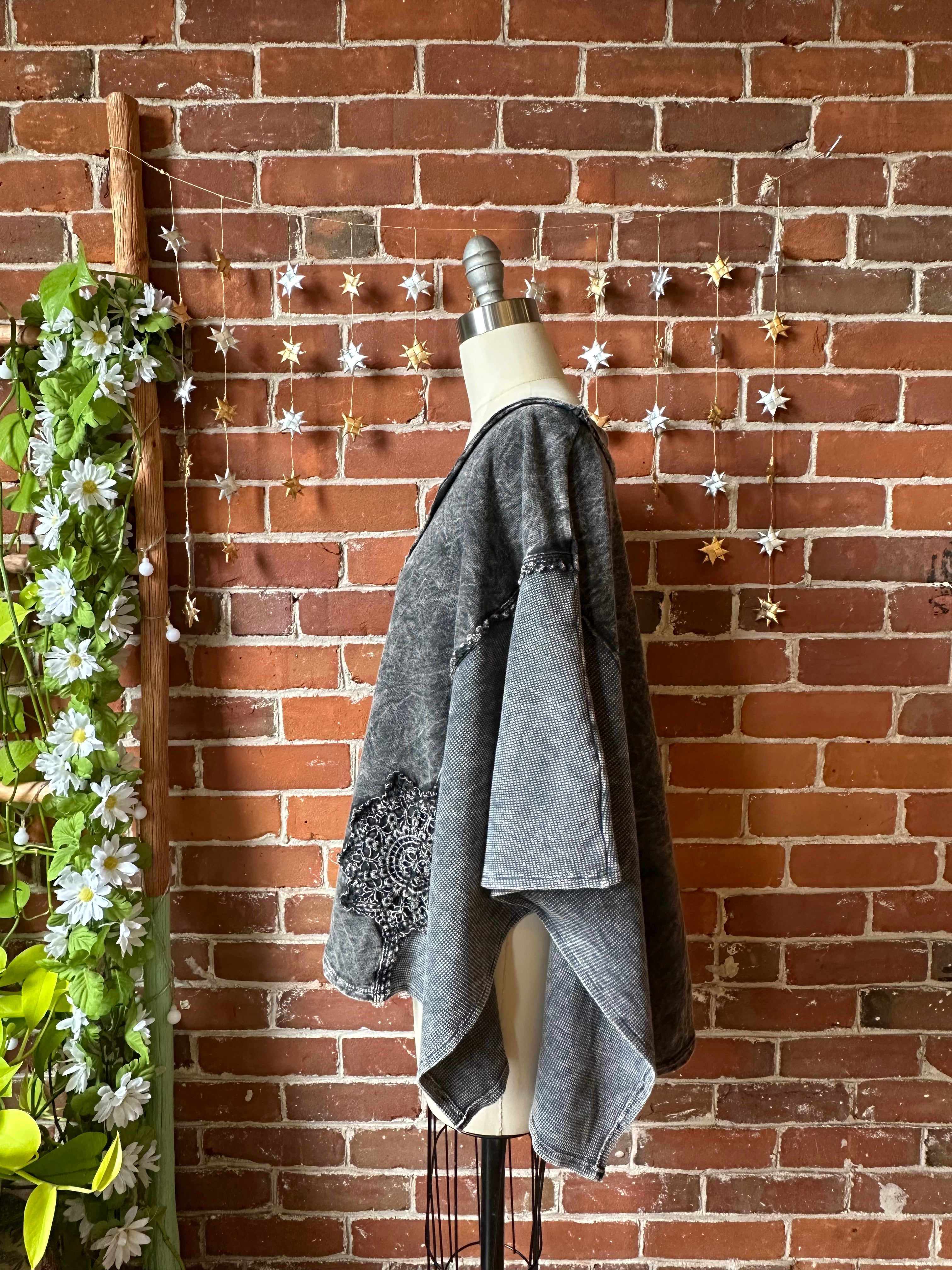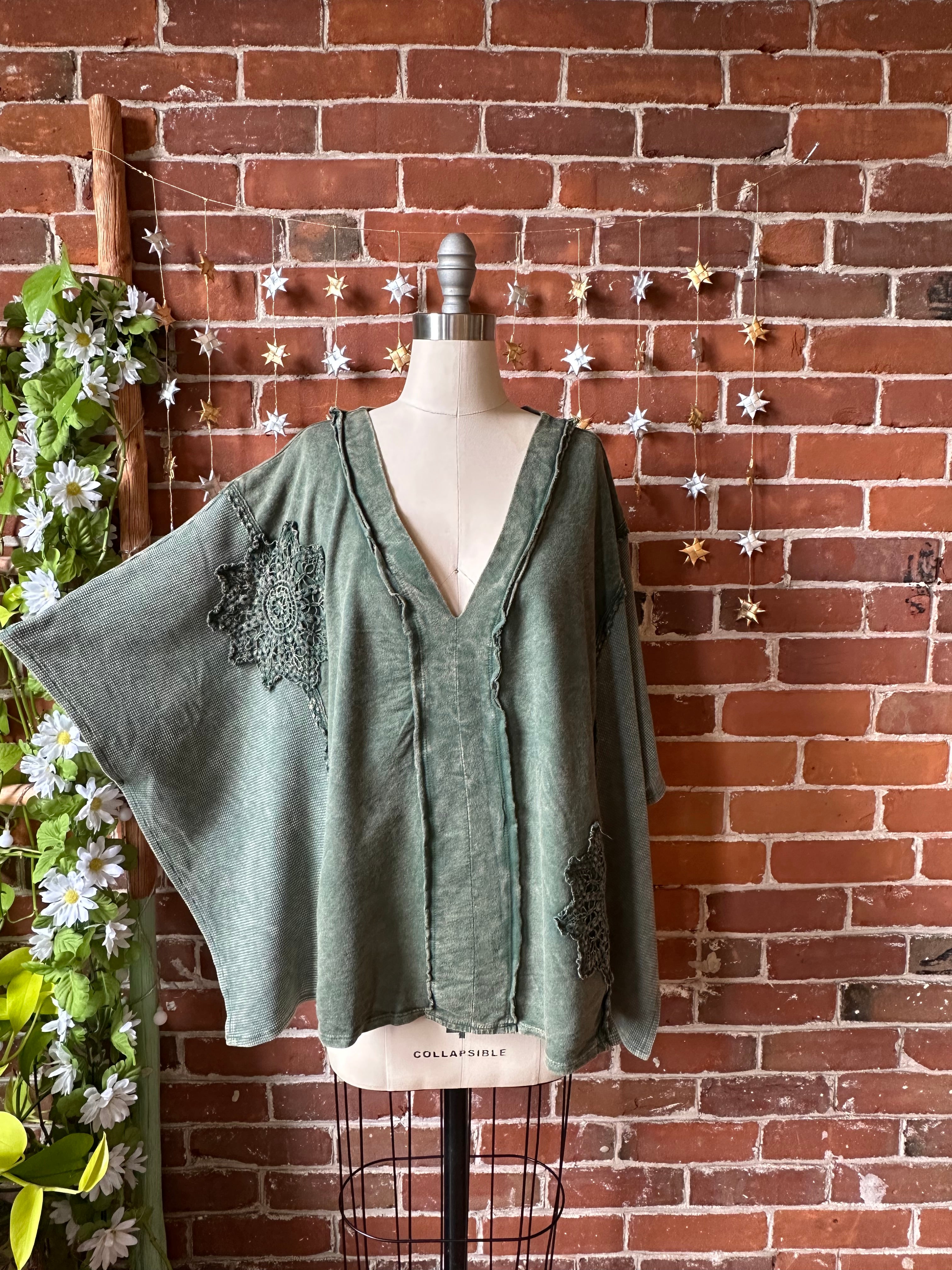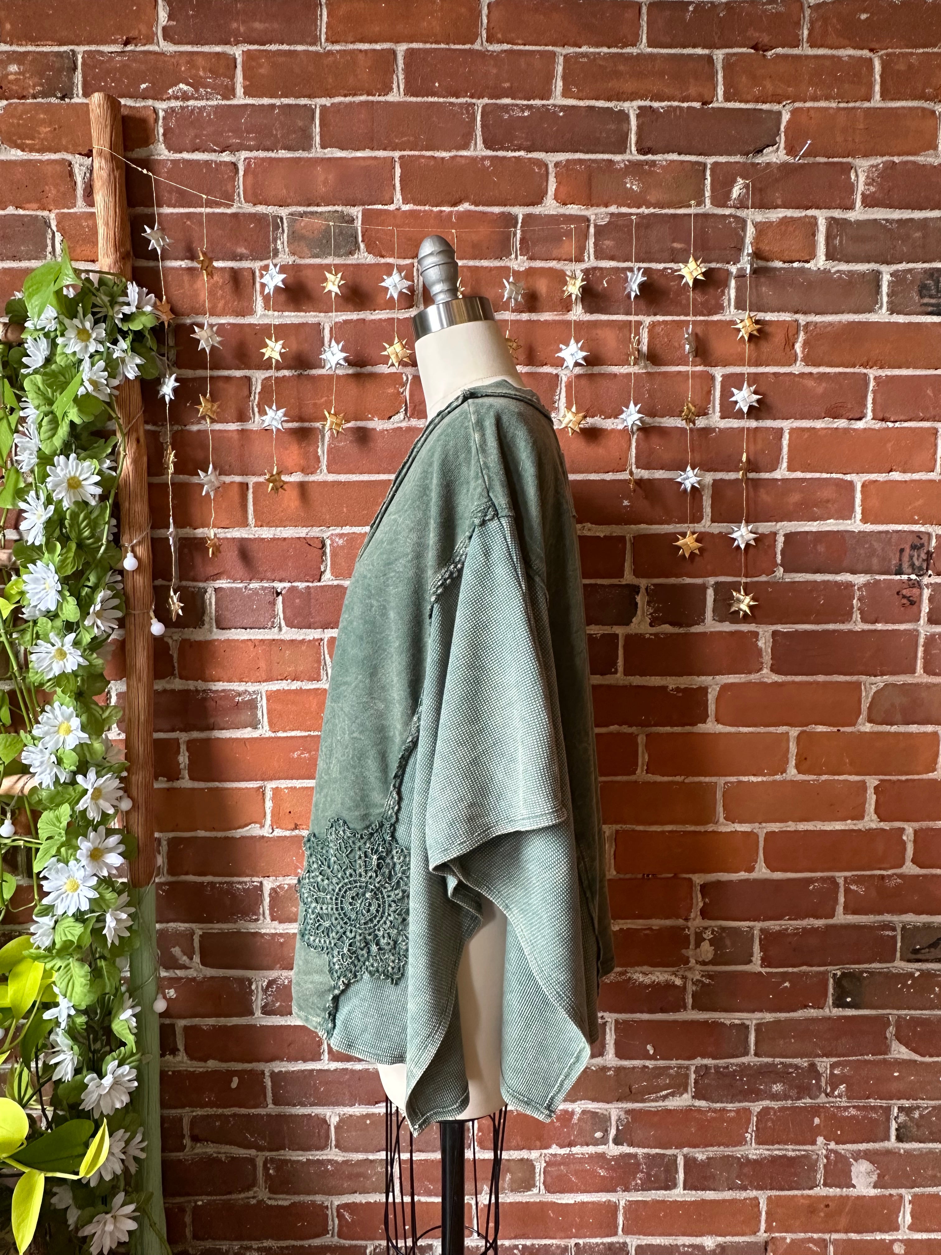 In Zen Mode Doily V-Neck Poncho Top - In Charcoal + Olive