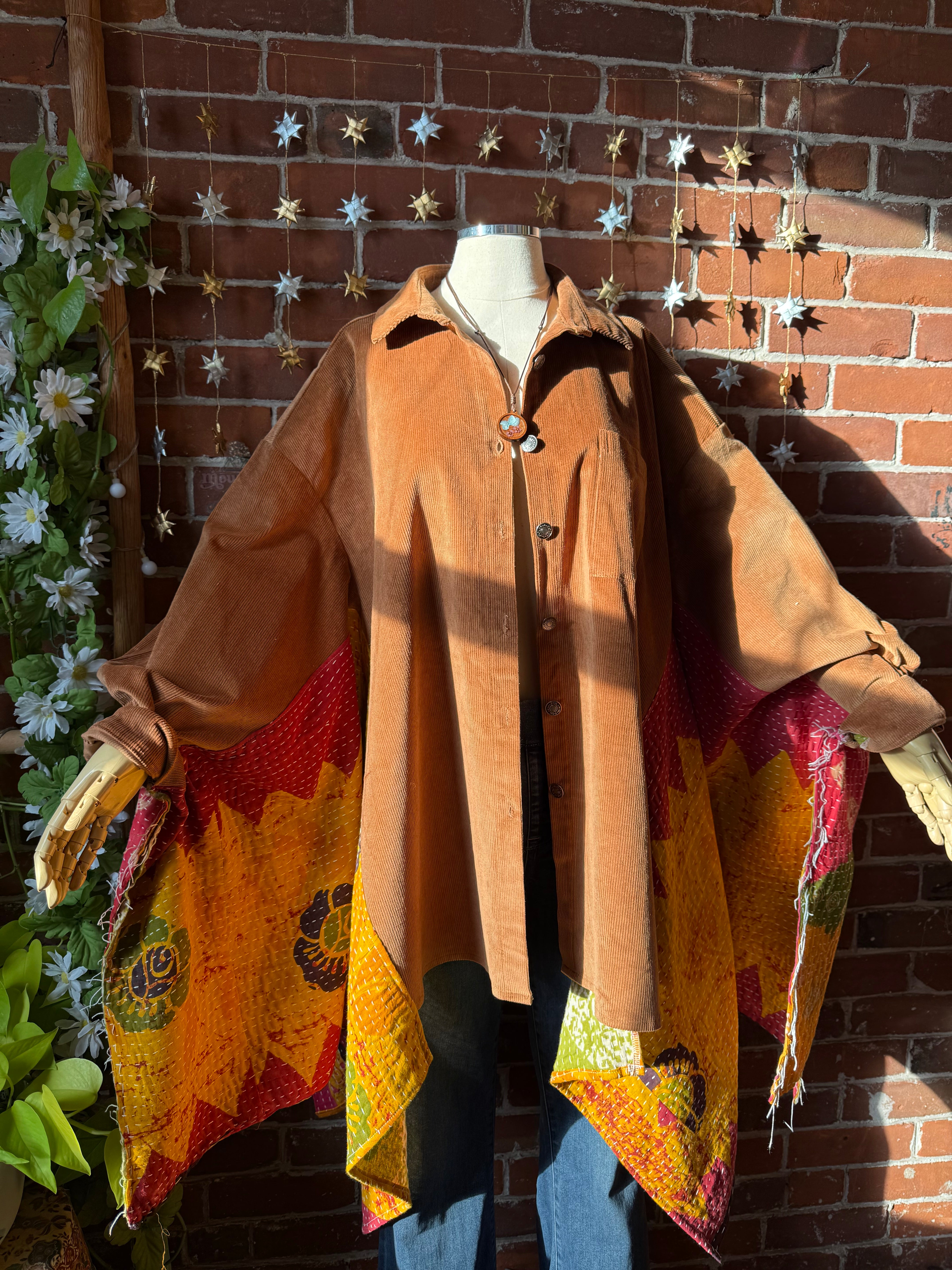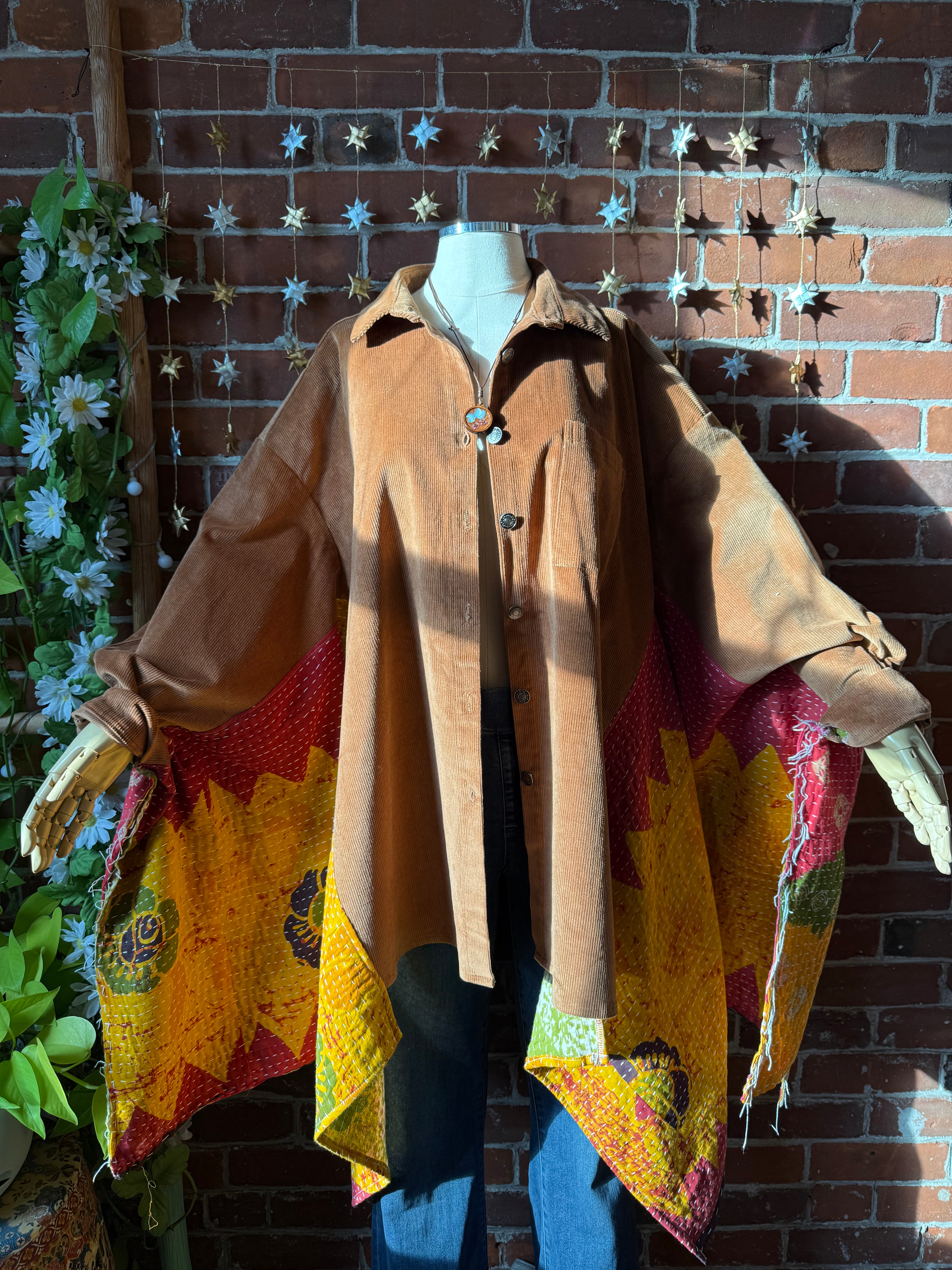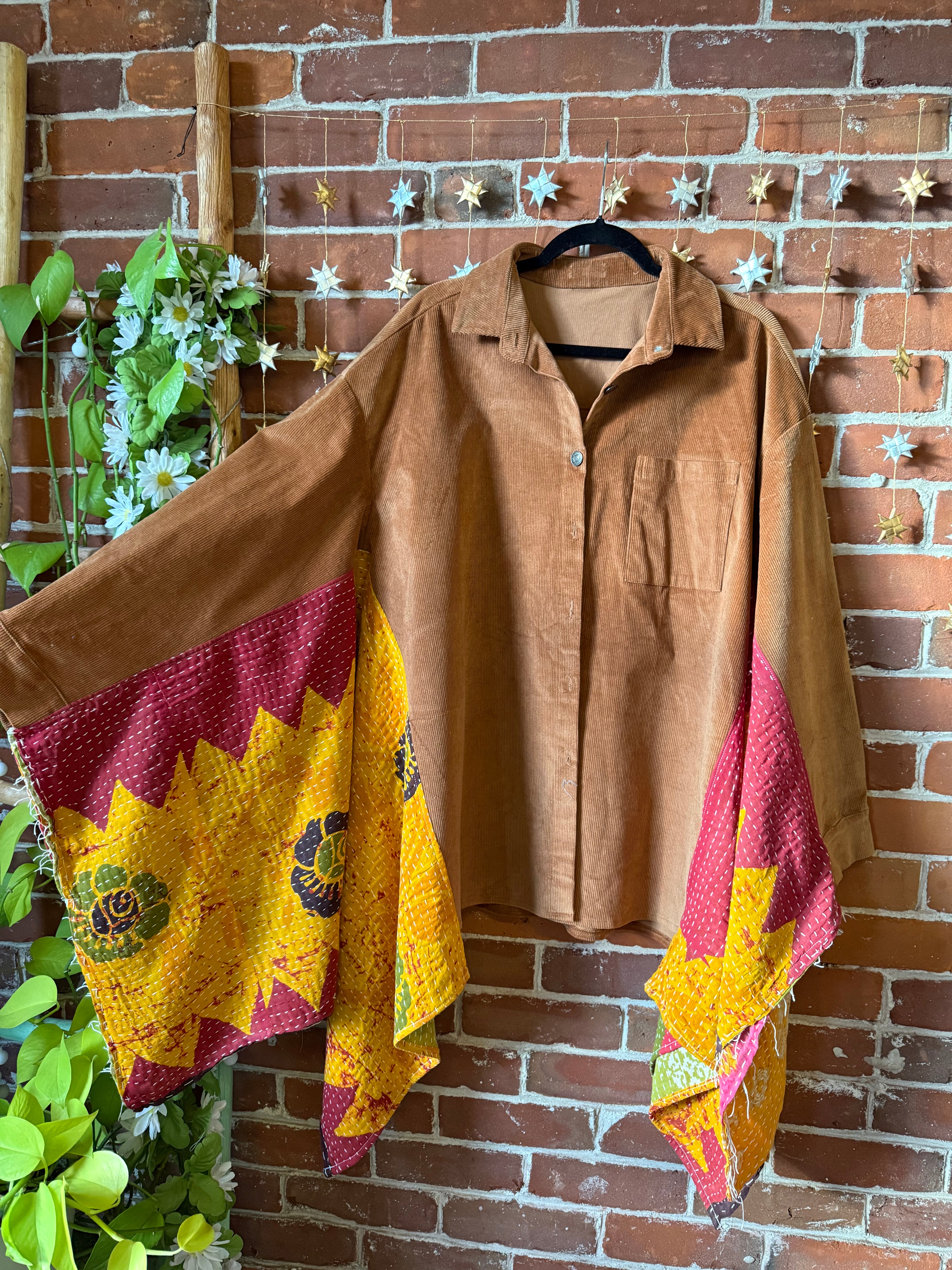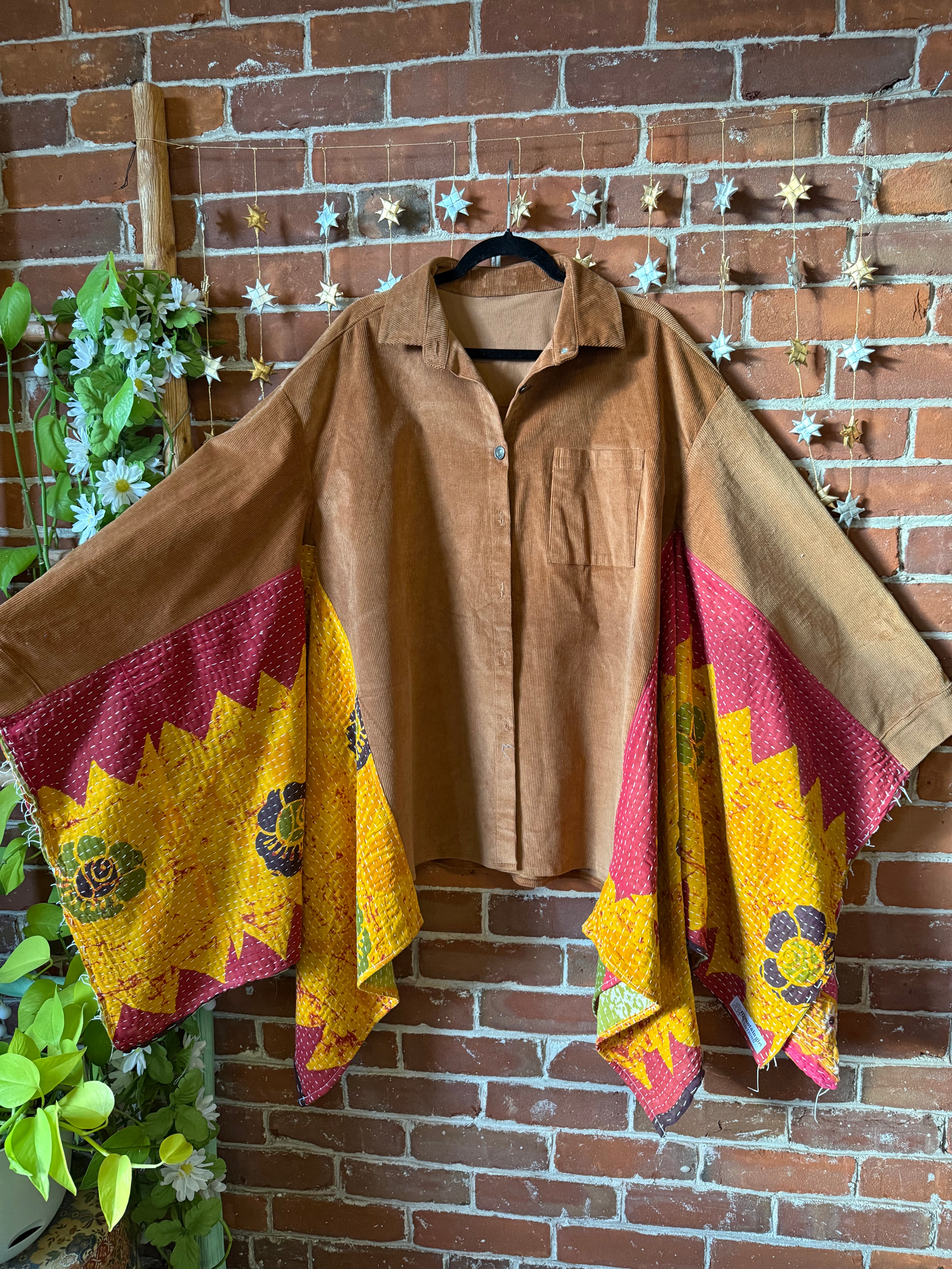 Upcycled corduroy jacket with gorgeous batwing style kantha sleeves and armholes at the ends.