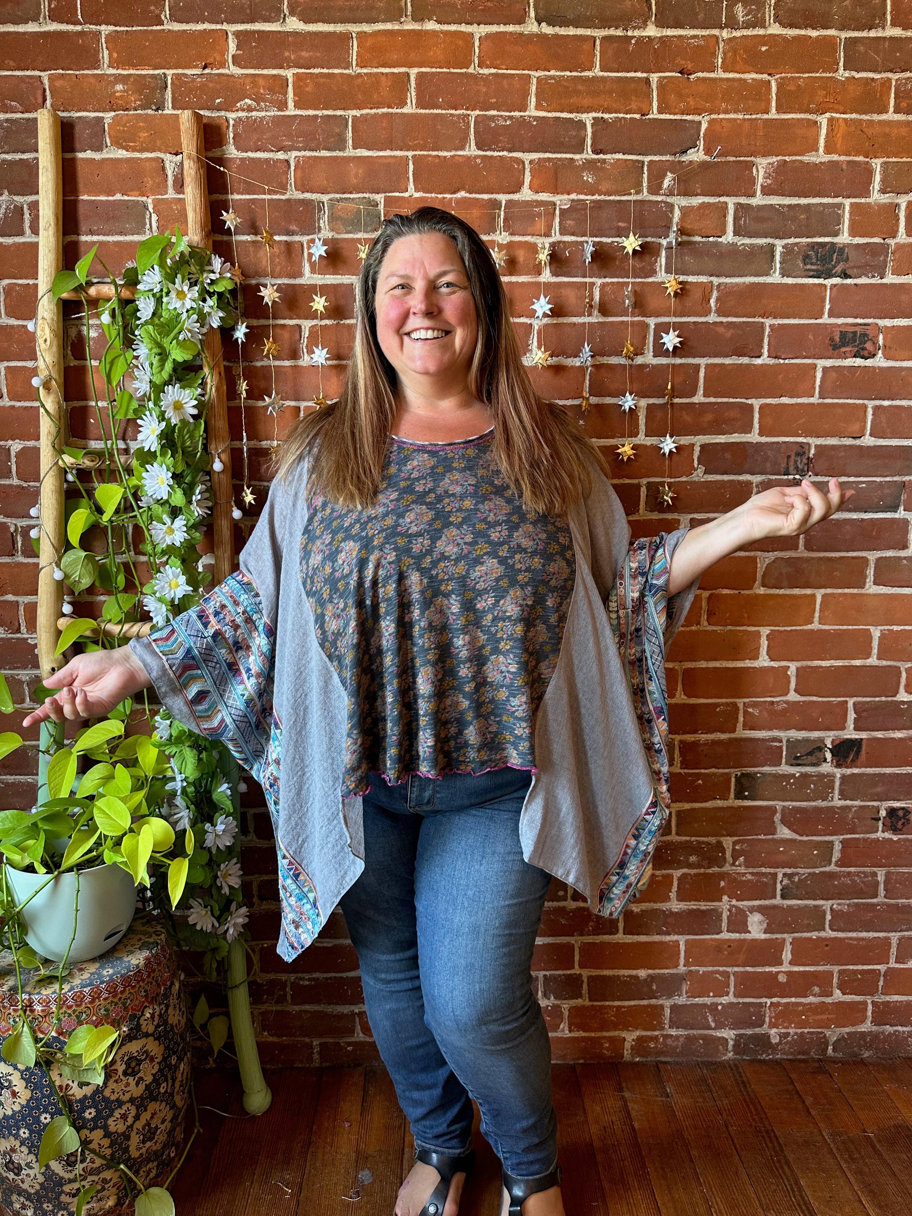 Upcycled top and flowy fabric on the sides, with armholes