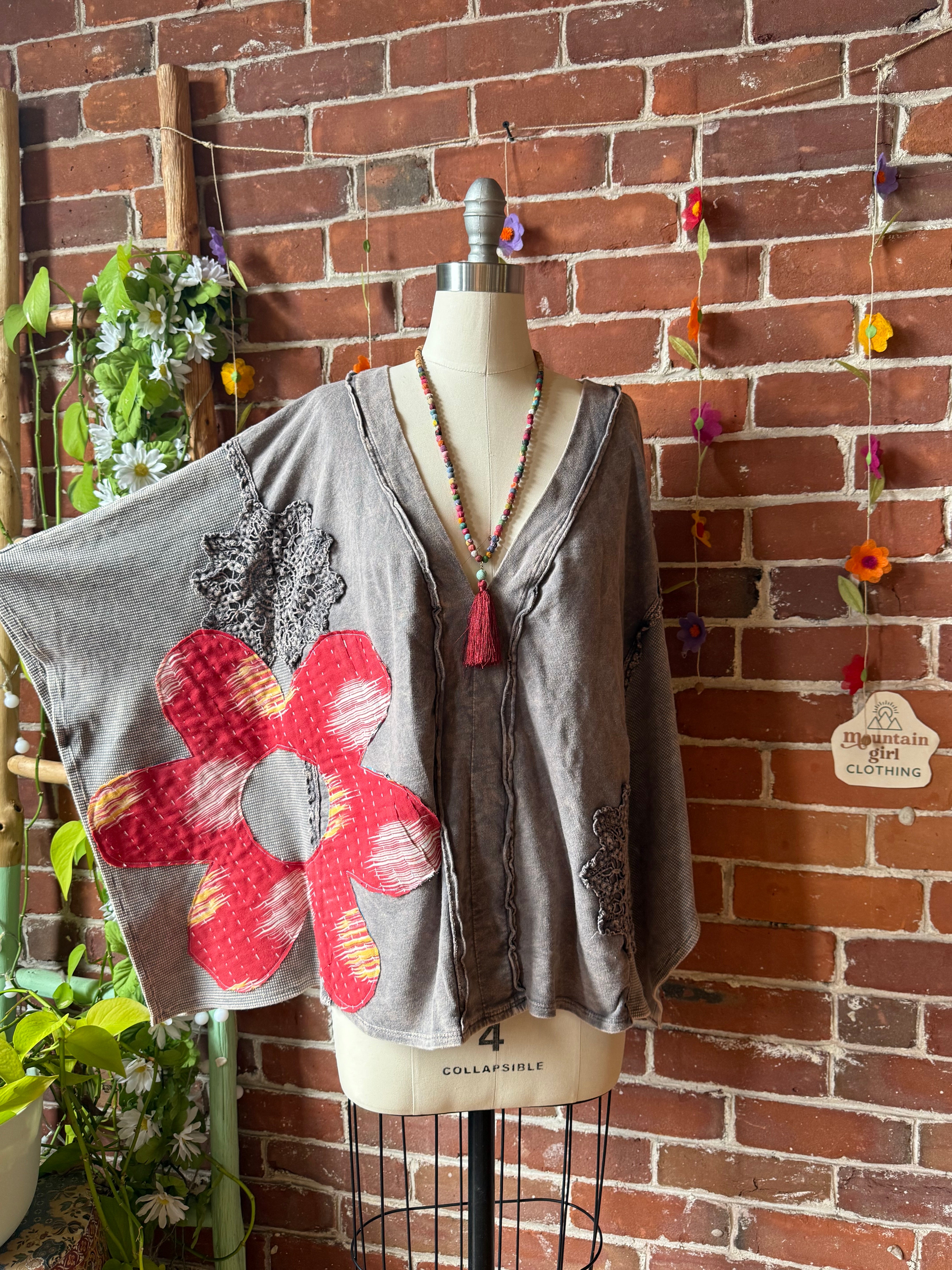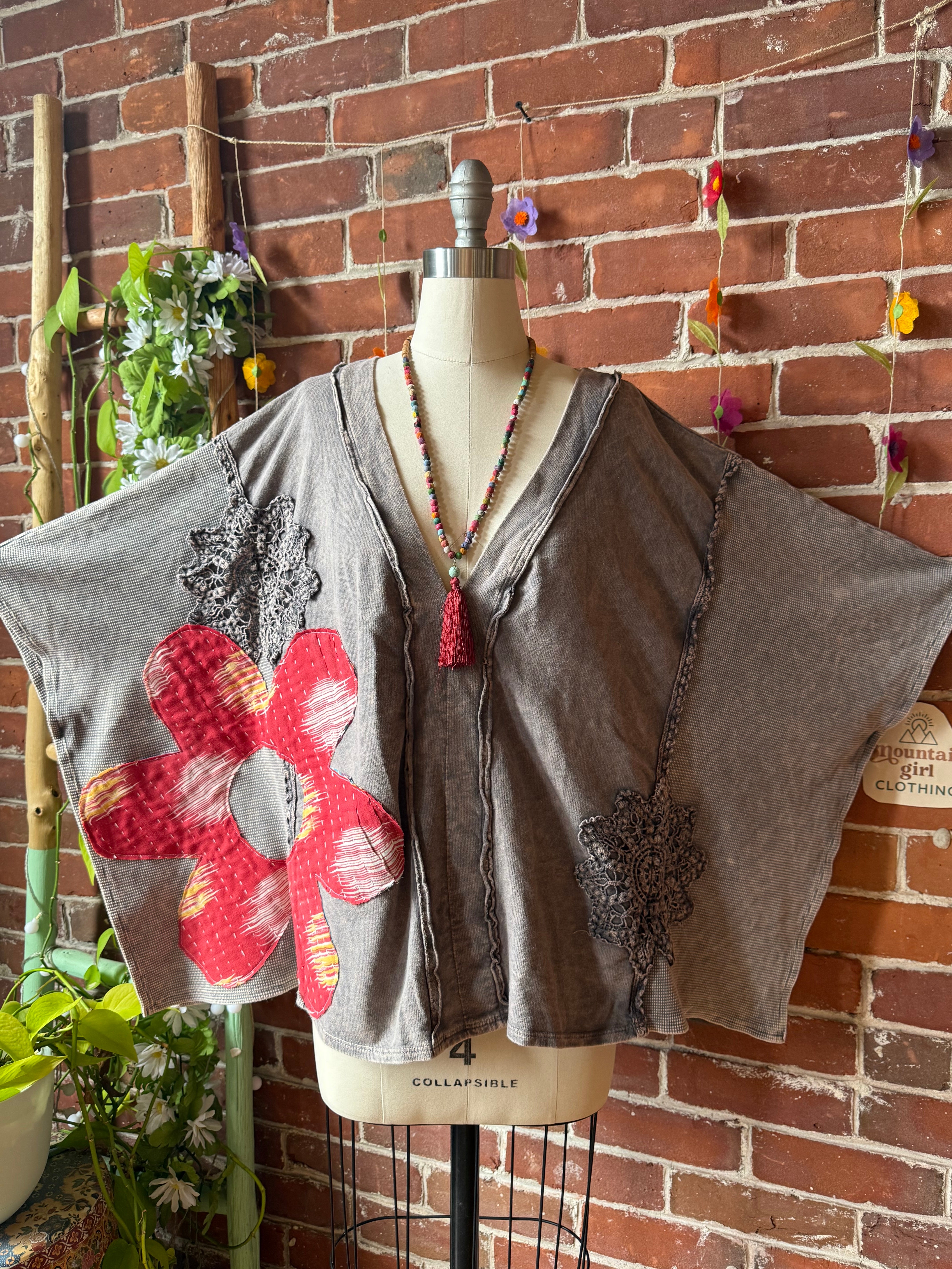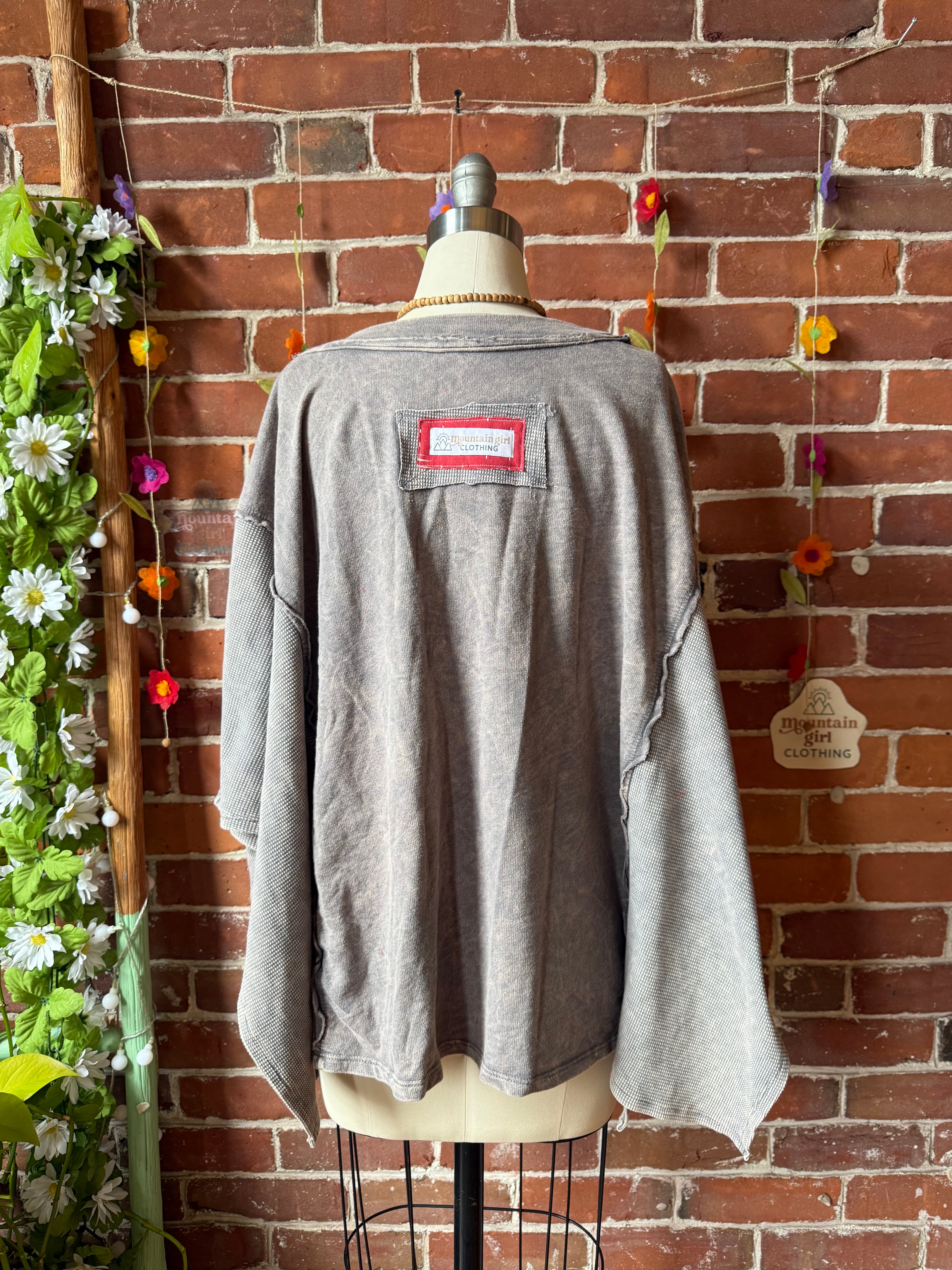 Upcycled flowy lightweight sweatshirt top and poncho sides with armholes.