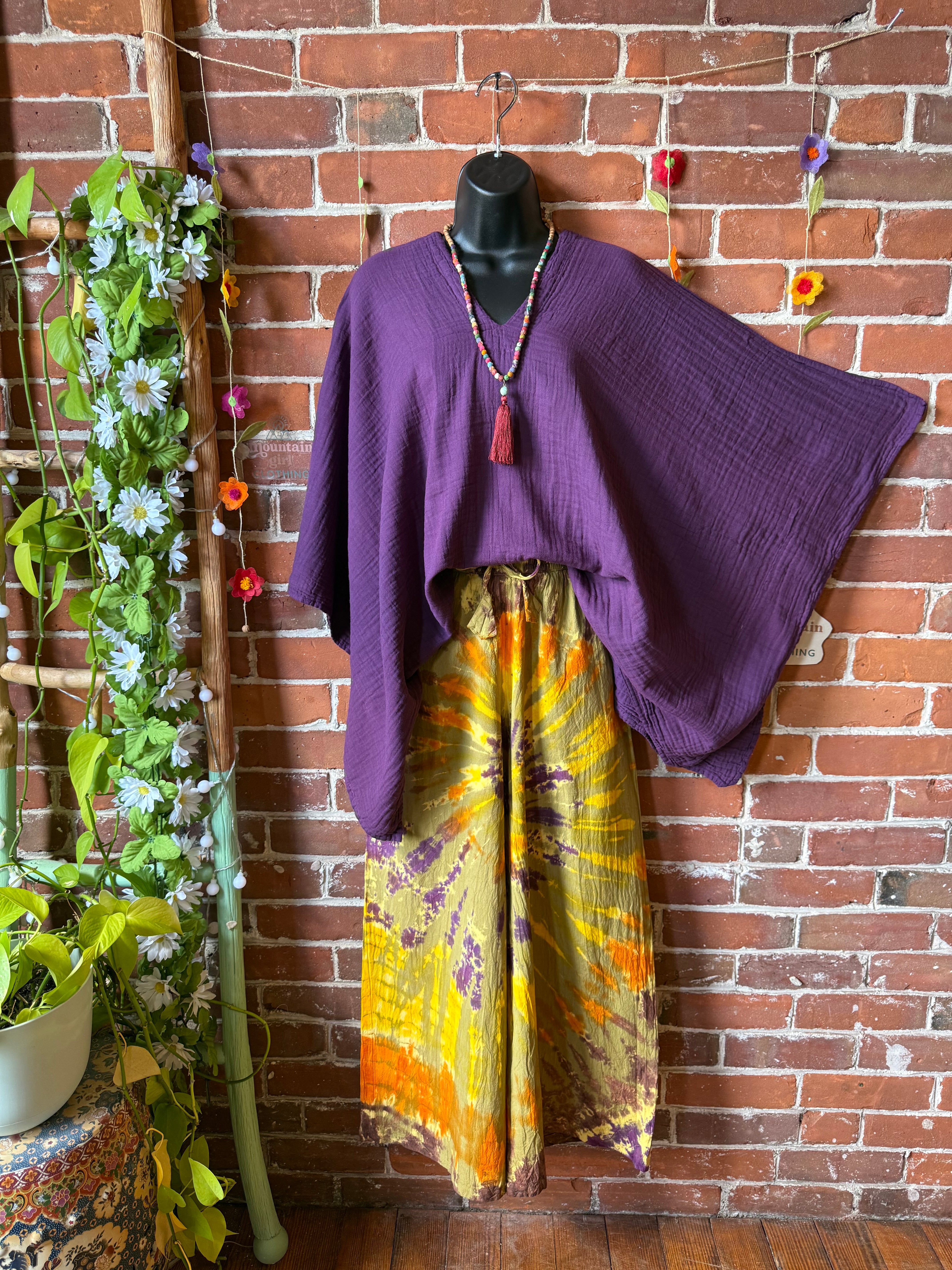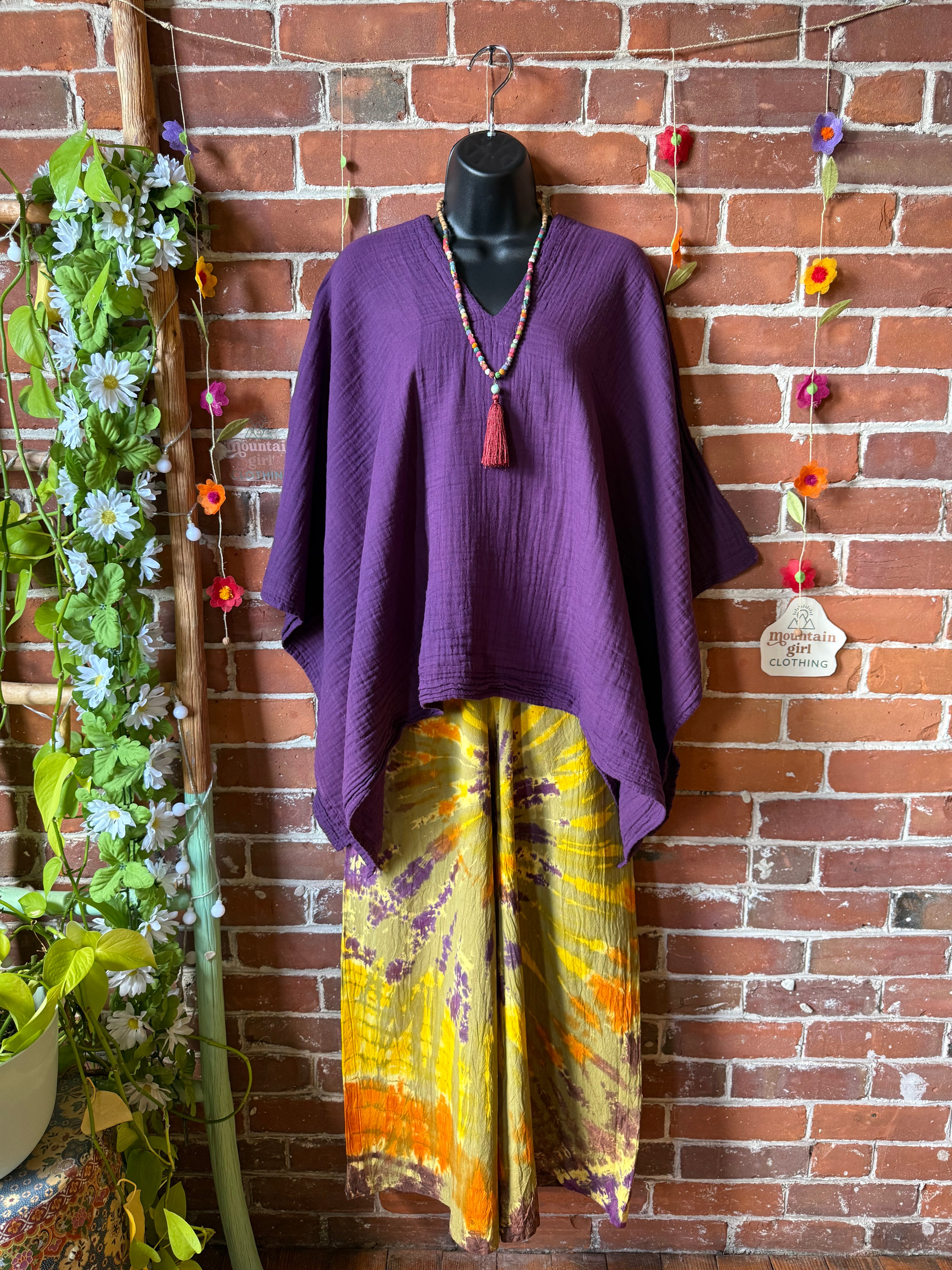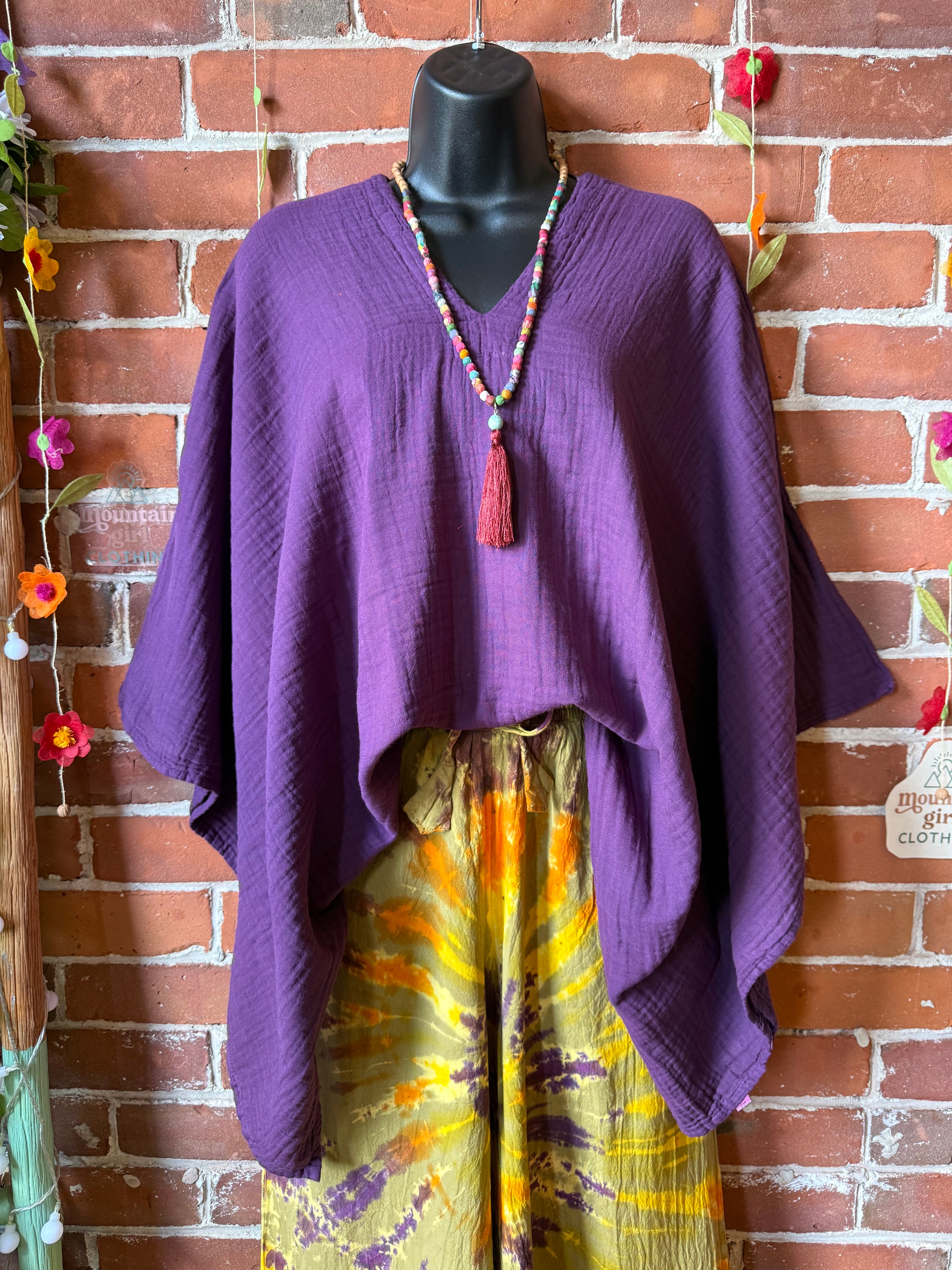 The rich amethyst hue adds a grounded yet vibrant touch, while the wide sleeves create that perfect airy, boho shape. Easy to layer over dresses, pair with flowy pants, or wear on its own for an effortlessly styled look.