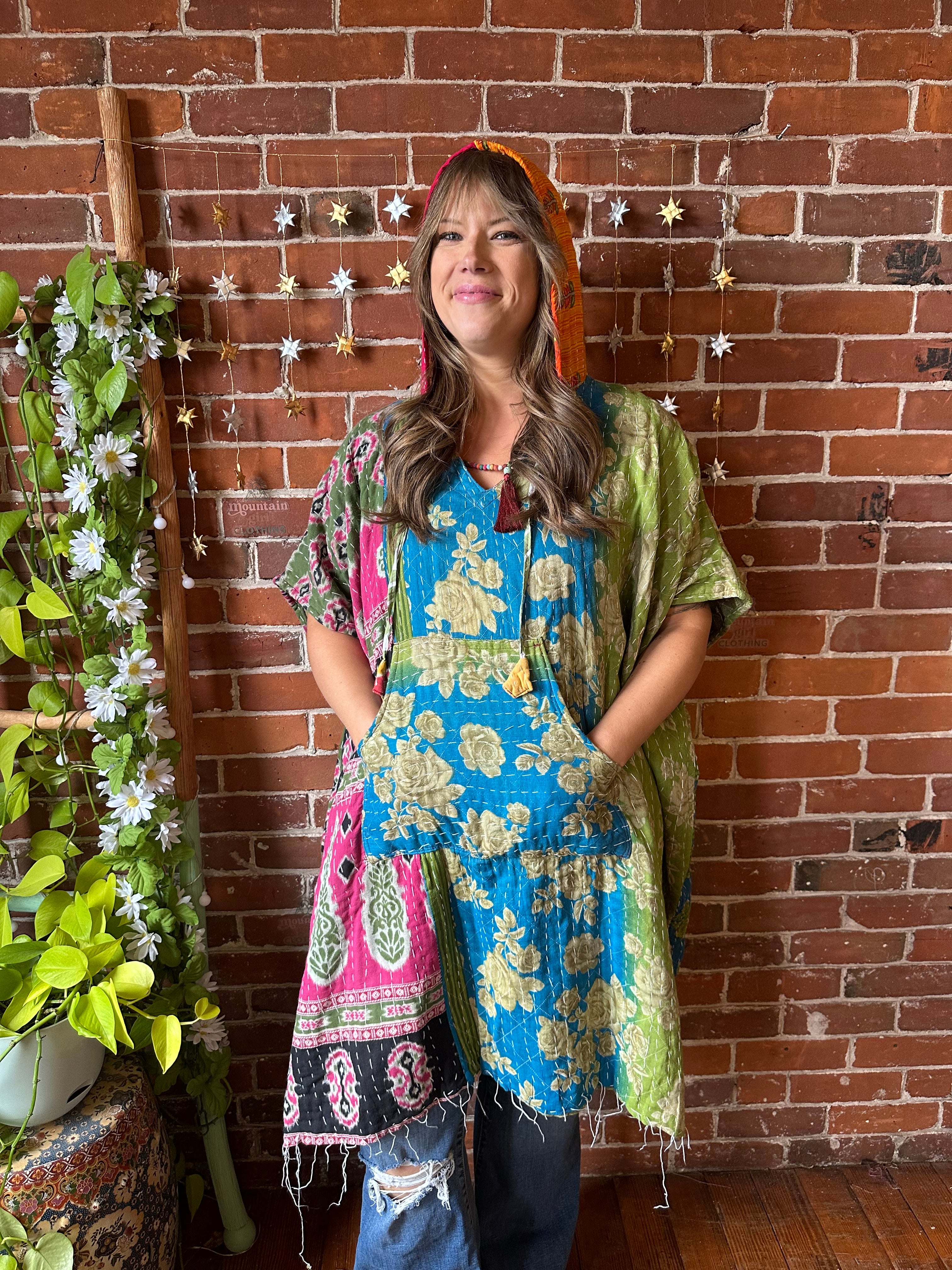 Wrap yourself in vibrant, free-spirited charm with this one-of-a-kind boho kantha poncho Hoodie. Crafted from upcycled Kantha fabric, each piece tells its own story through a stunning mix of hand-stitched patterns, bold colors, and intricate textures. The relaxed, flowy silhouette and V-neckline make it perfect for layering over jeans, leggings, or palazzo pants. Front pocket.