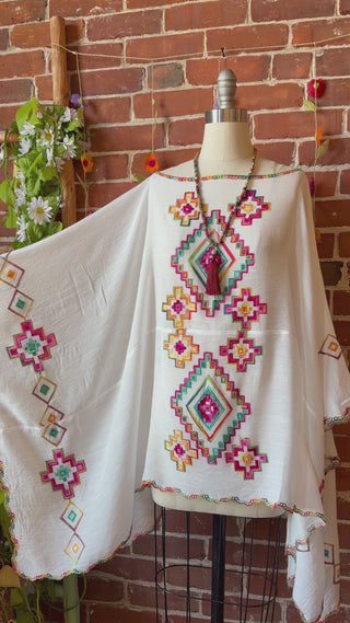Crafted from a soft, breathable cream fabric, this flowy poncho features vibrant floral embroidery in joyful shades of pink, marigold, teal, and leafy green. Intricate embroidery cascade down the back, framed by delicate vine detailing and scalloped stitching along the edges for that perfectly finished touch.