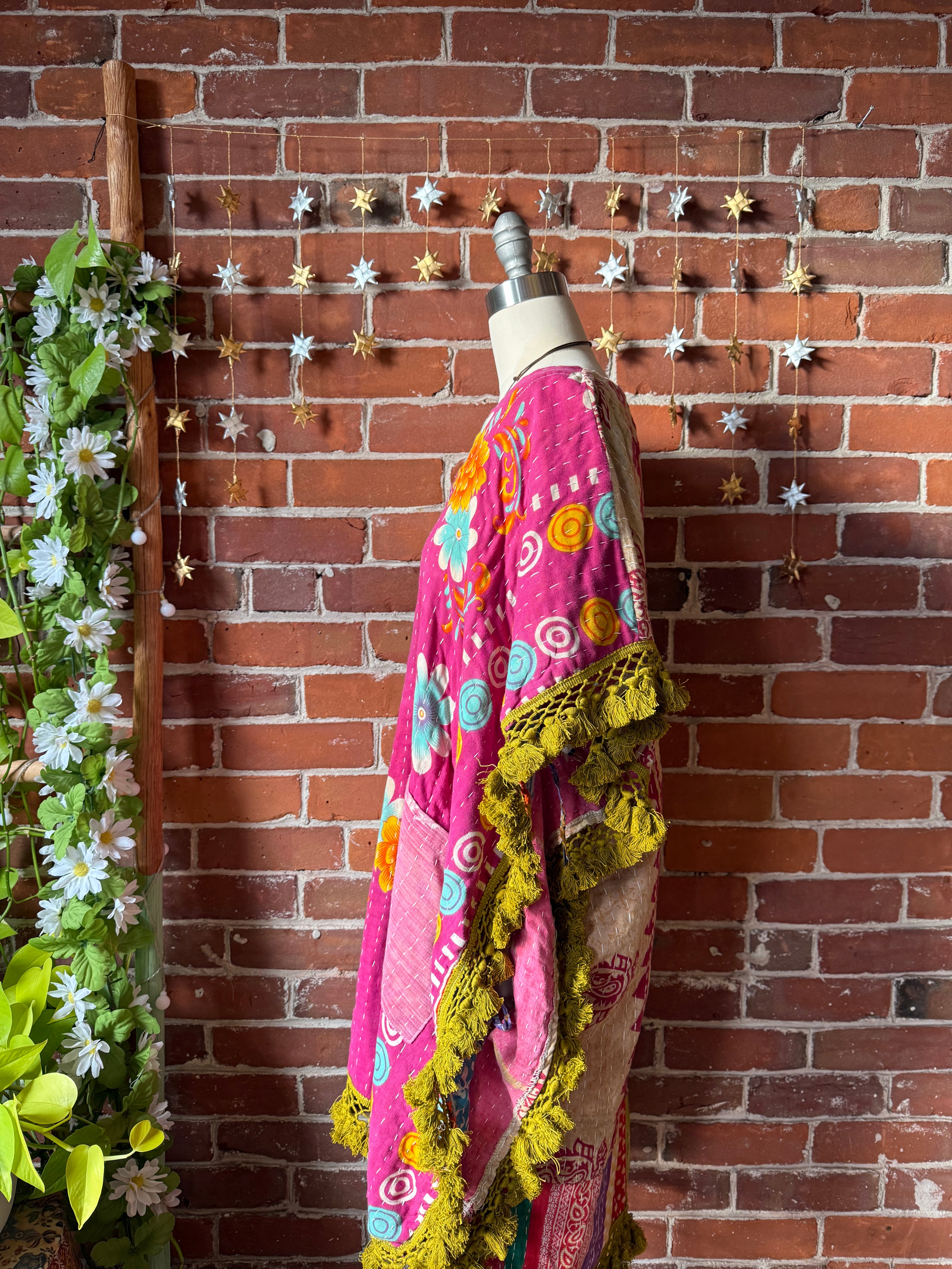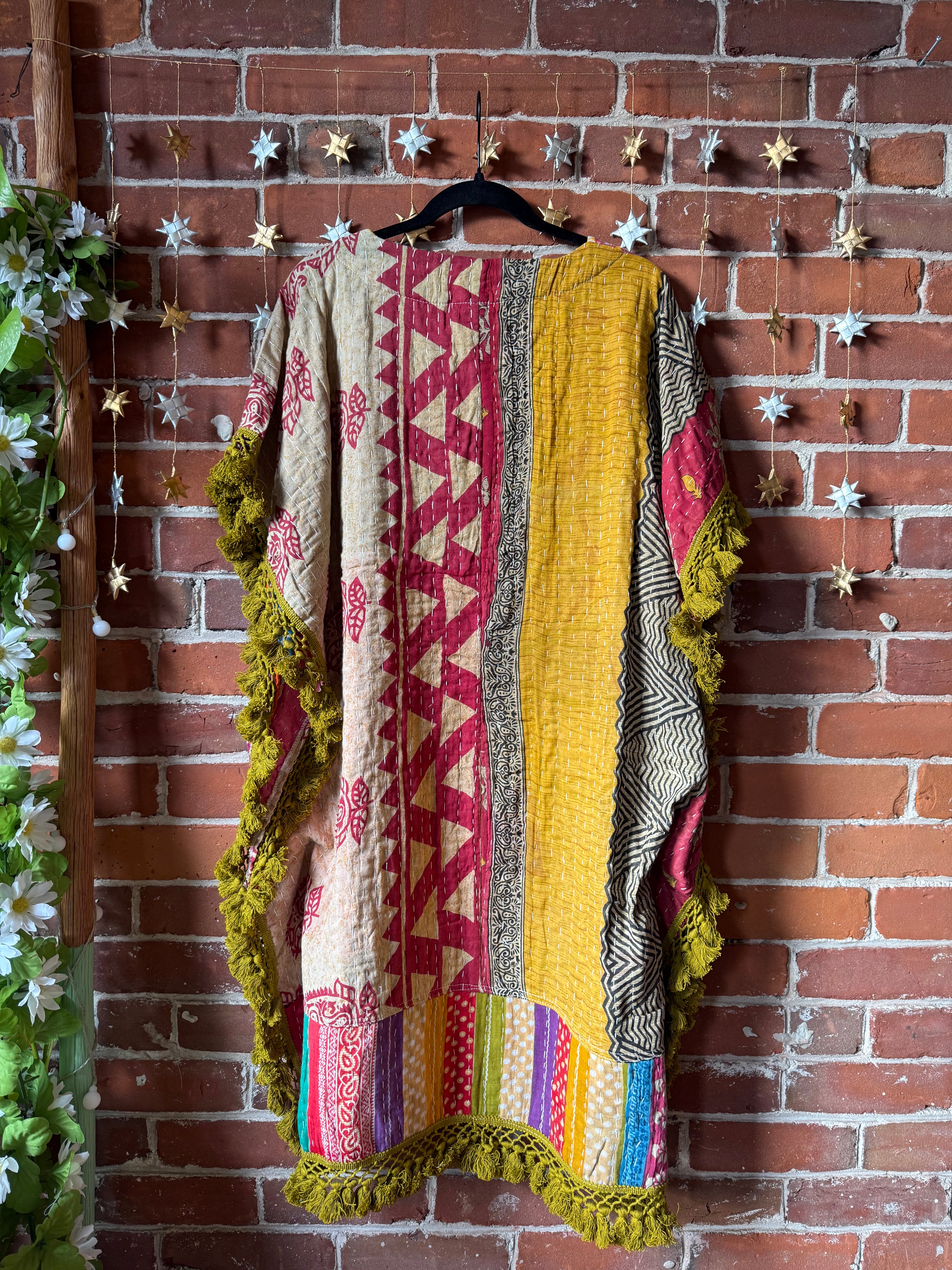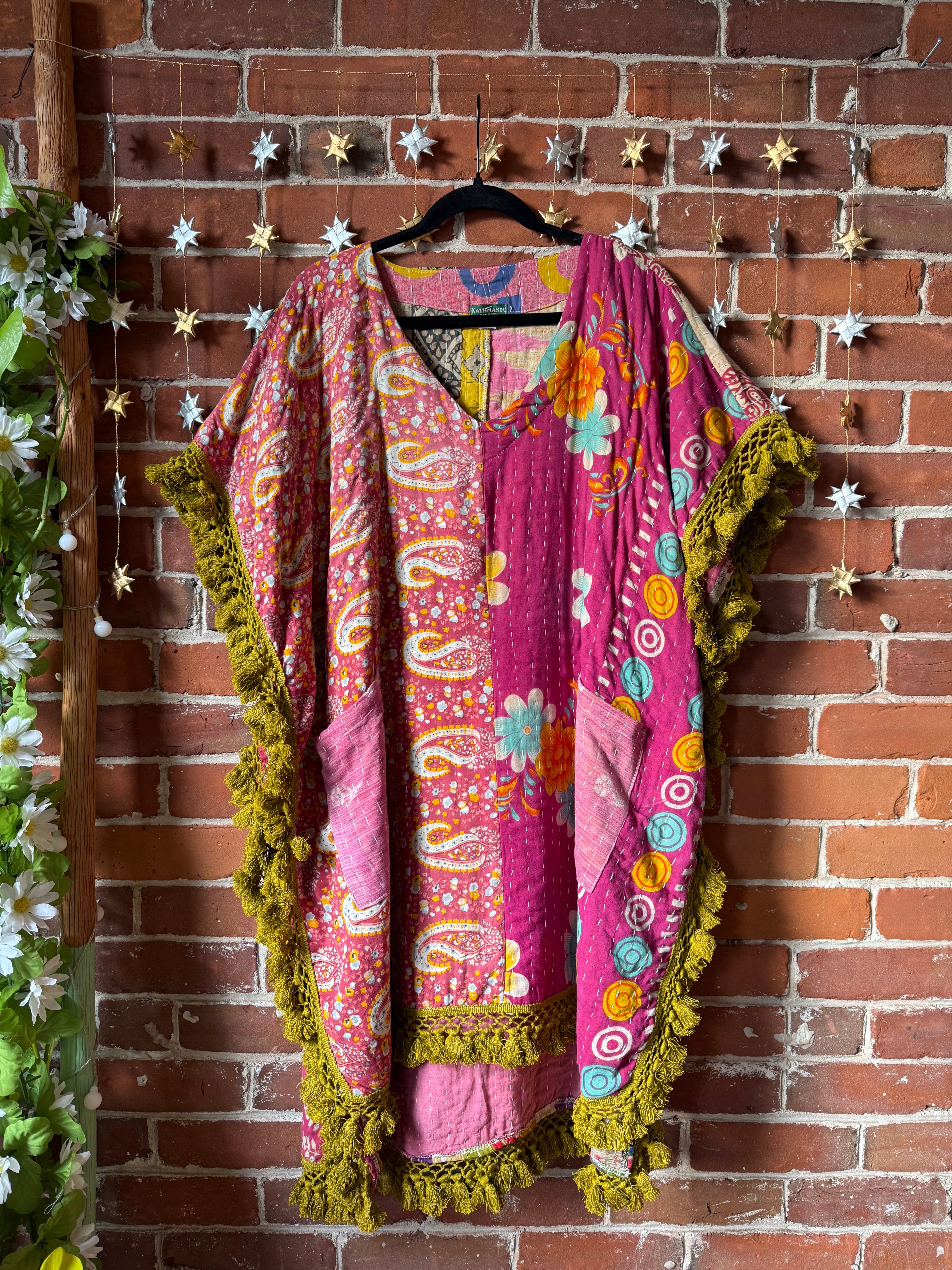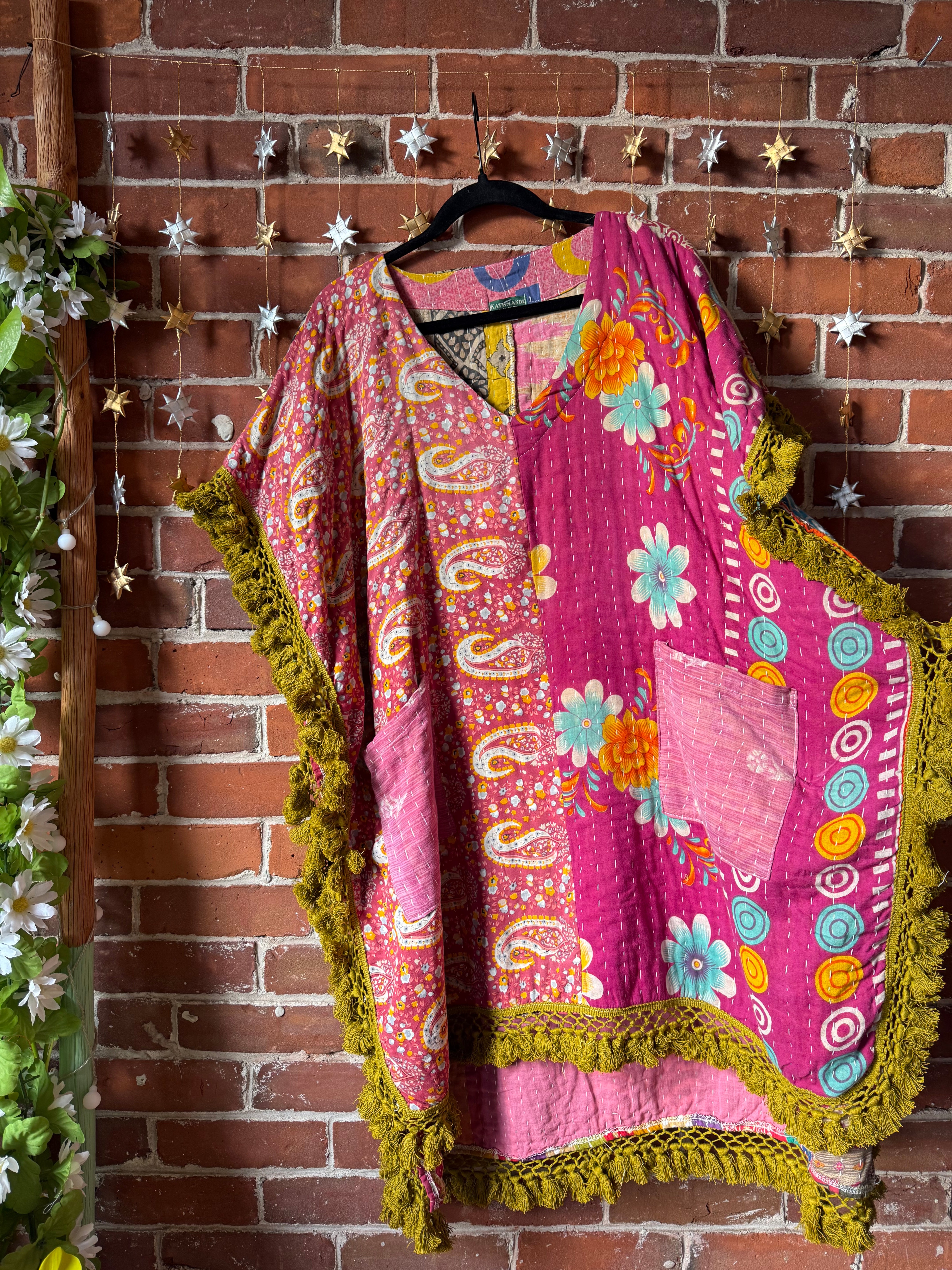 Wrap yourself in vibrant, free-spirited charm with this one-of-a-kind boho kantha poncho top. Crafted from upcycled Kantha fabric, each piece tells its own story through a stunning mix of hand-stitched patterns, bold colors, and intricate textures. The relaxed, flowy silhouette and V-neckline make it perfect for layering over jeans, leggings, or palazzo pants. Finished with playful fringe trim for that extra touch of bohemian flair.