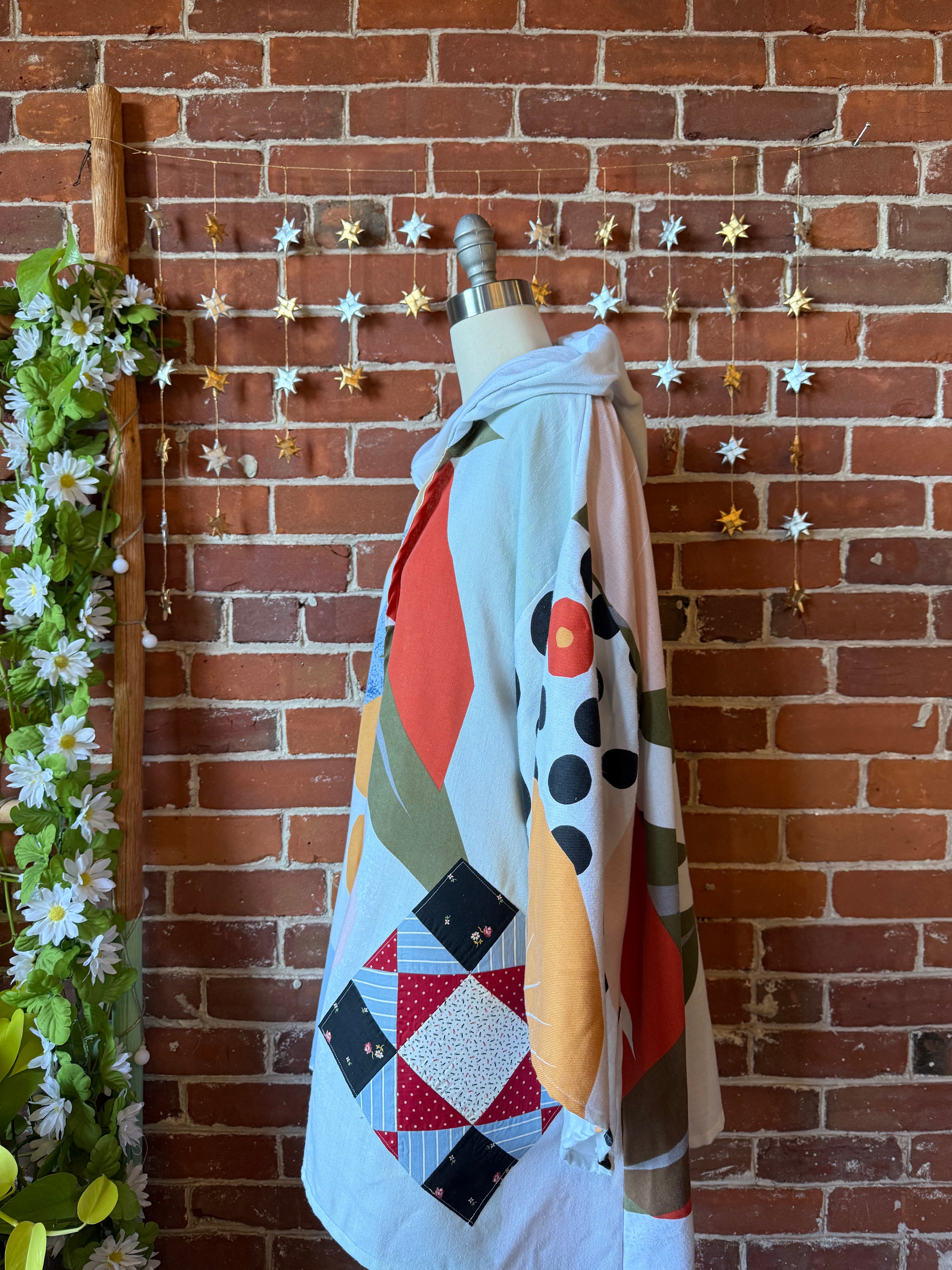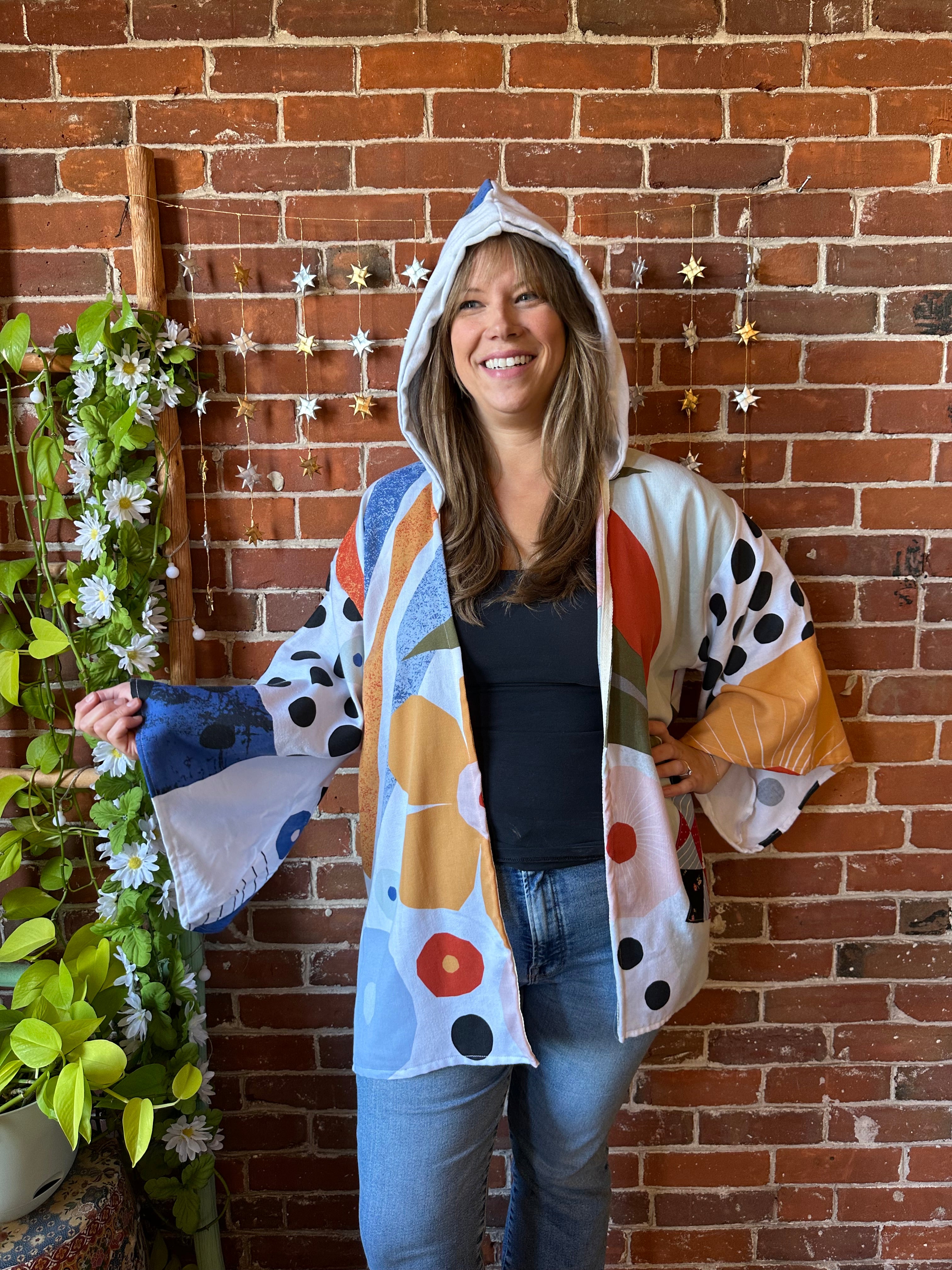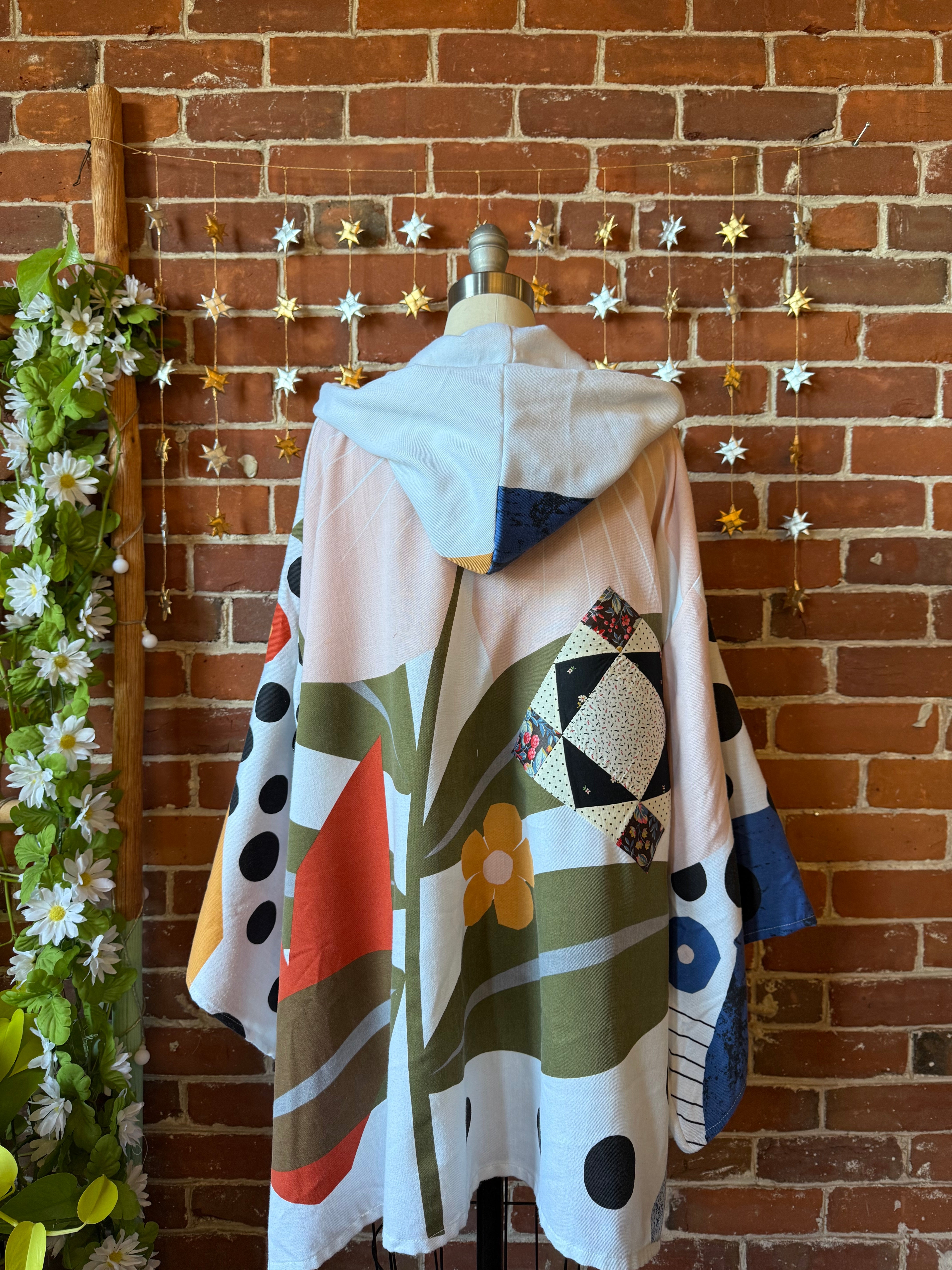Soft woven fabric and patchwork detail kimono/robe with bell sleeves and hood