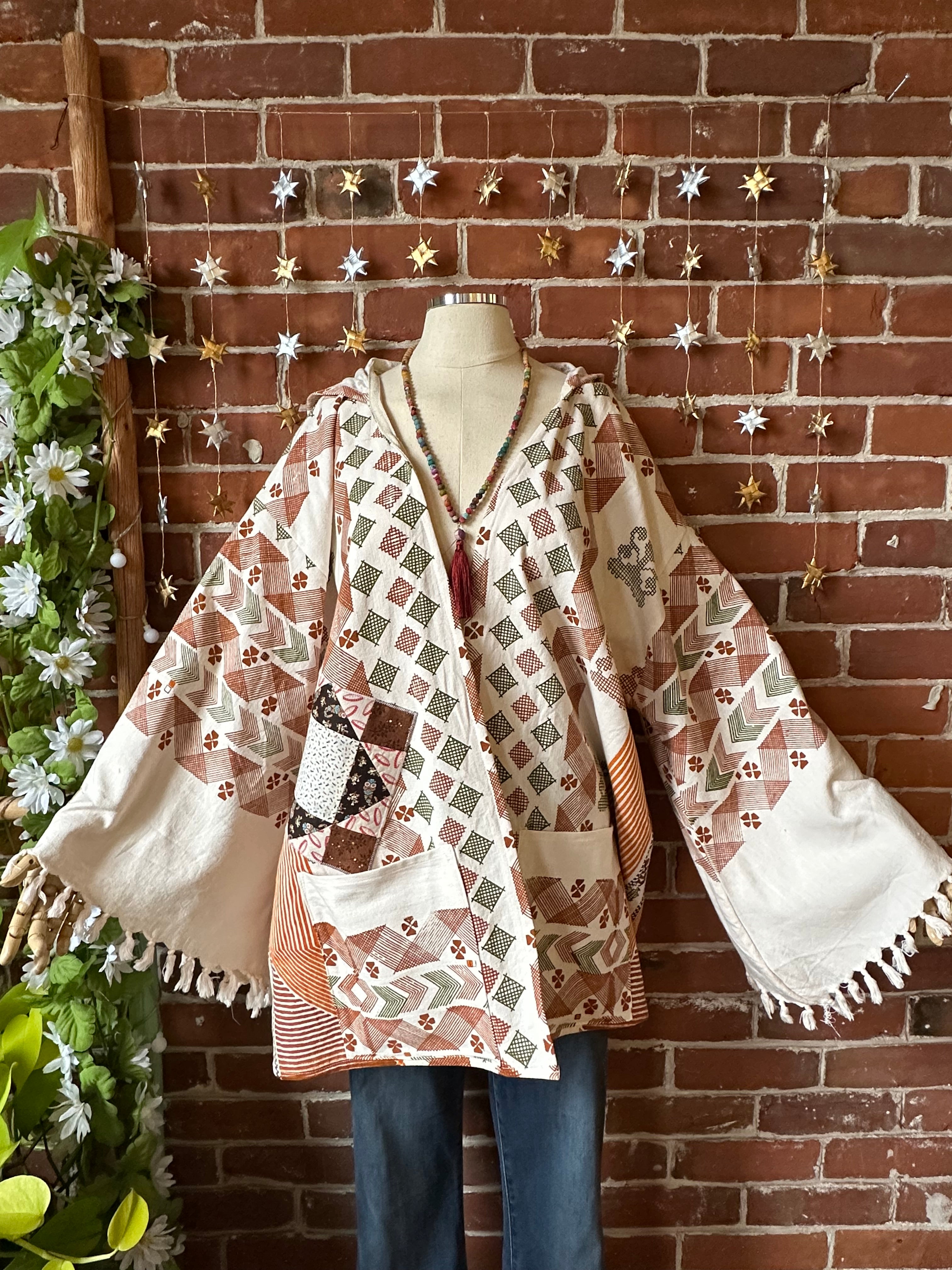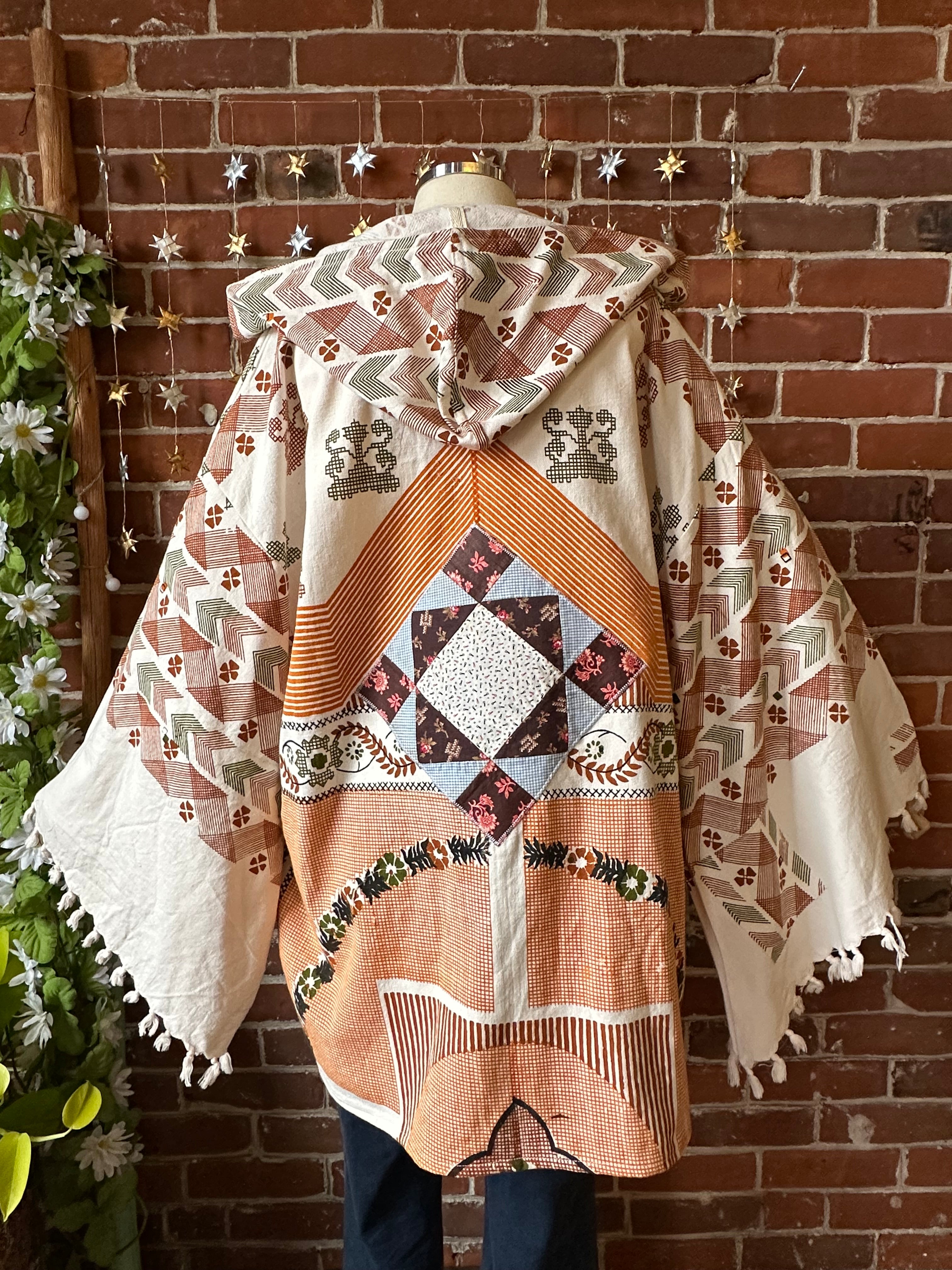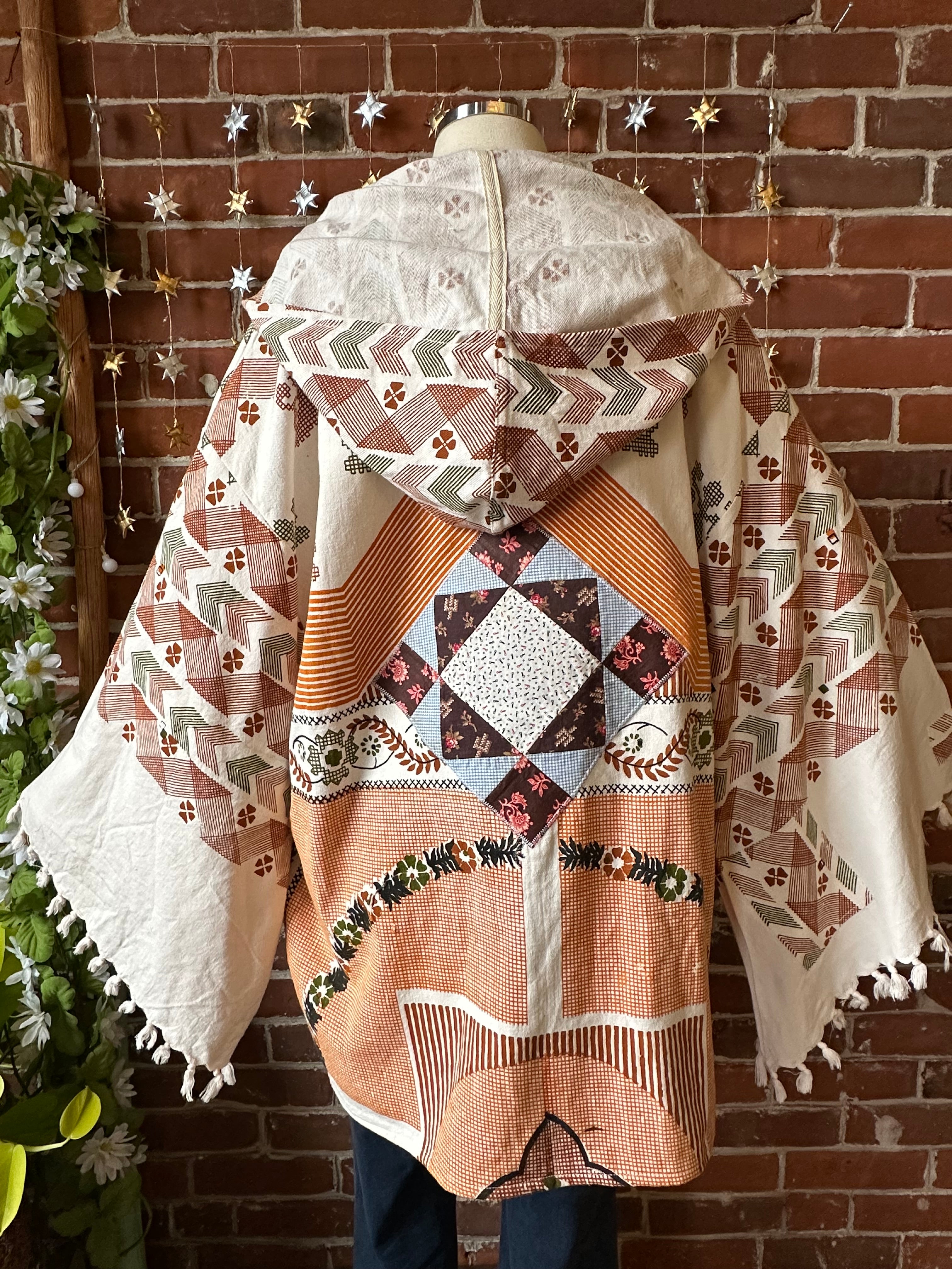 tapestry cotton and patchwork kimono/robe with pockets, bell sleeves and hood