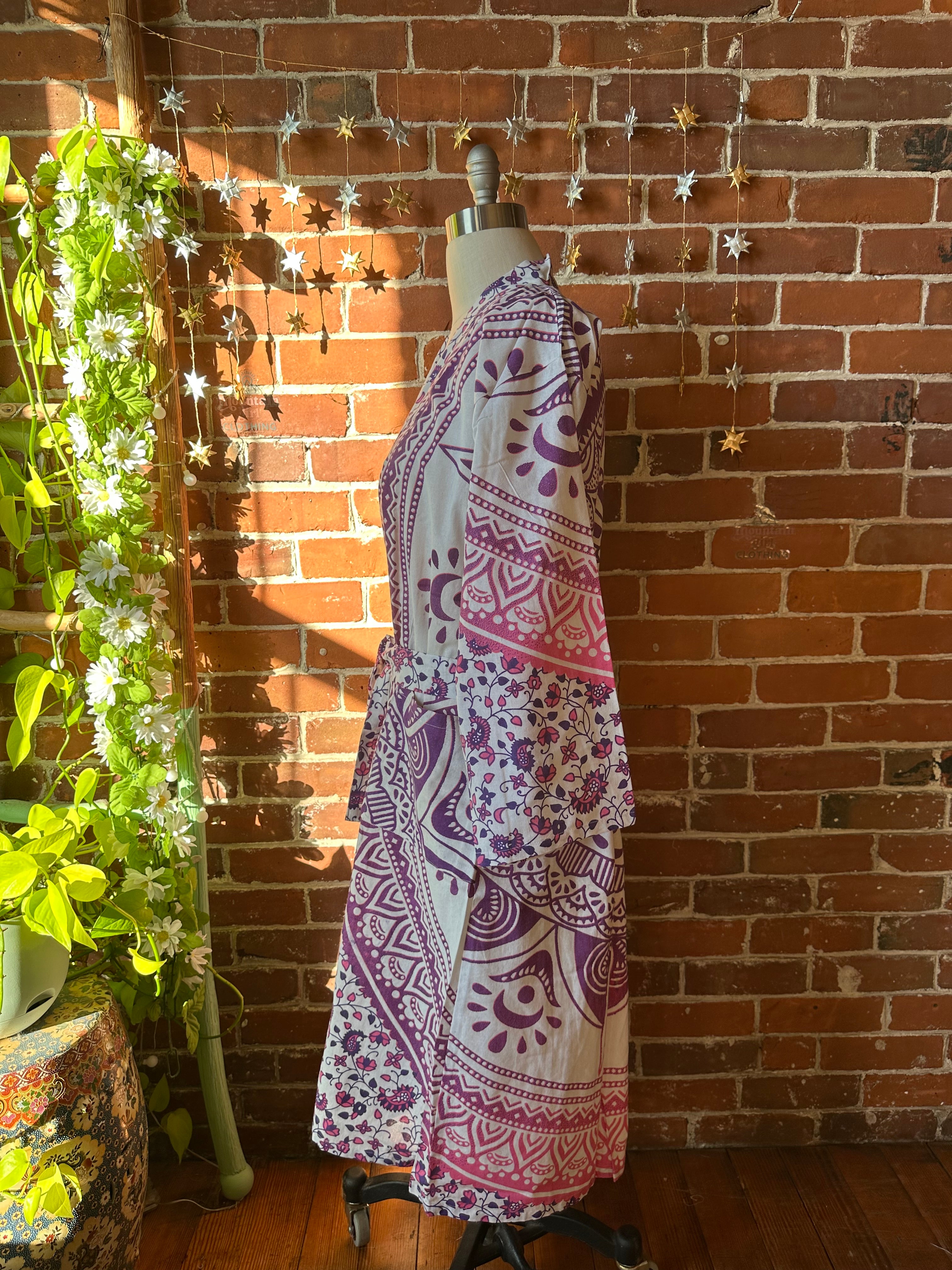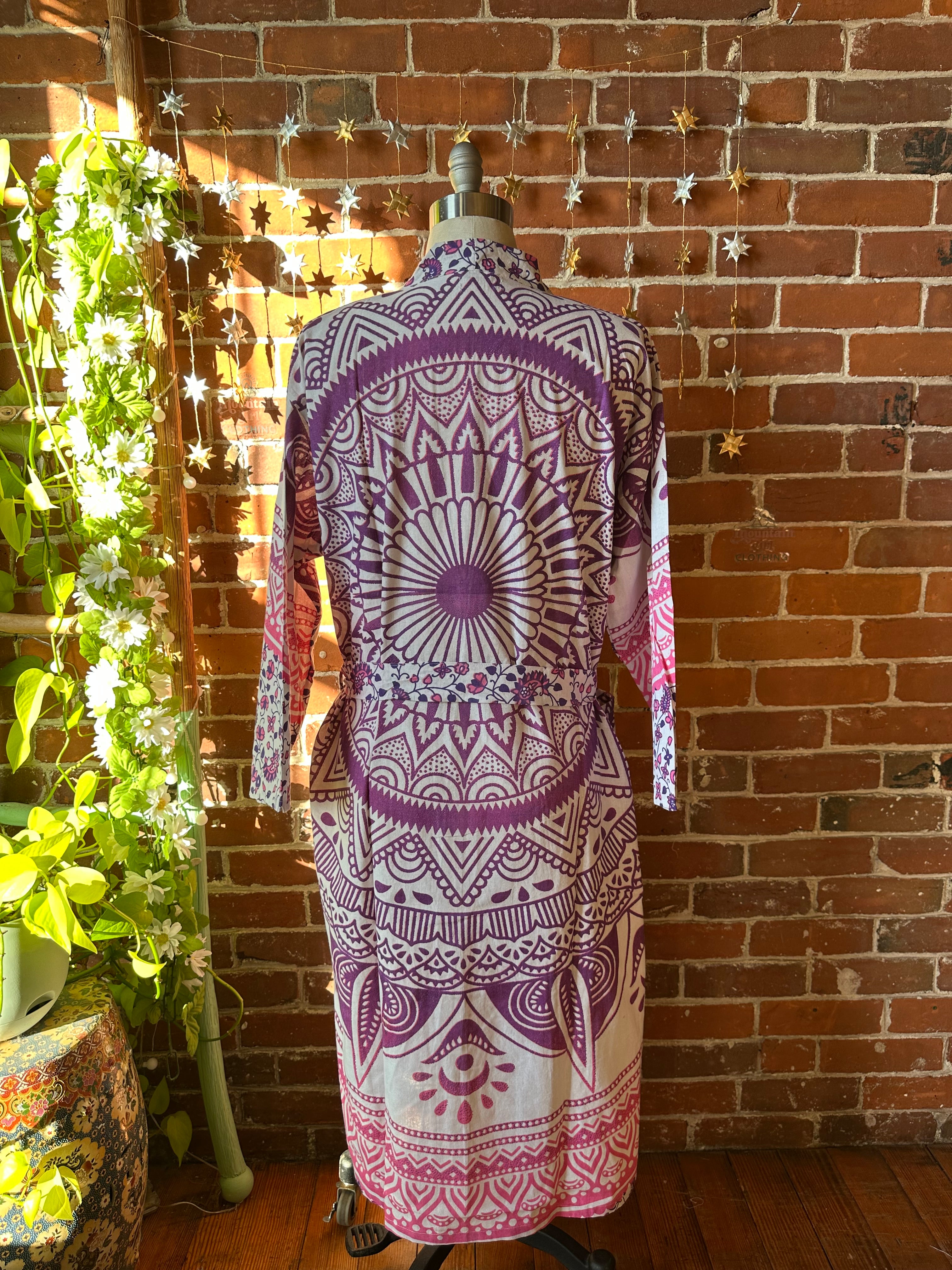 tapestry cotton kimono robe with pockets and sleeves, pockets in the front, belt loops with a belt included