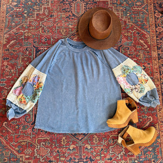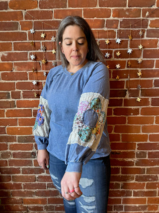 Flower Power Patchwork Floral Mineralwash Sweatshirt - Blue