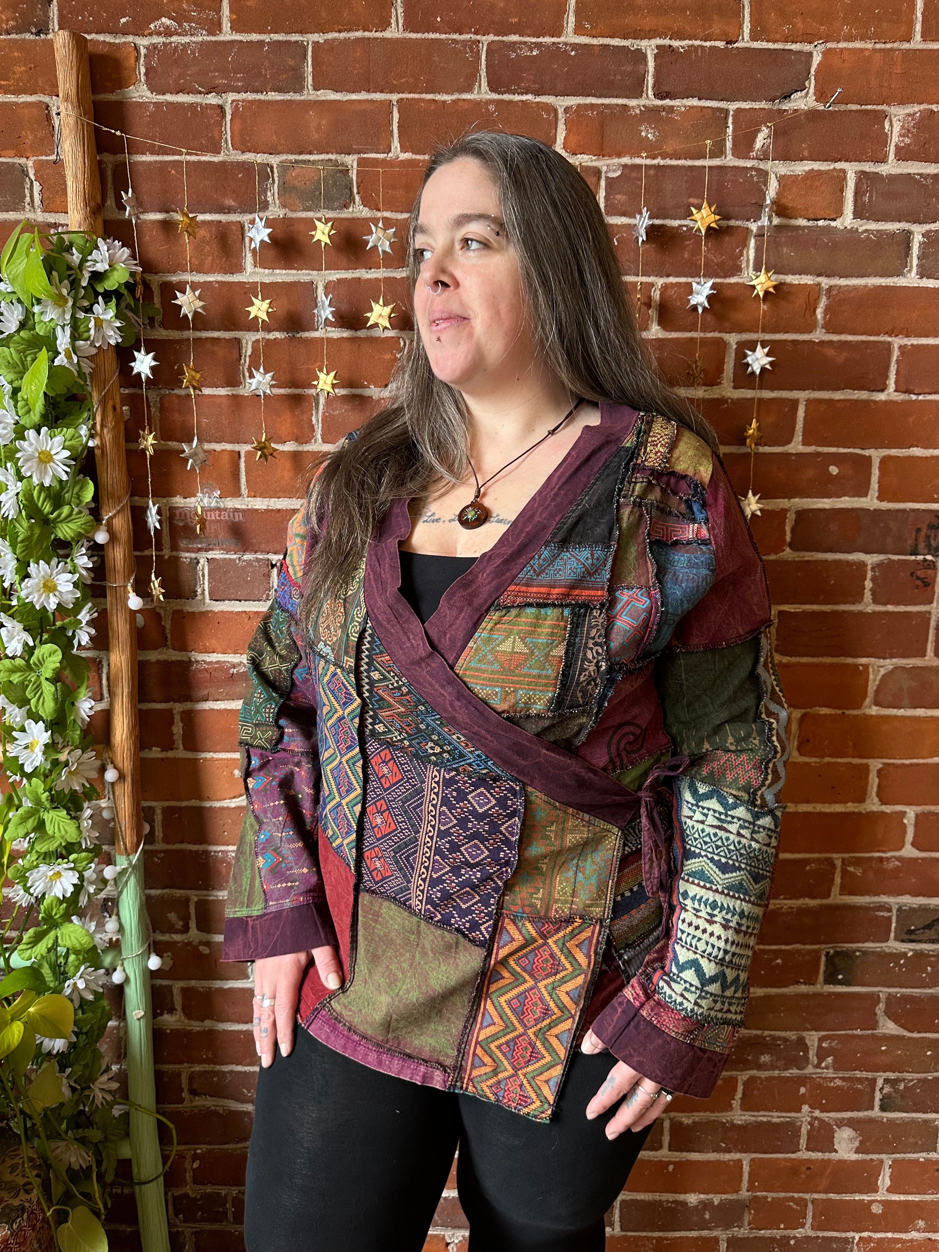 A one-of-a-kind wrap jacket made from beautifully mixed 100% cotton reclaimed textiles in rich earth and jewel tones. Featuring an easy, relaxed fit with long sleeves and a wrap style front, it’s the perfect statement layer for everyday bohemian styling.